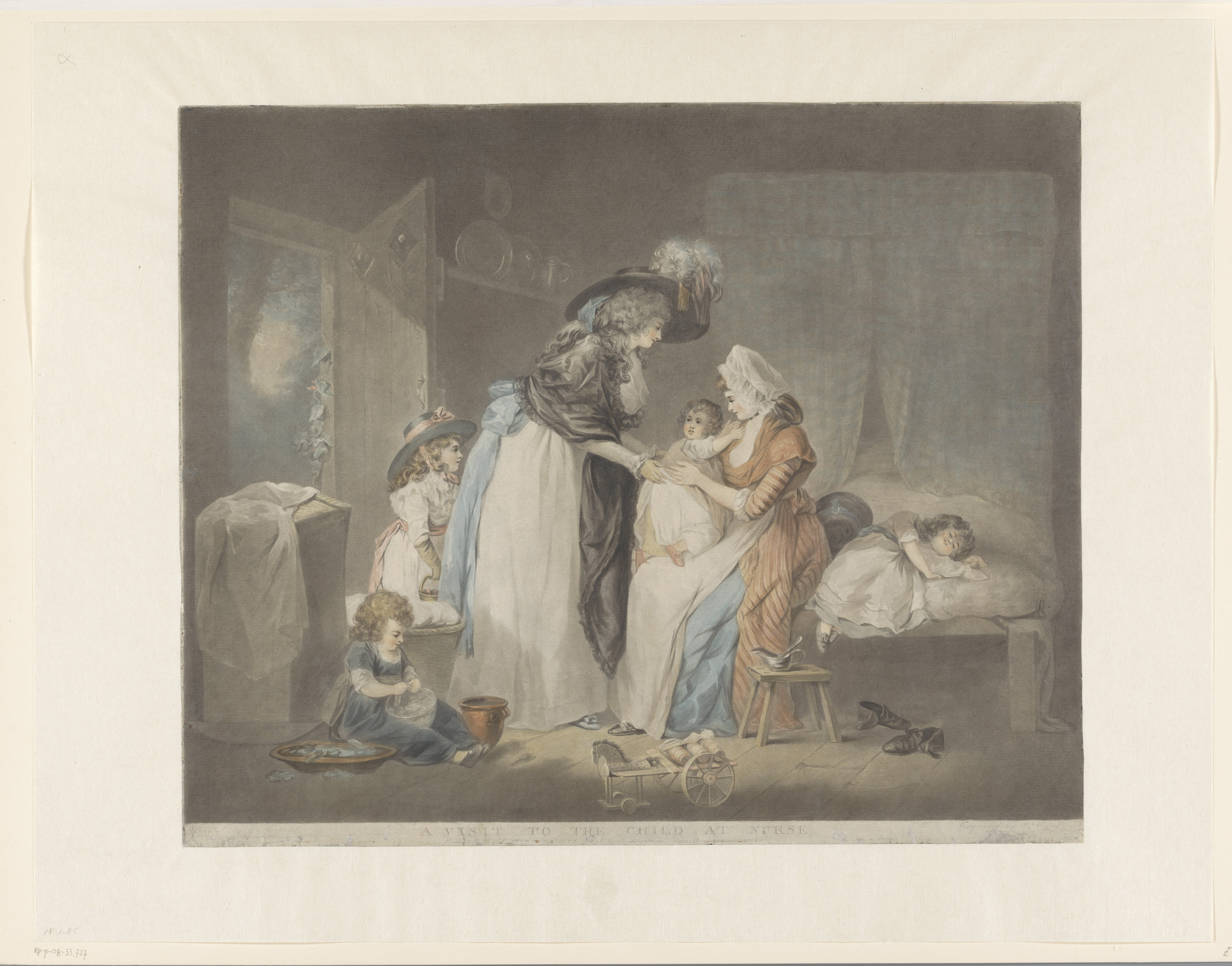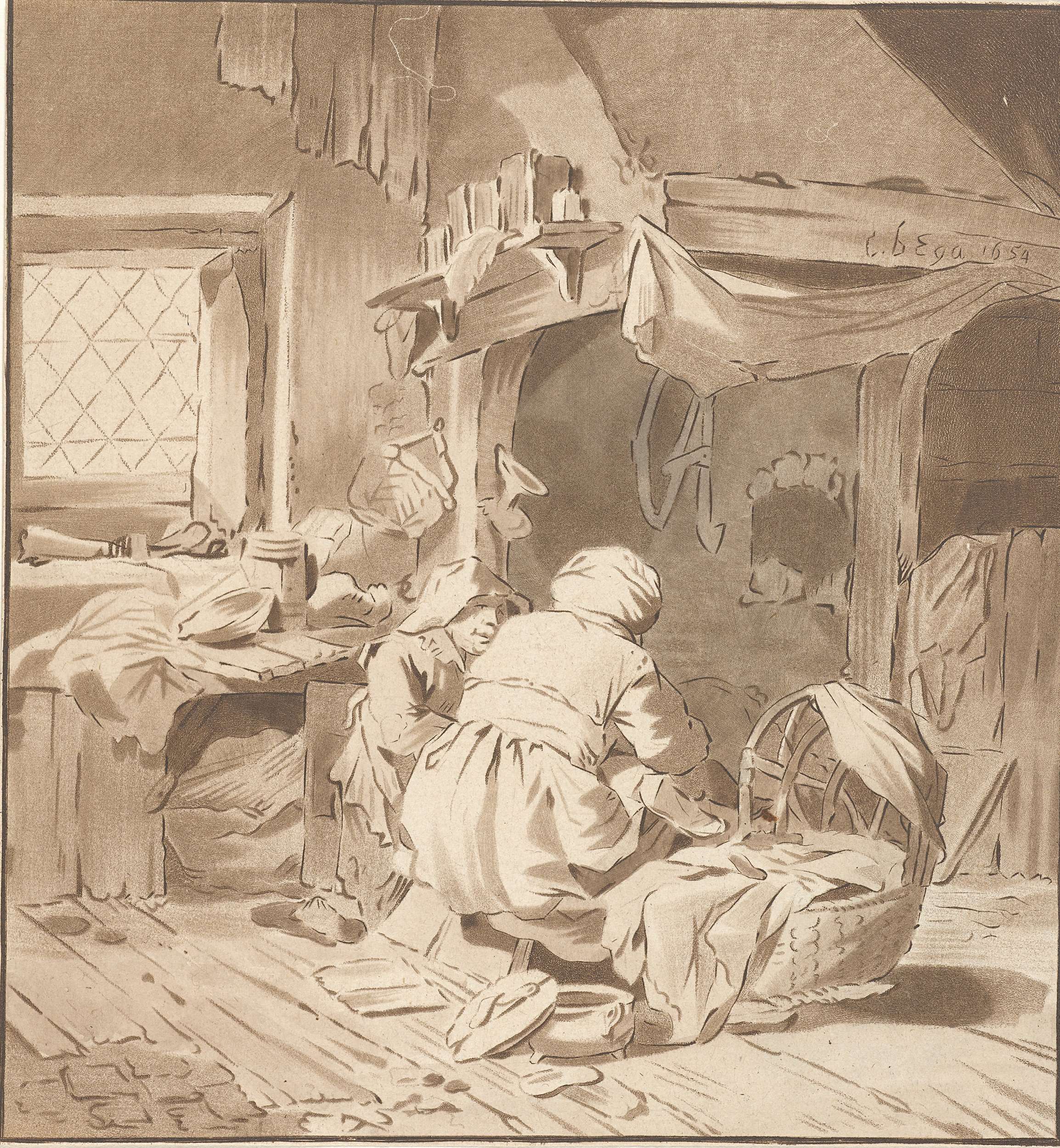 Interieur met vrouw bij wieg