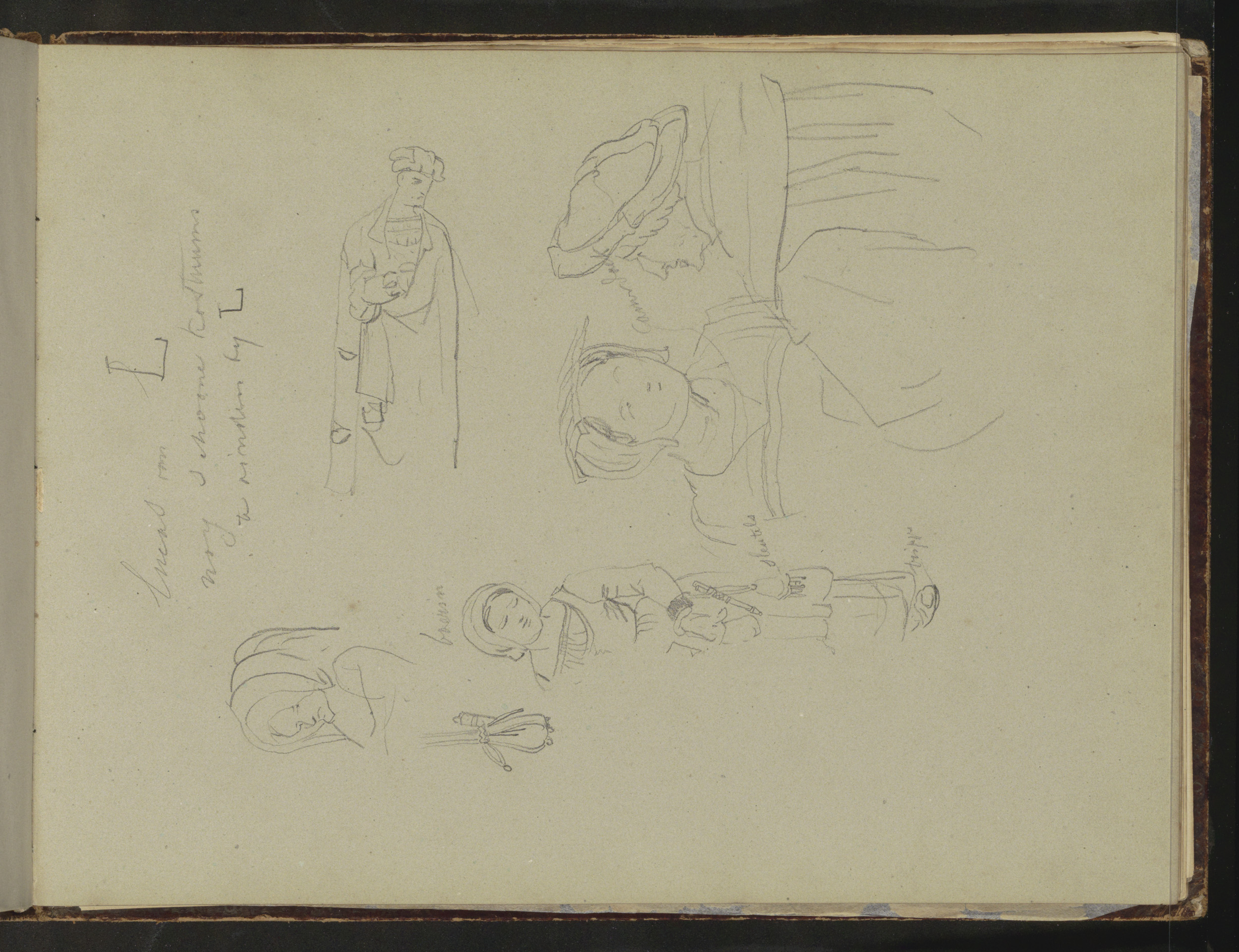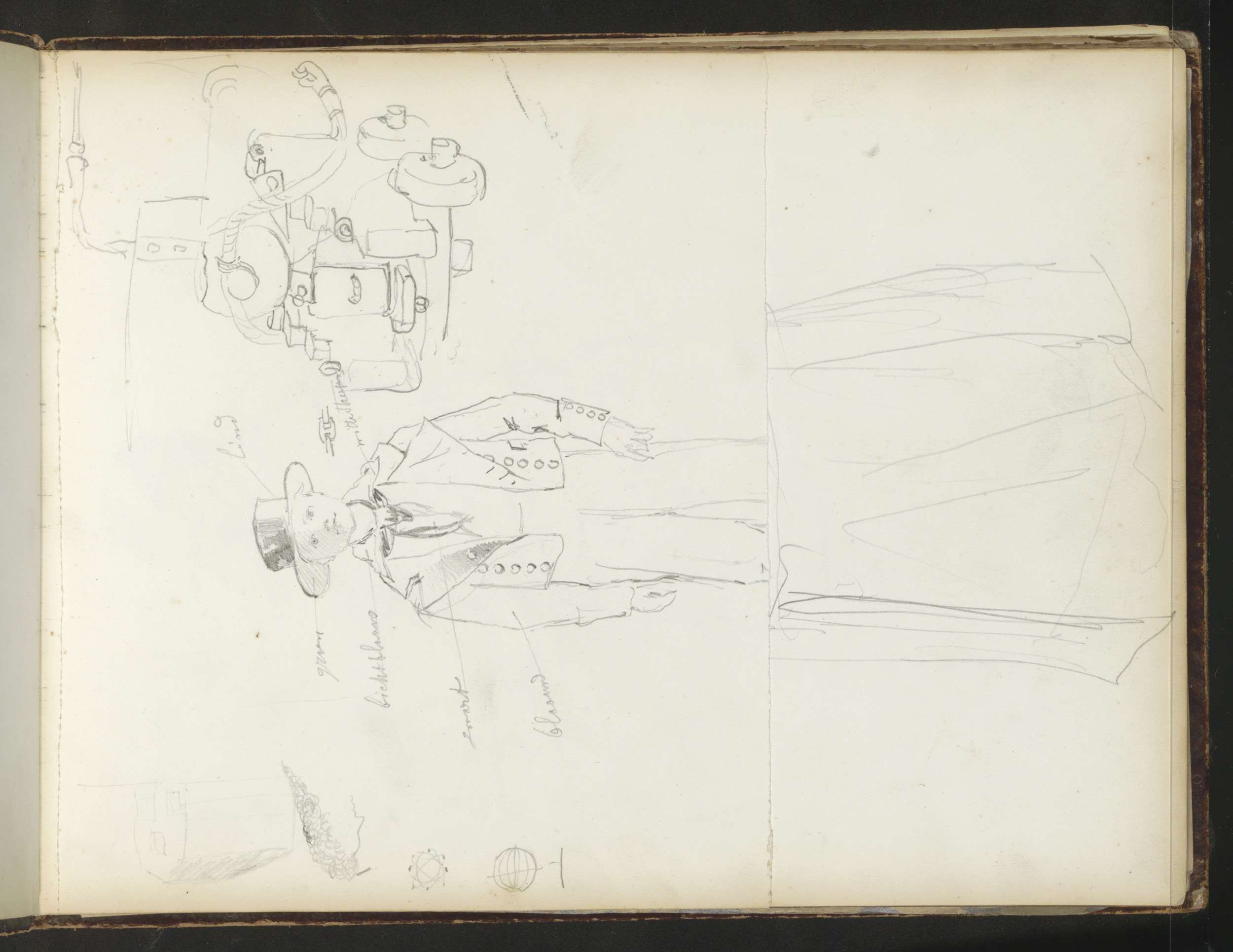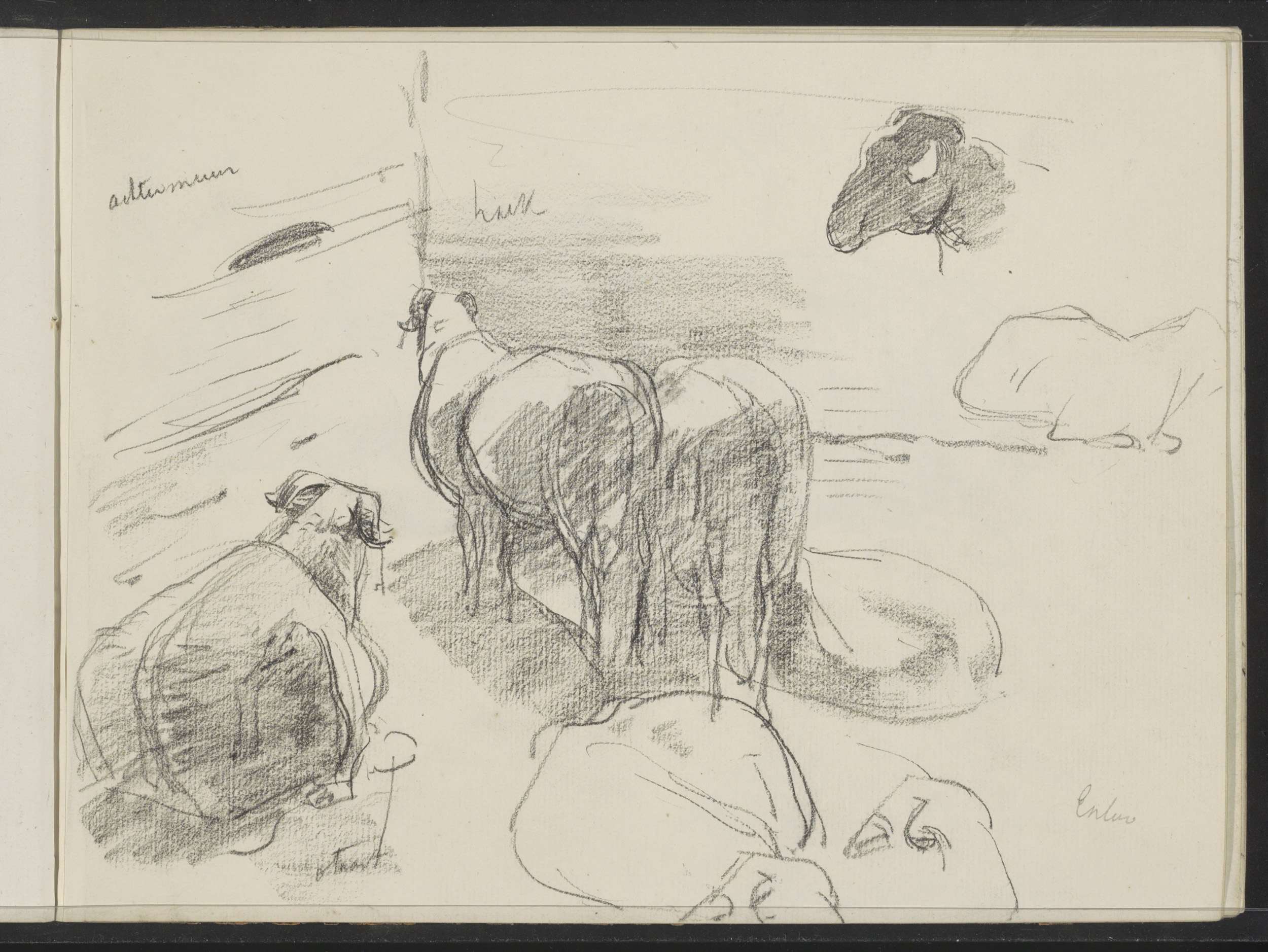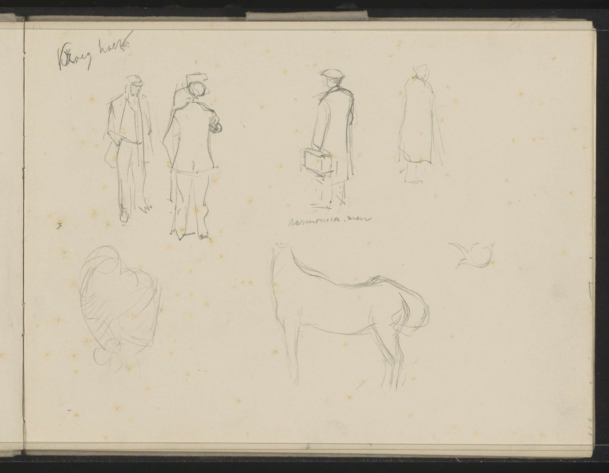 Paard, een staande figuur in een mantel en koppen