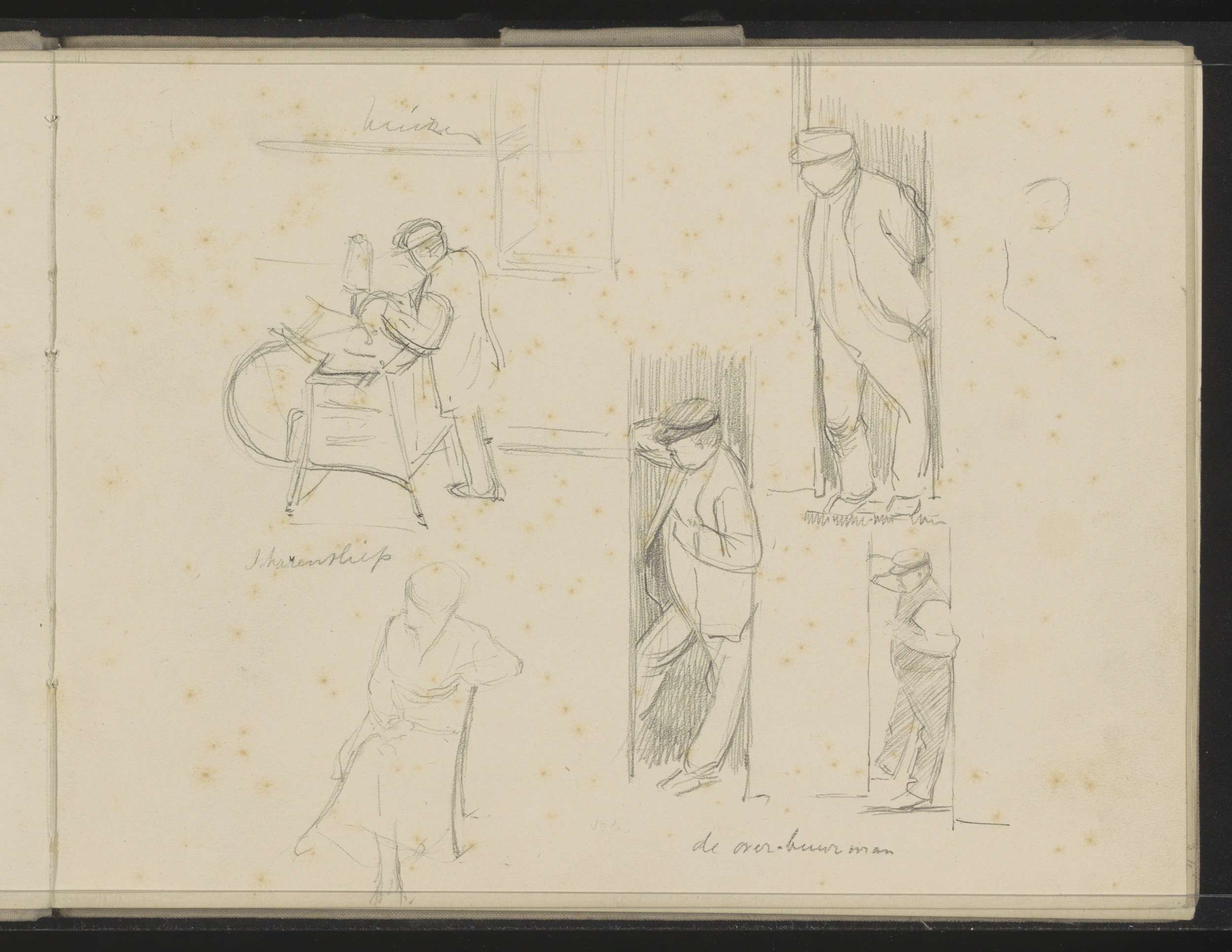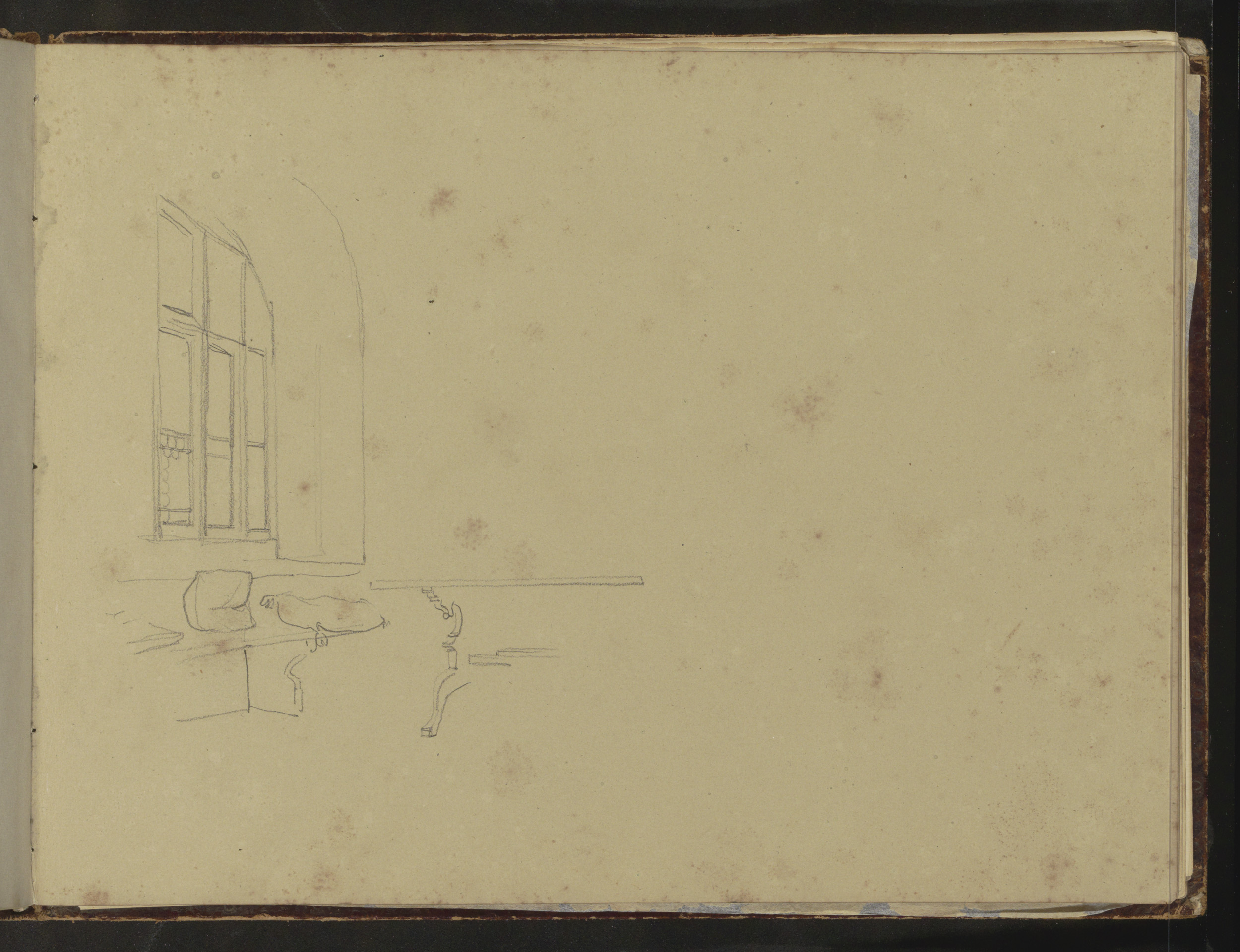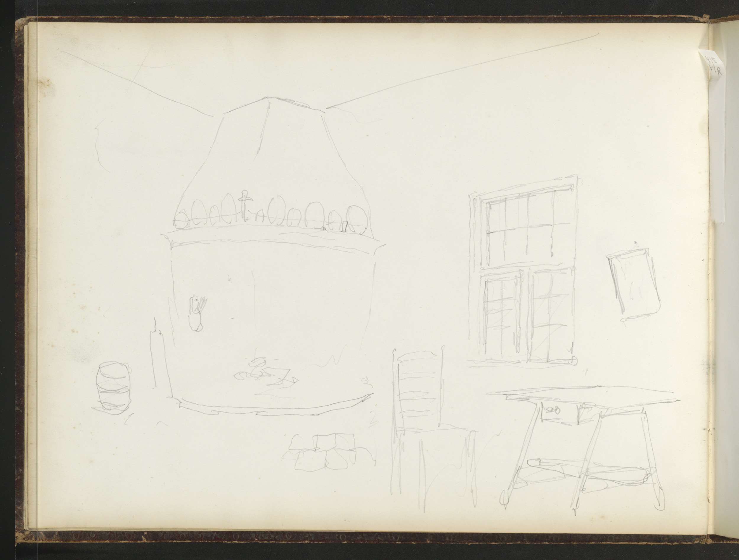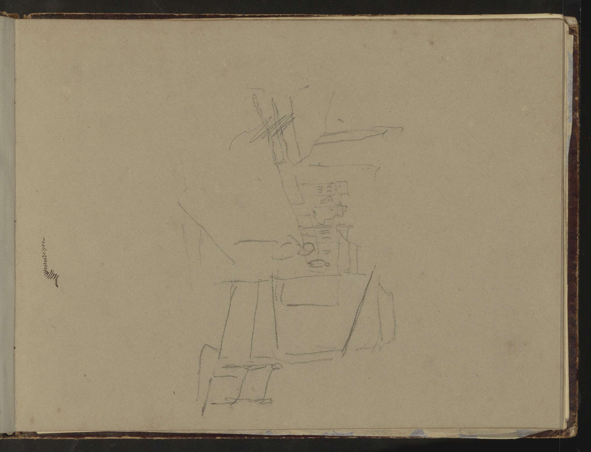 Studieblad, onder andere met een tekentafel, stoel e...