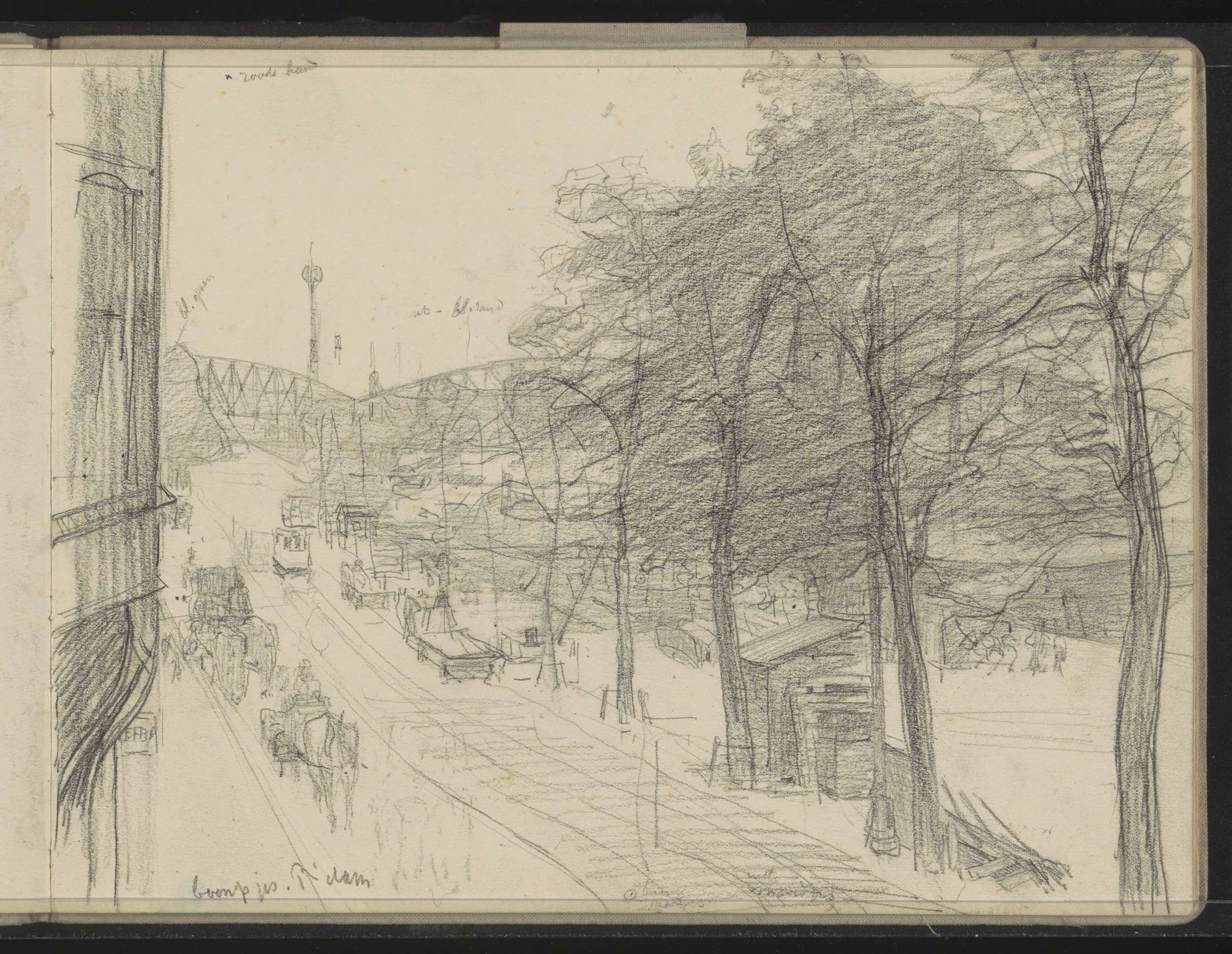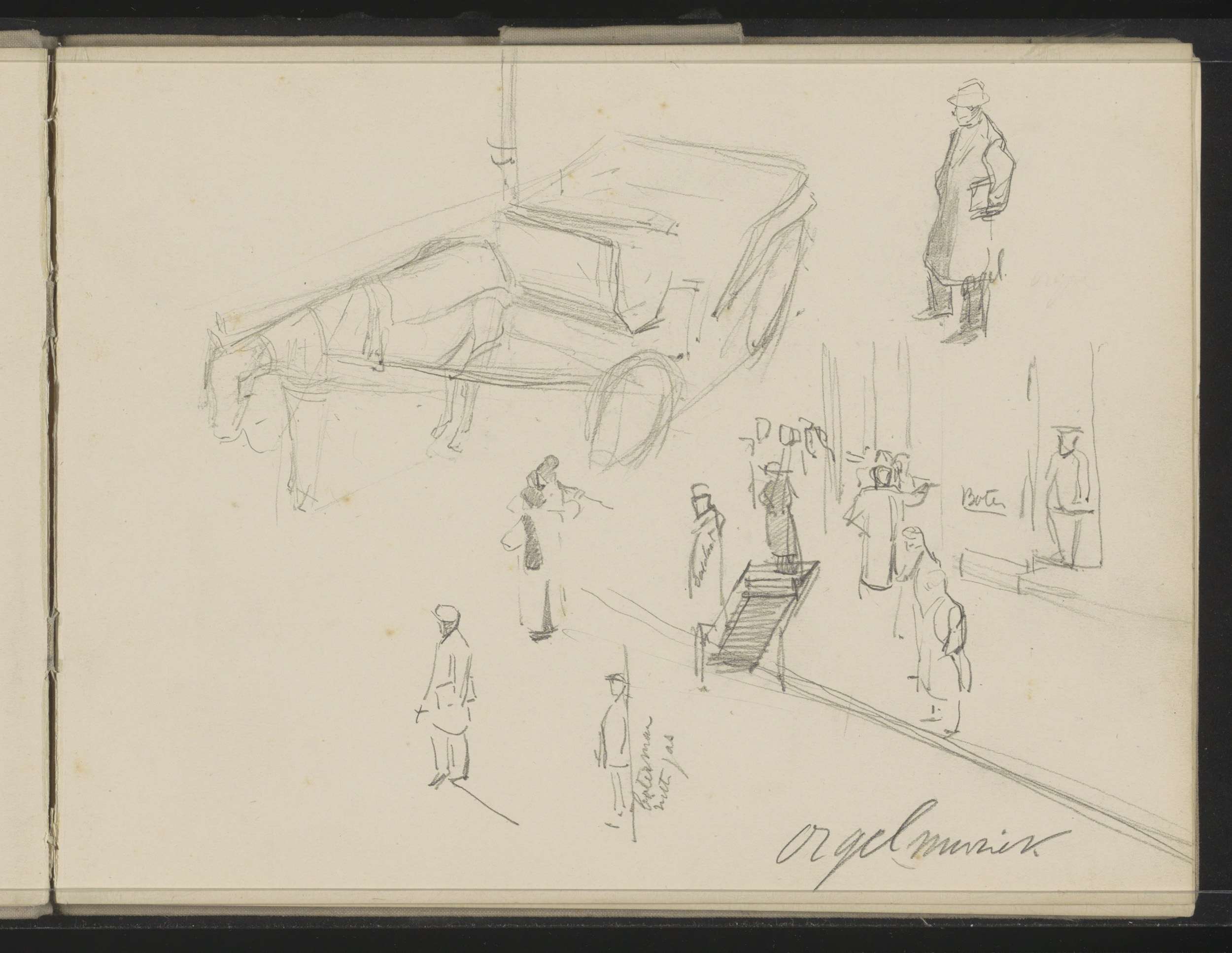 Paardenkoets en een straat met figuren