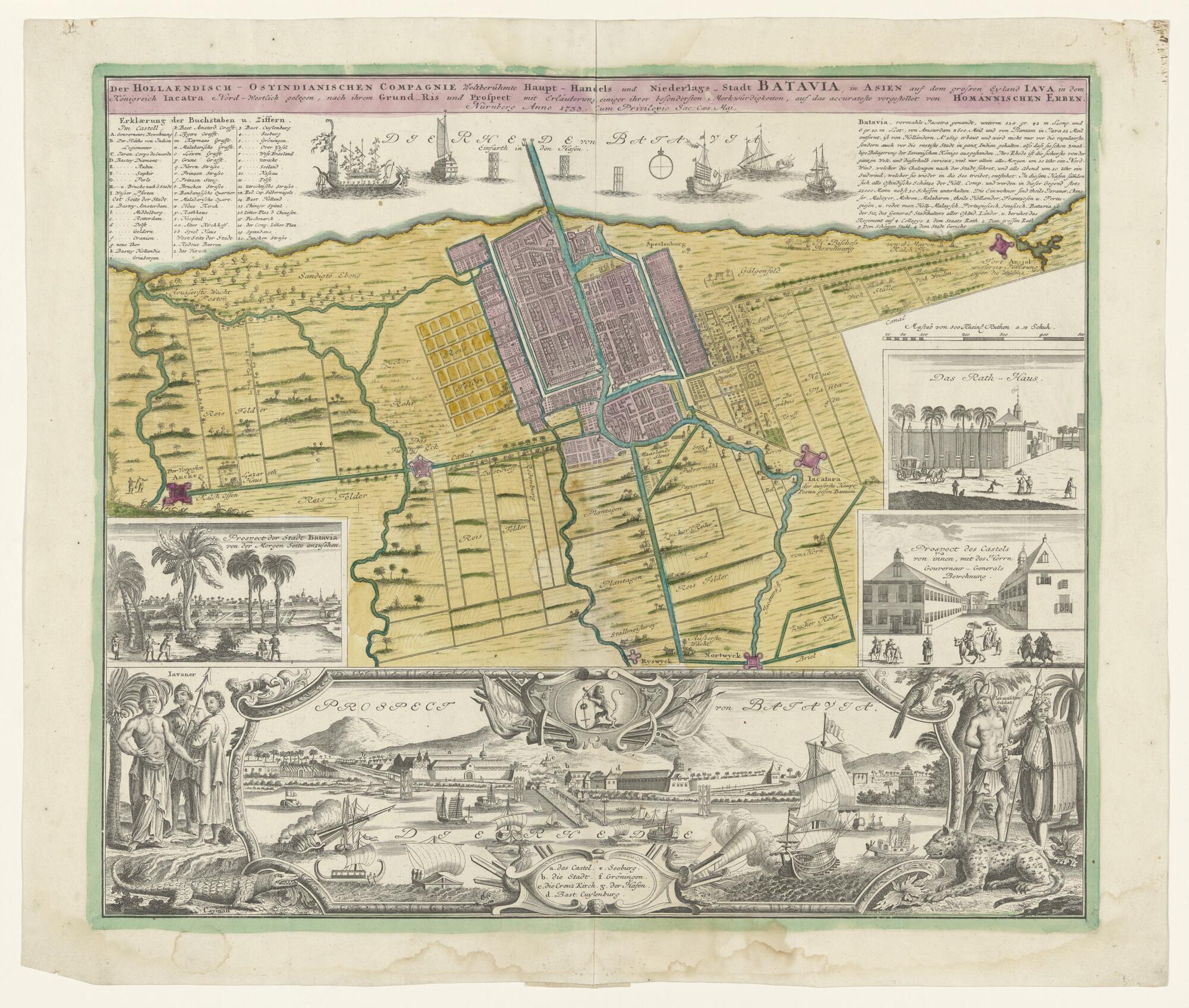 Met de hand gekleurde plattegrond en aanzichten van ...