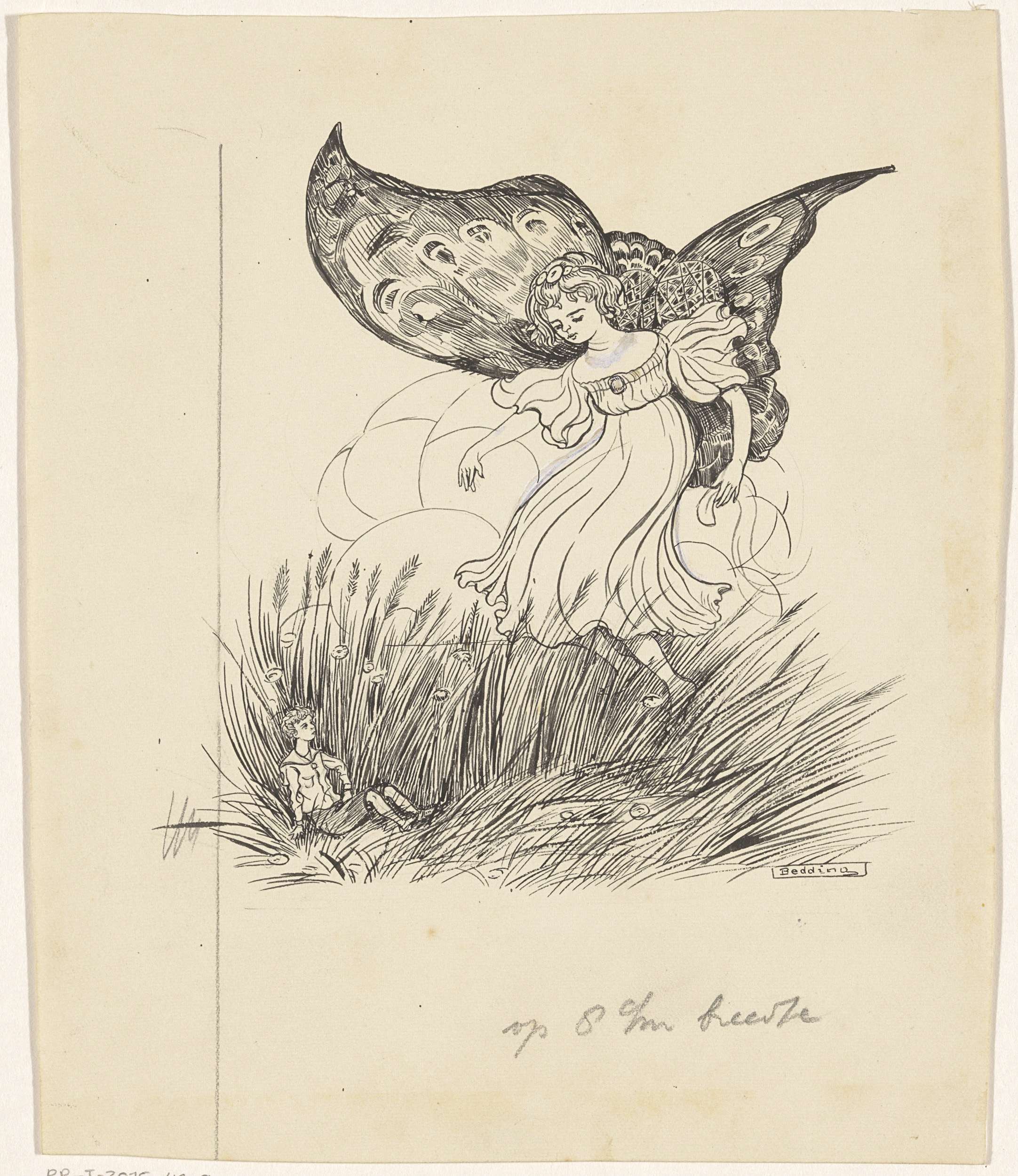 Gevleugeld meisje bezoekt een jongen in een korenveld