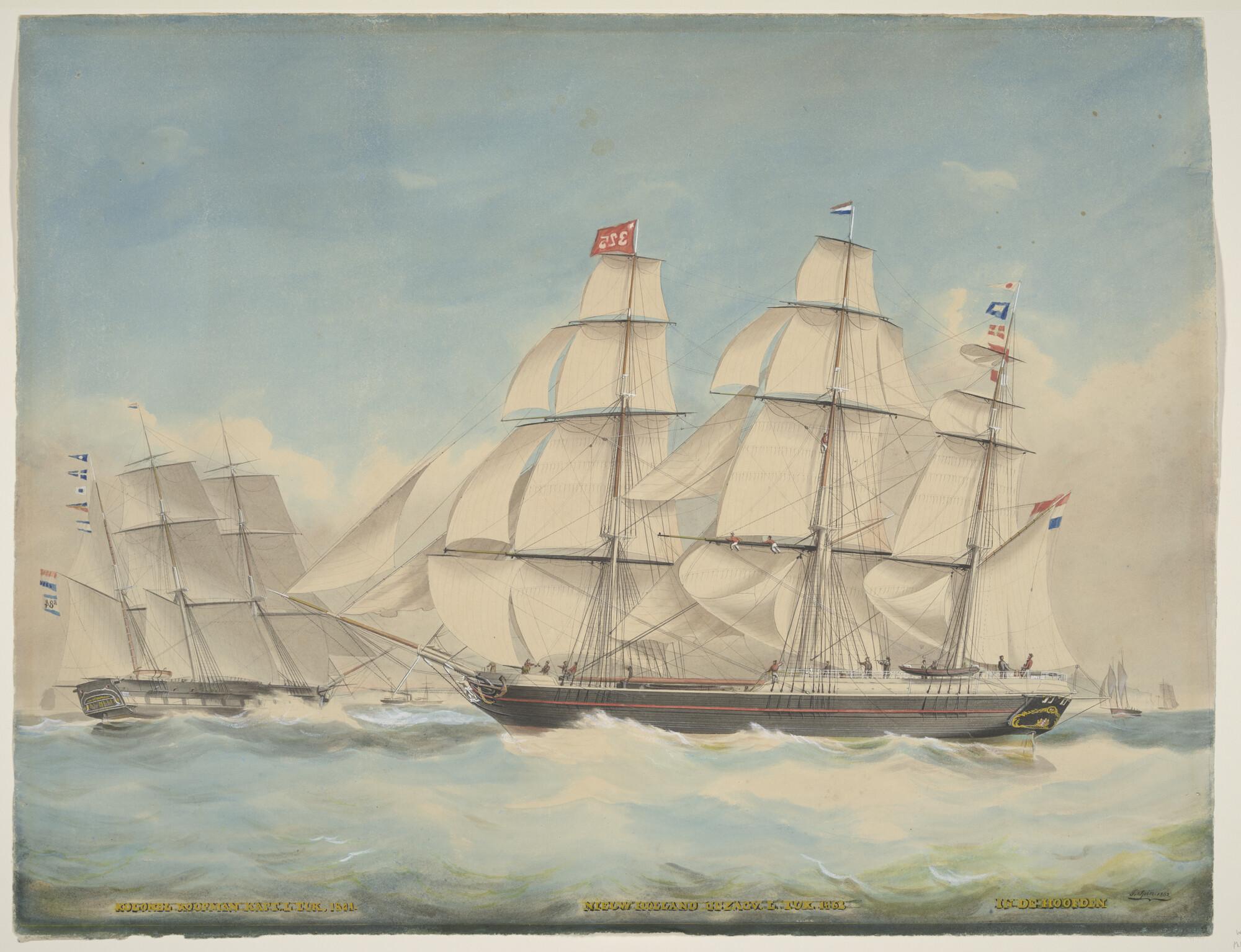 Het fregatschip Nieuw Holland en het barkschip Kolon...