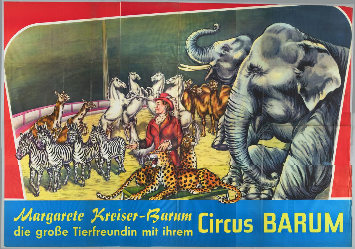 Vrouwelijke dompteur met olifanten, kamelen, paarden...