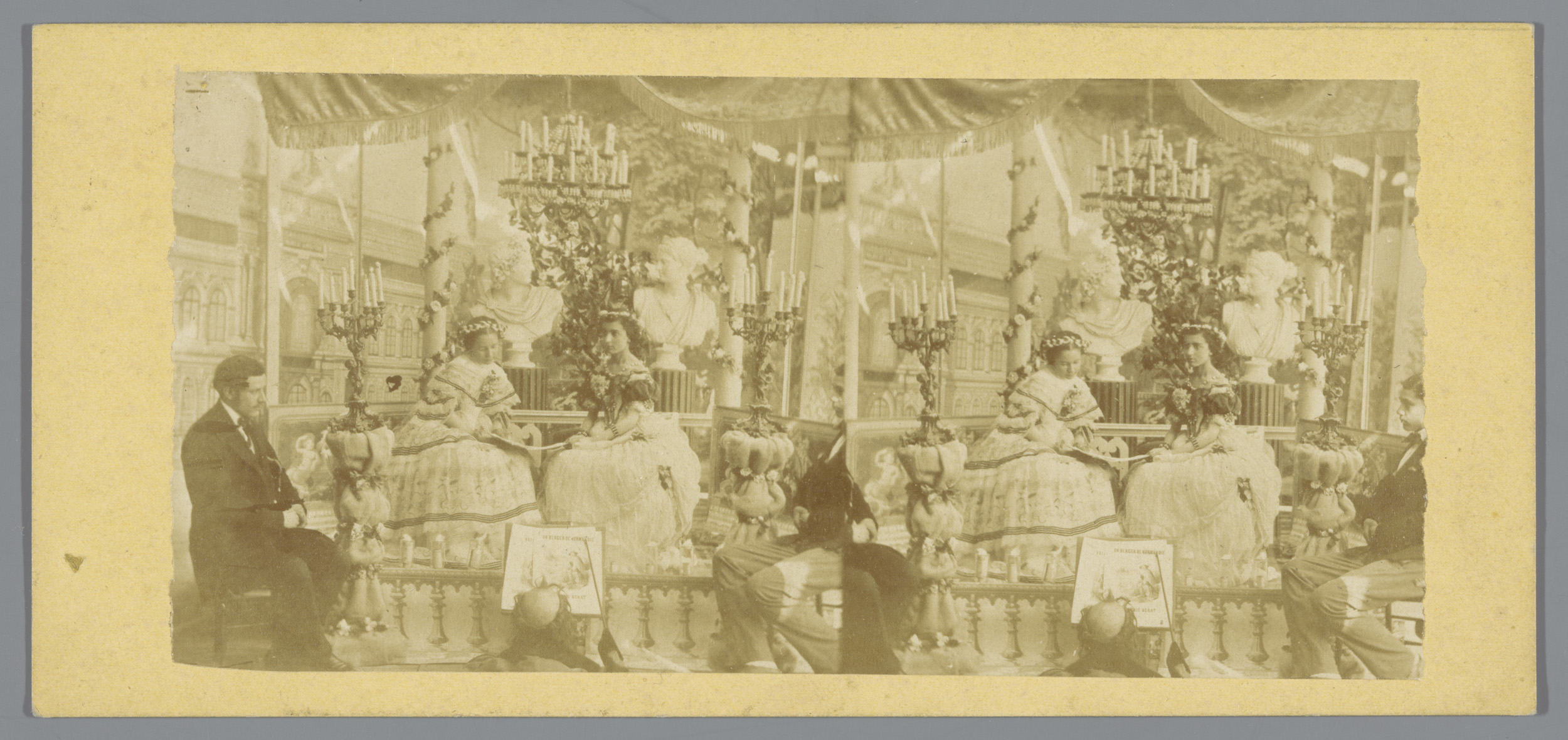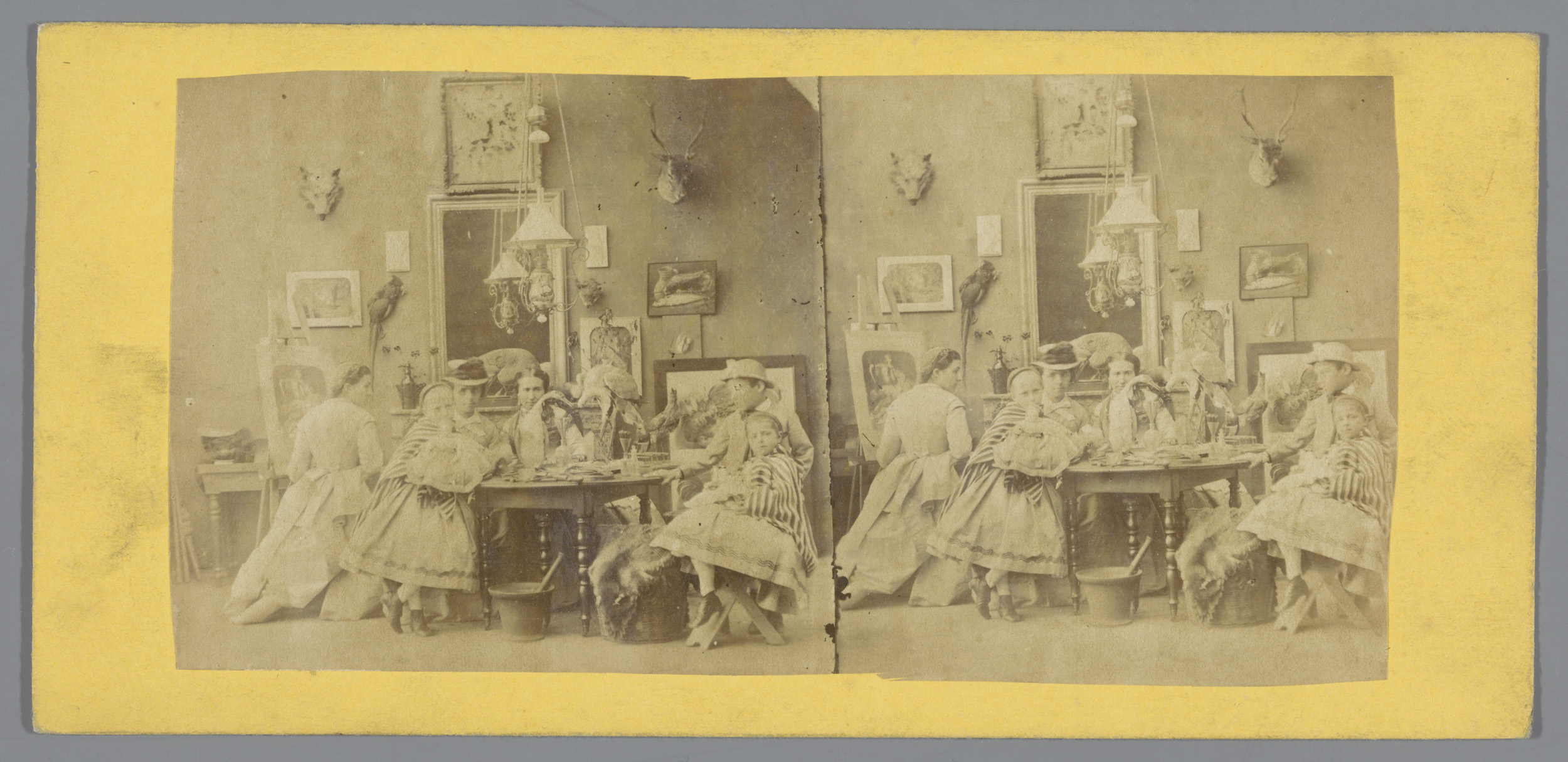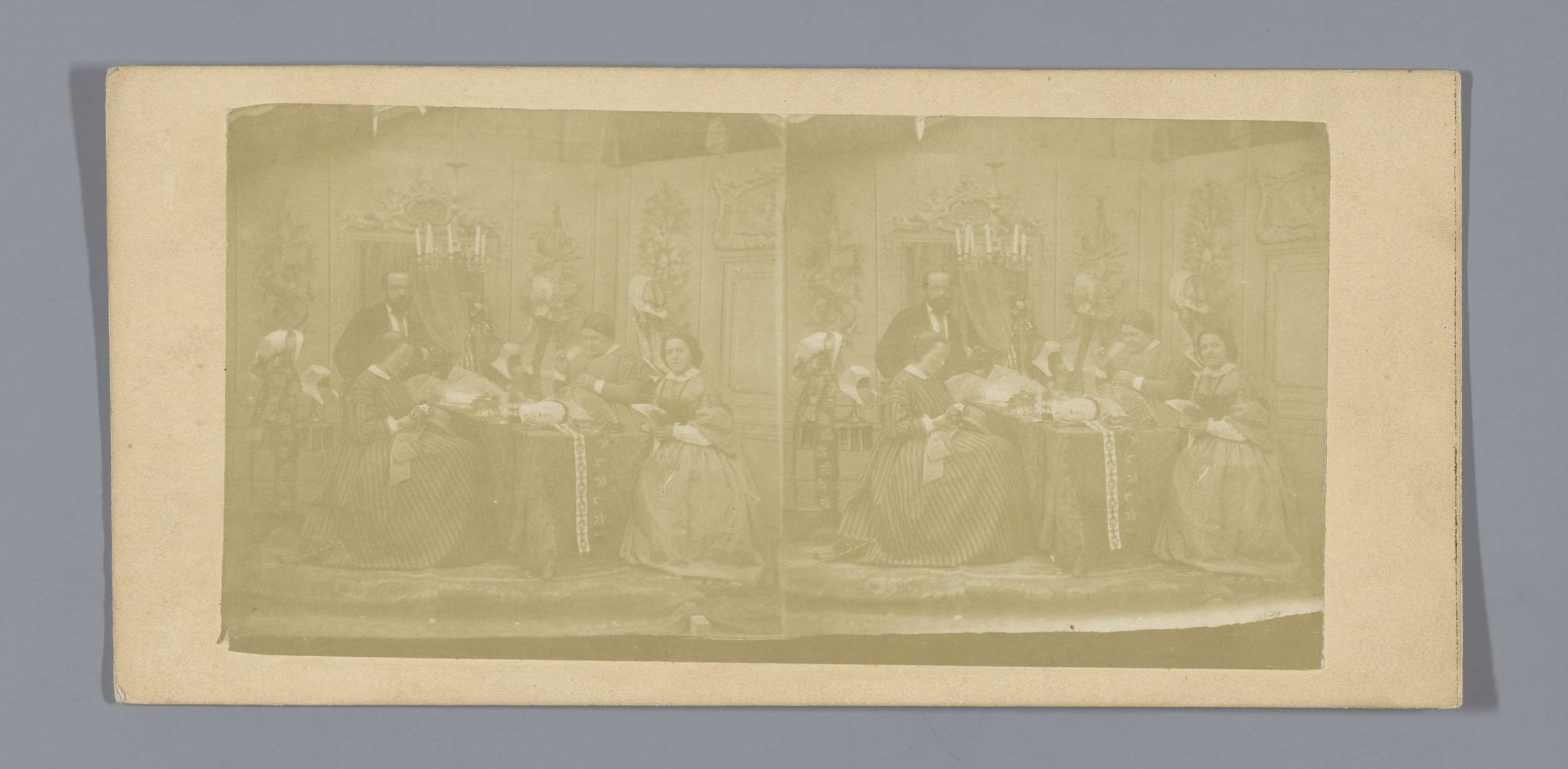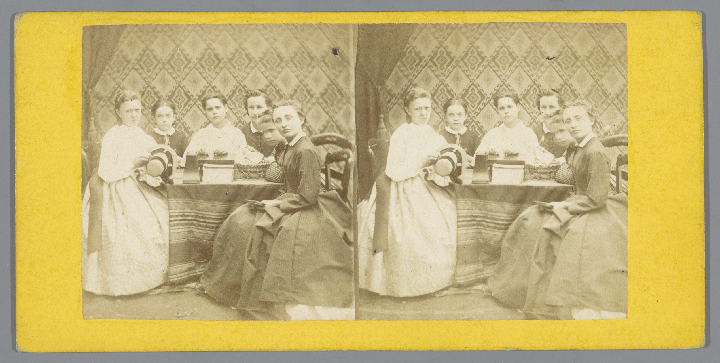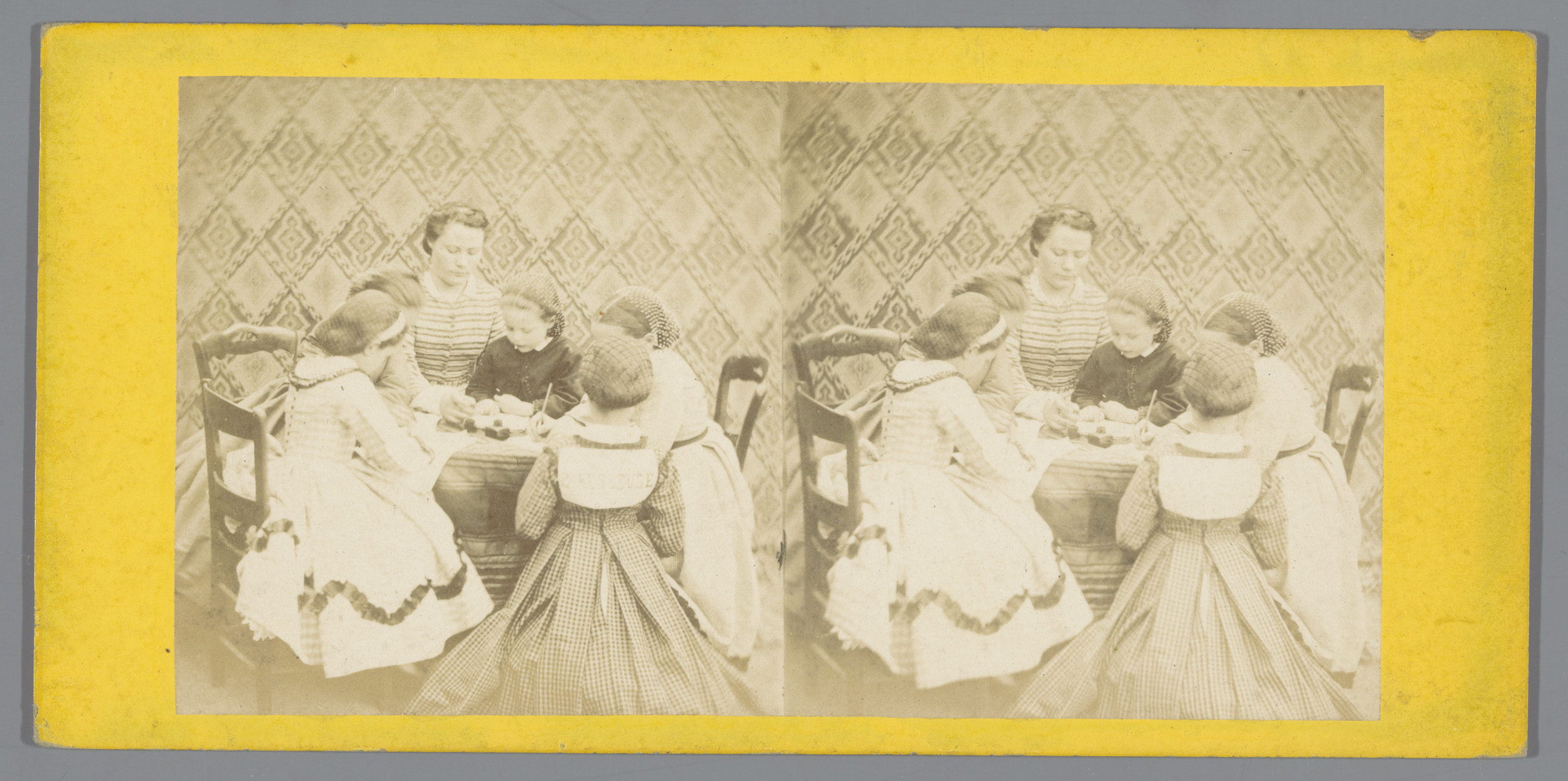 Meisjes rond een tafel waarop mogelijk een stereosco...