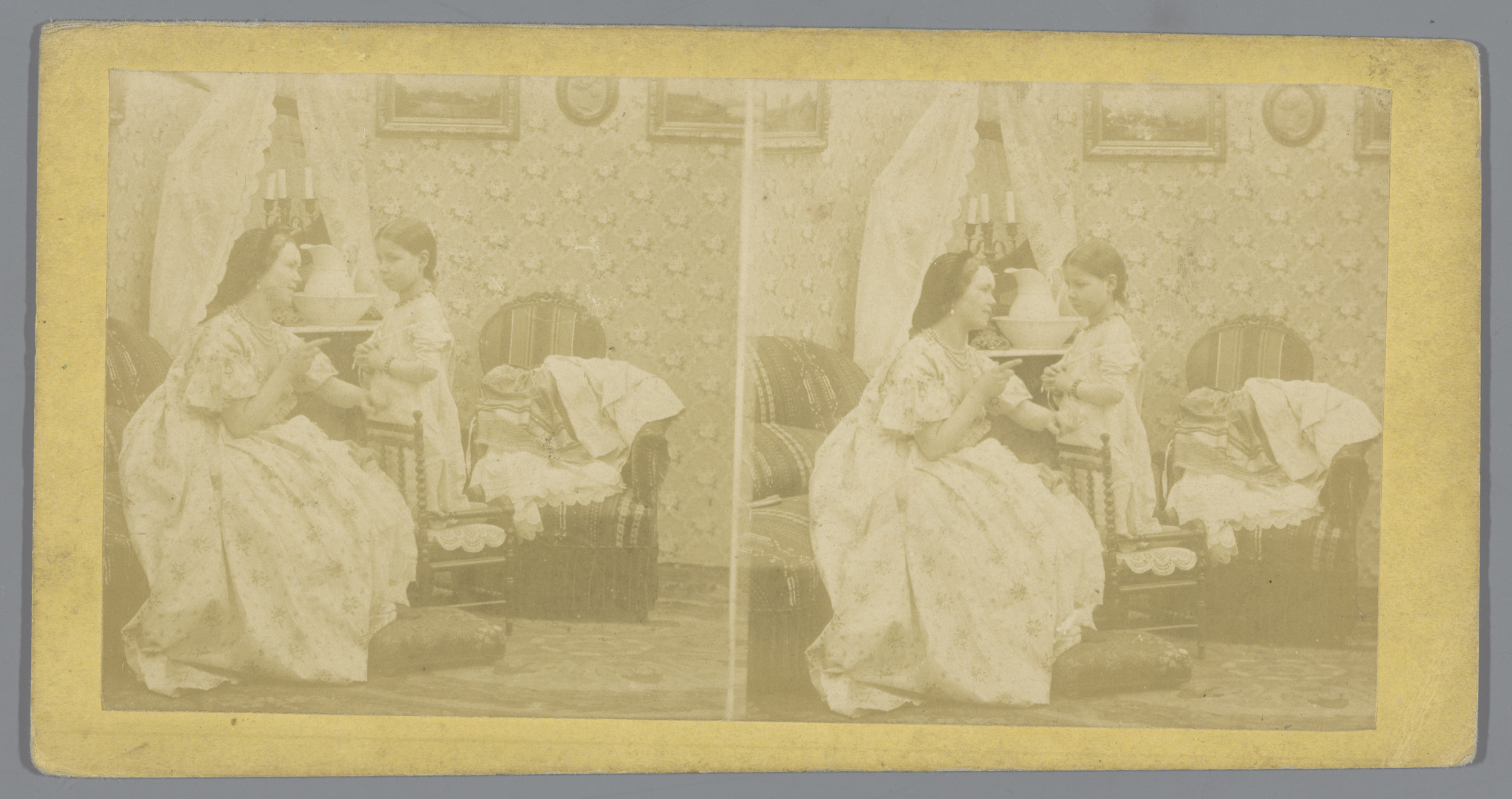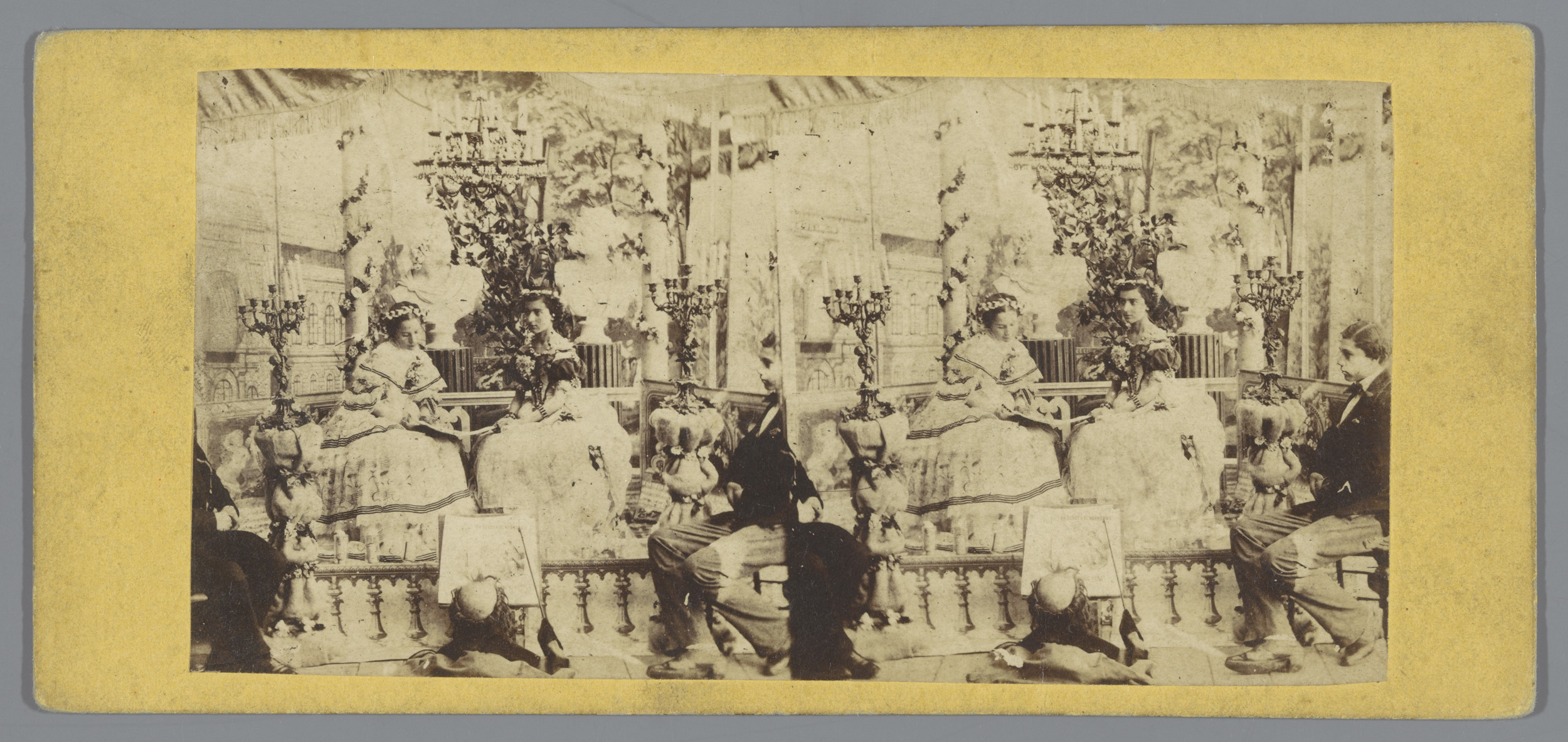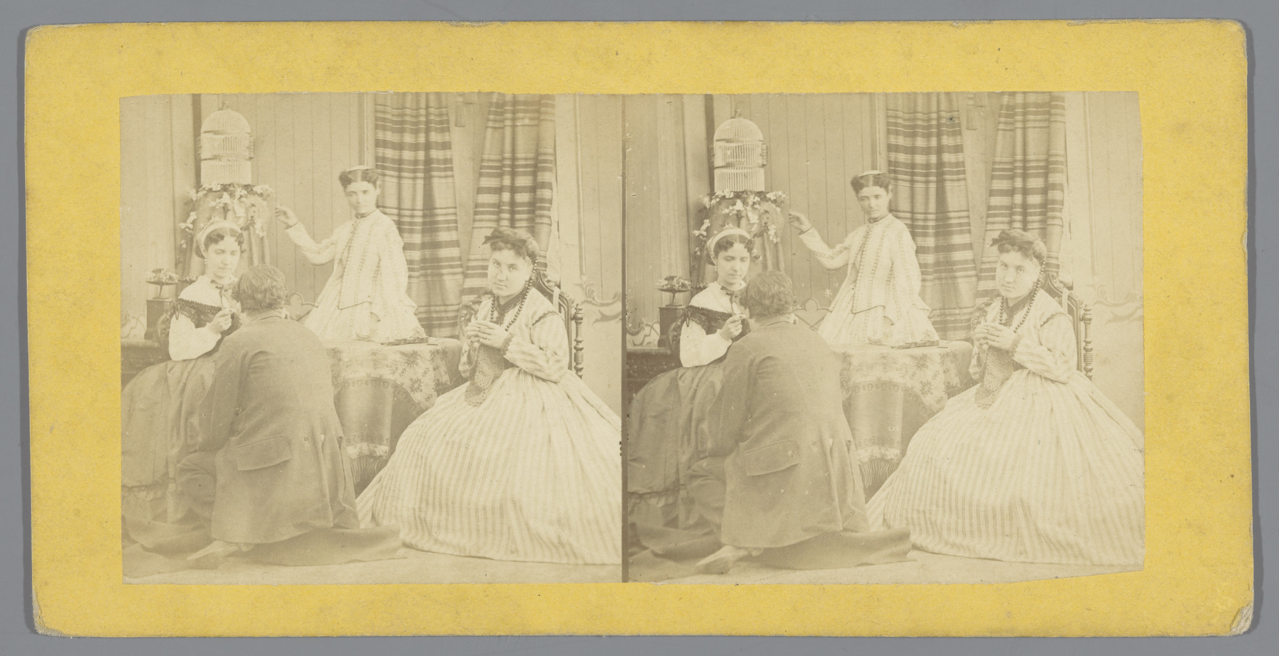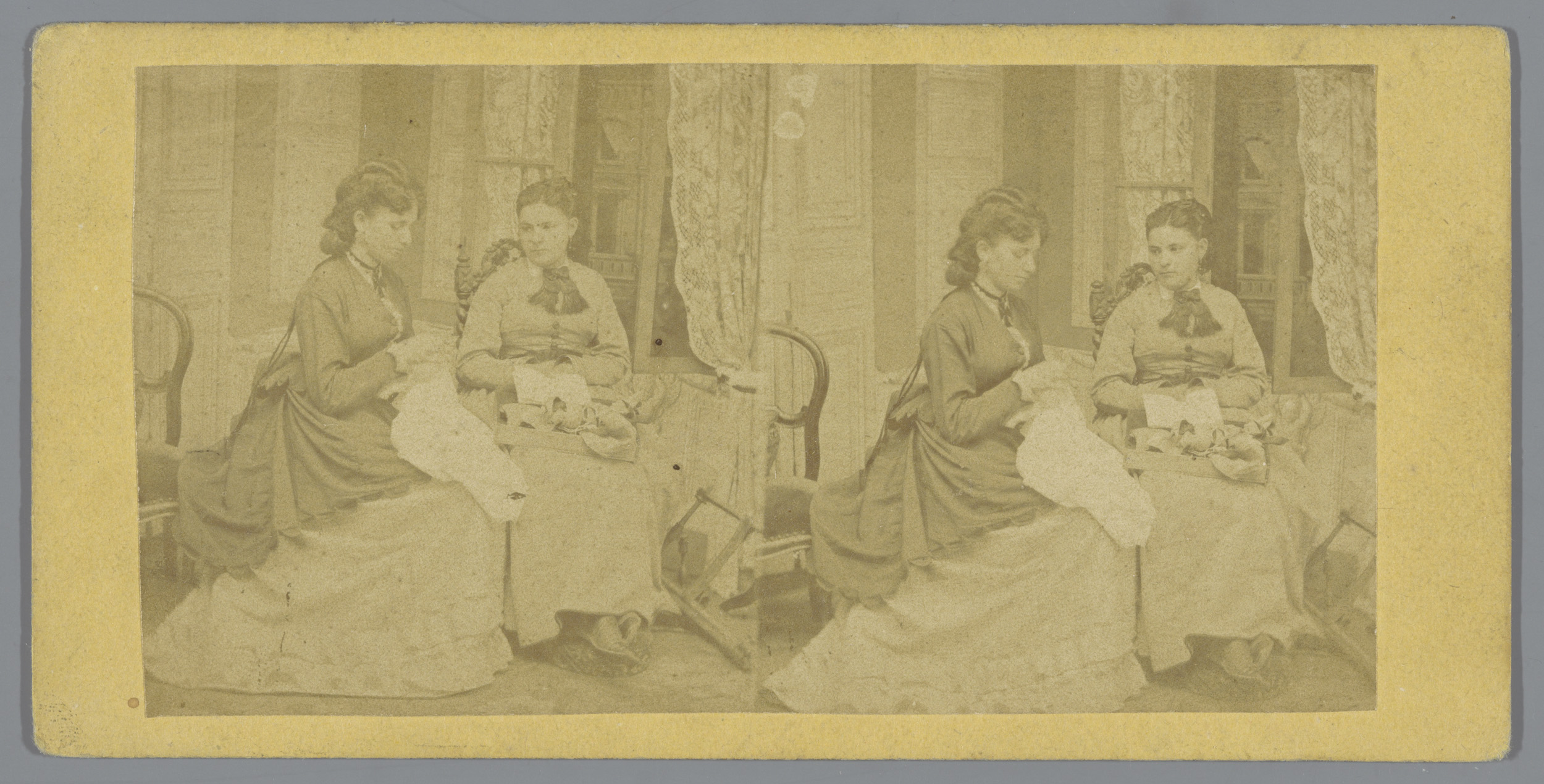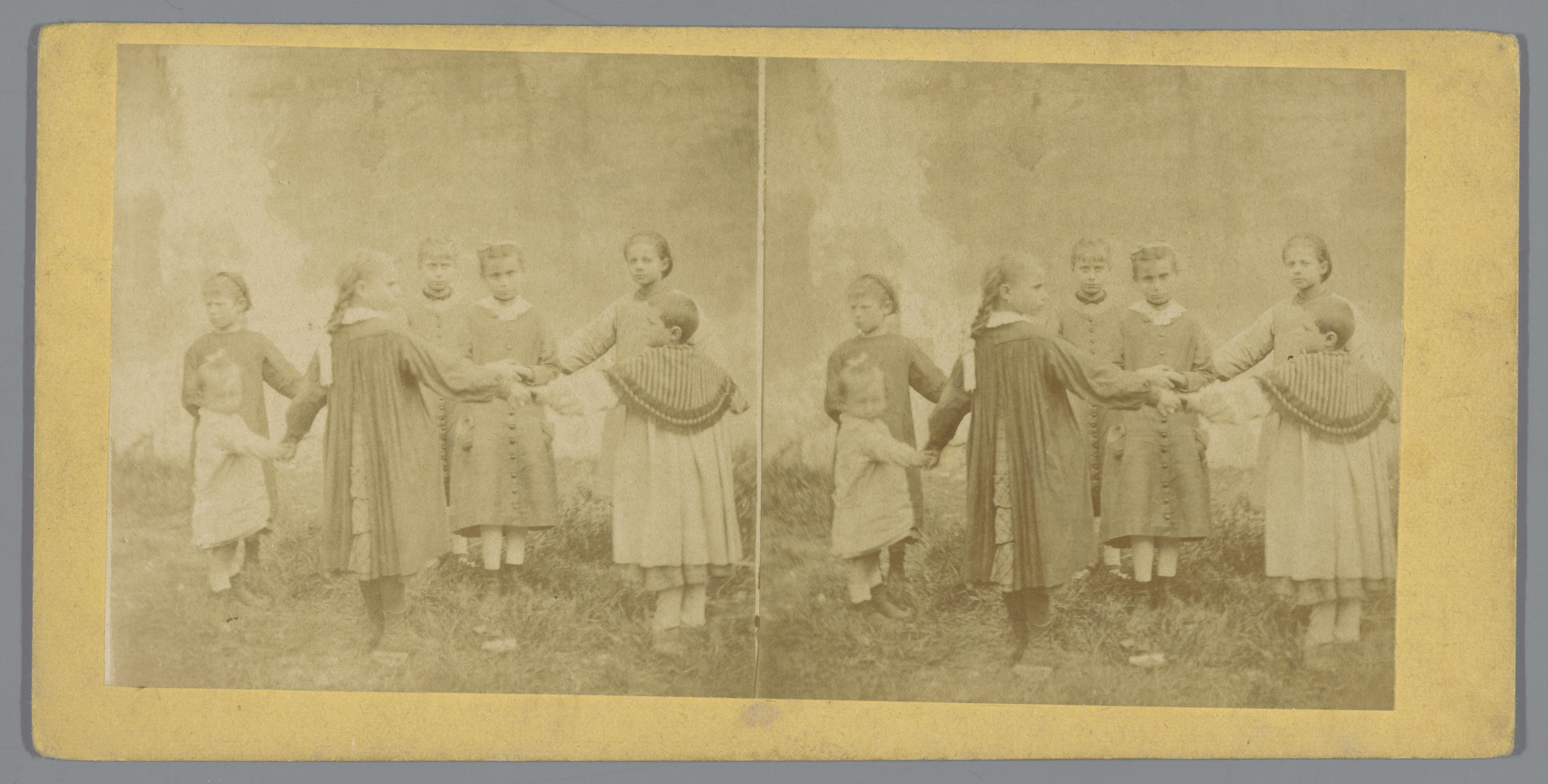 Meisjes rond een tafel waarop mogelijk een stereosco...