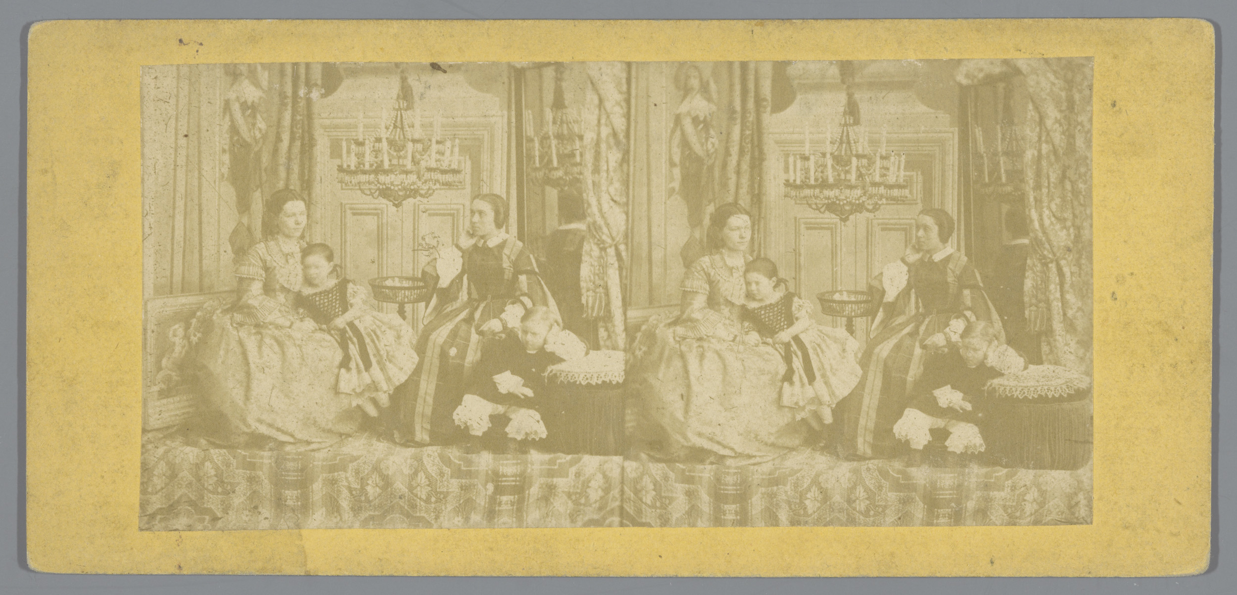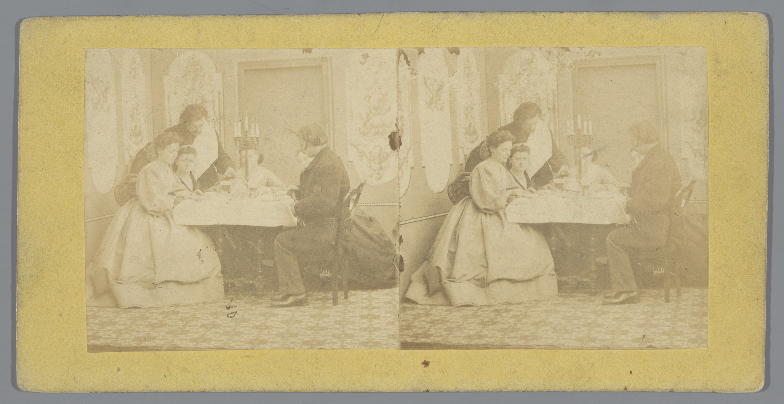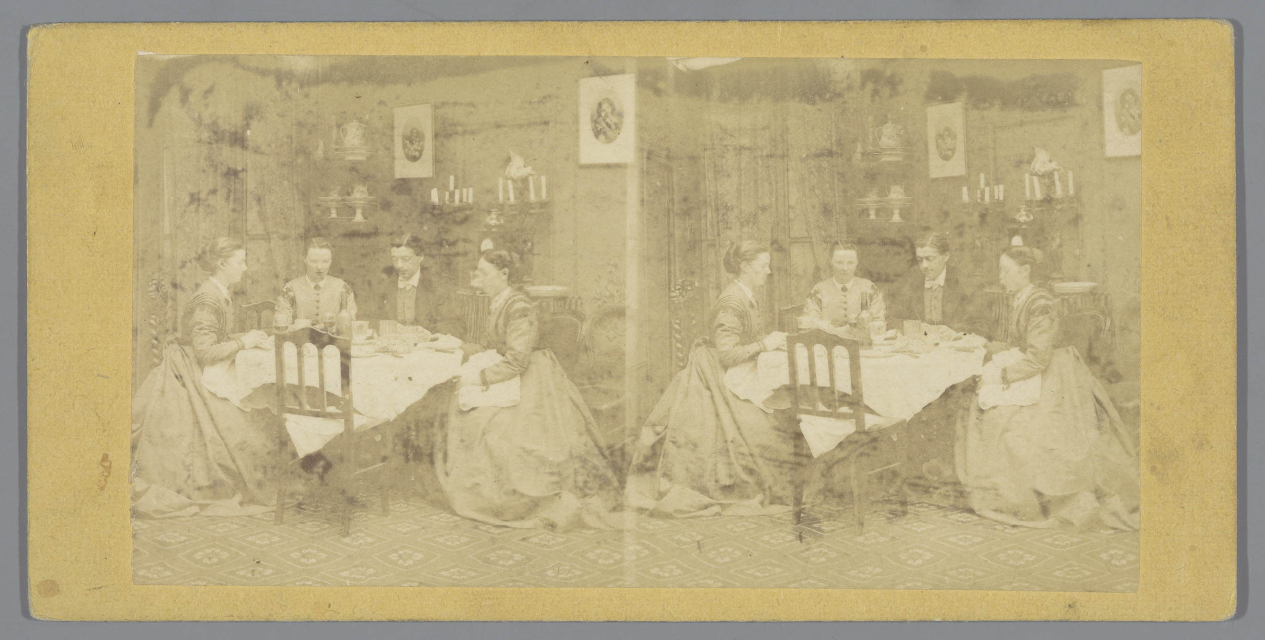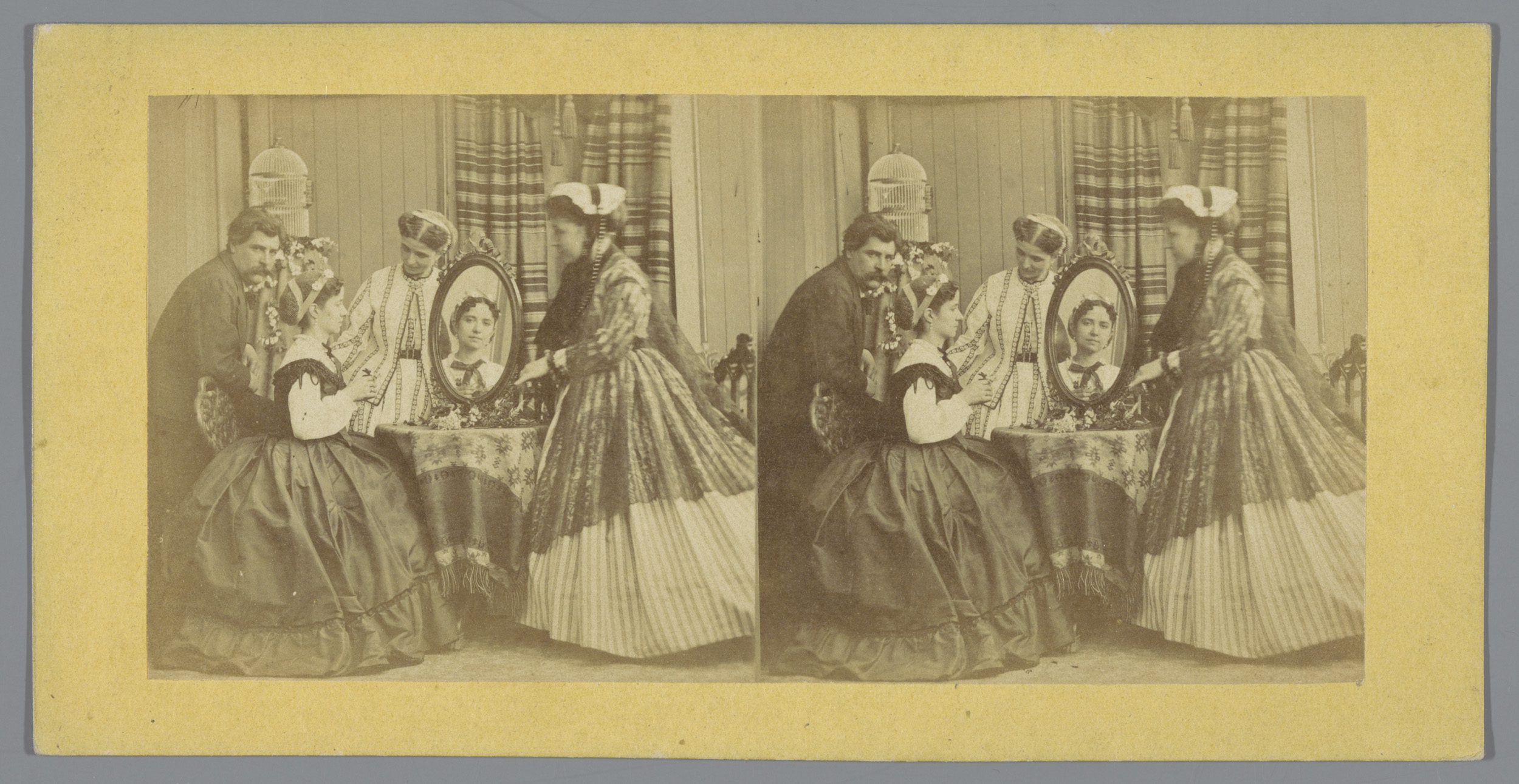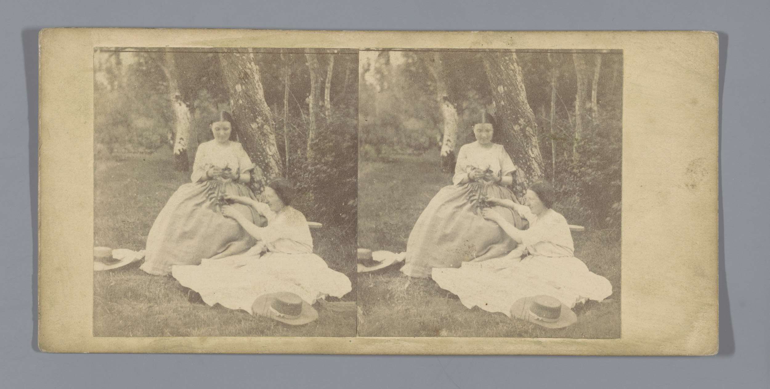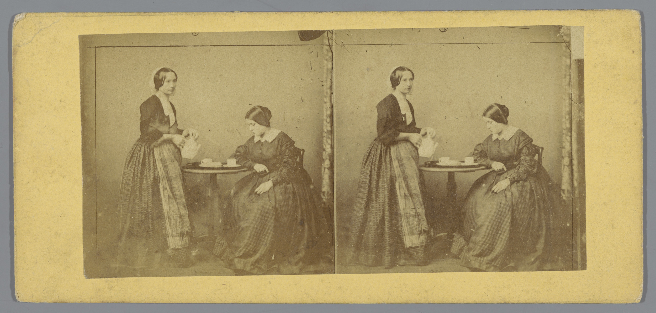 Meisjes rond een tafel waarop mogelijk een stereosco...
