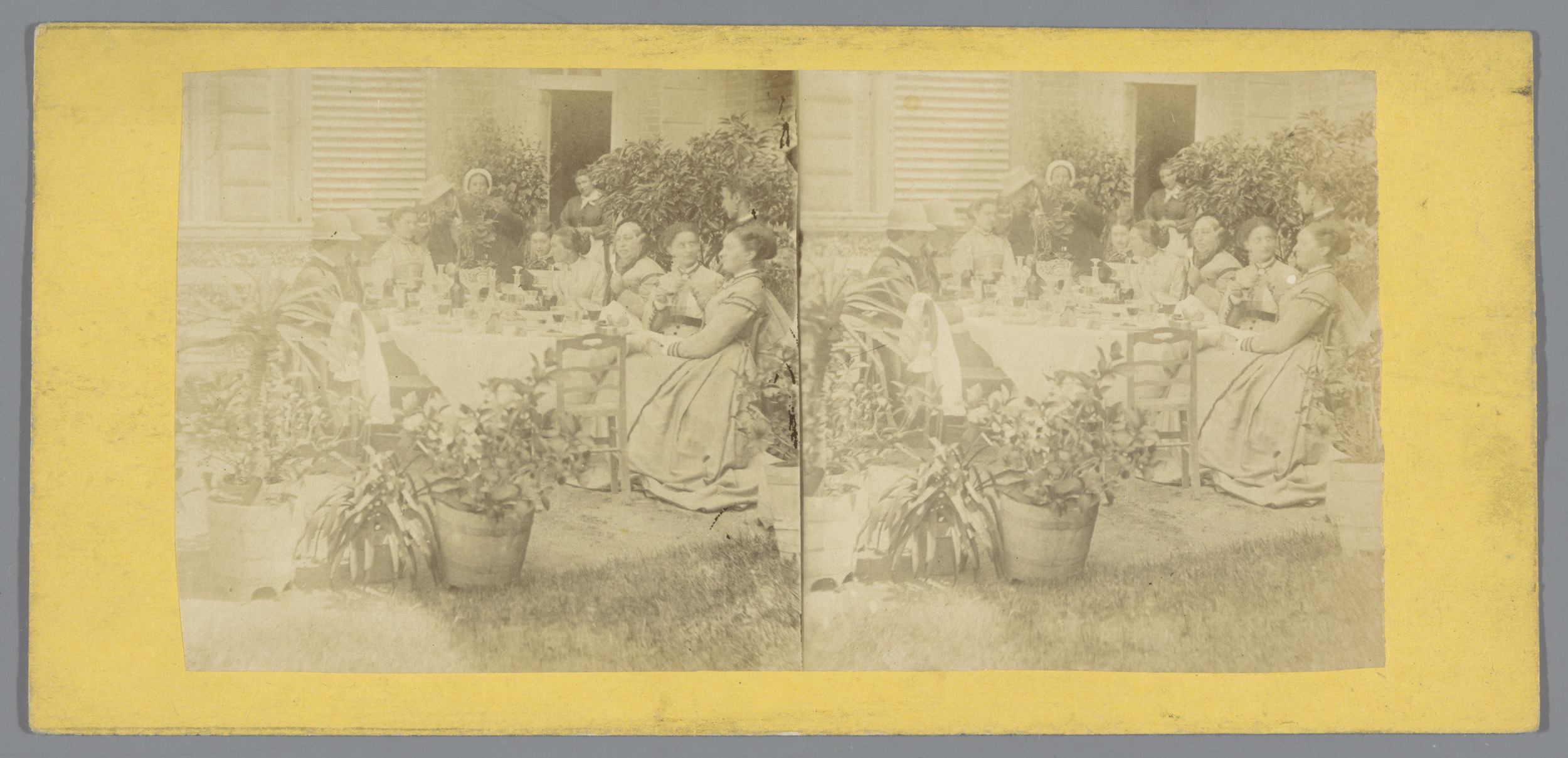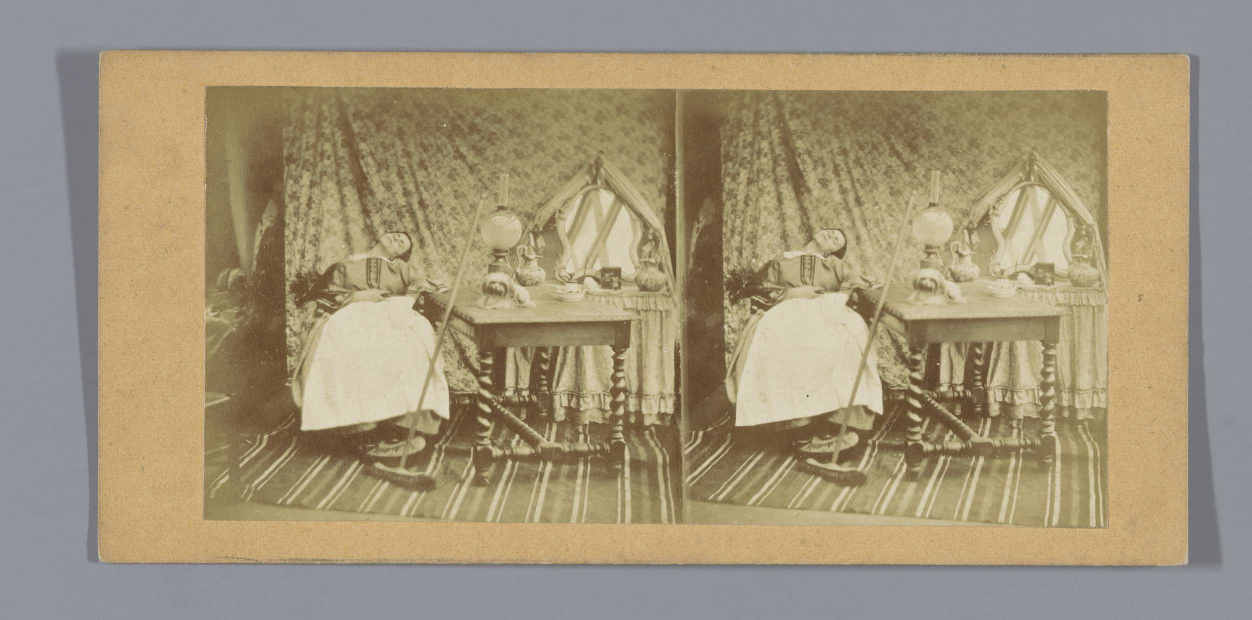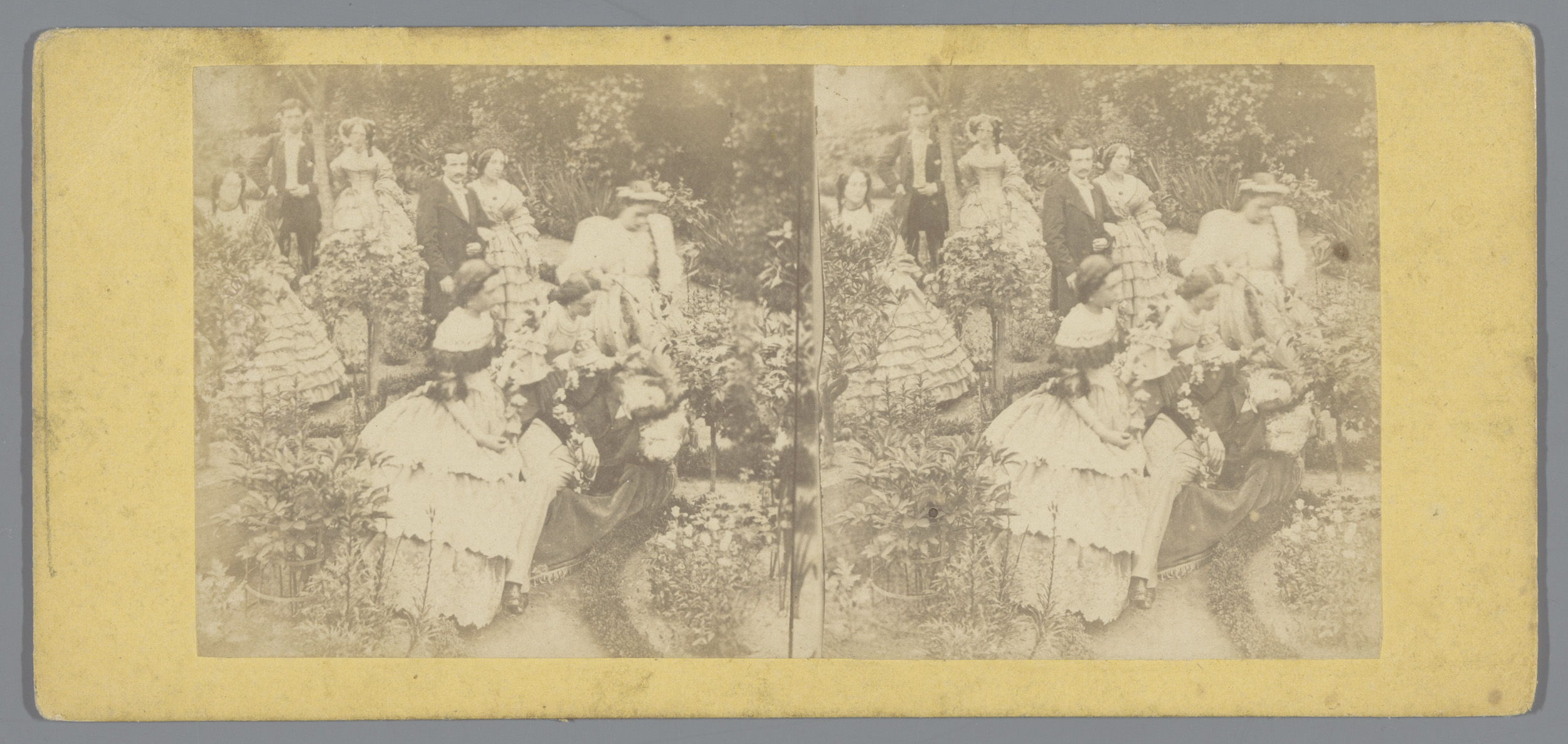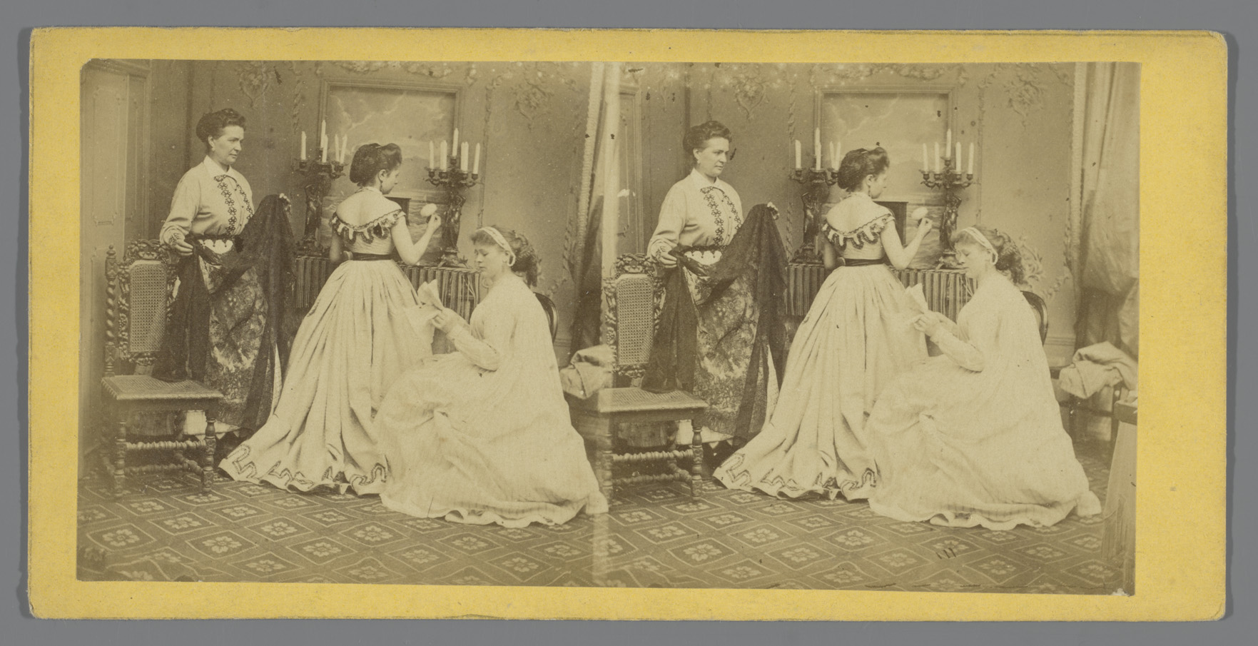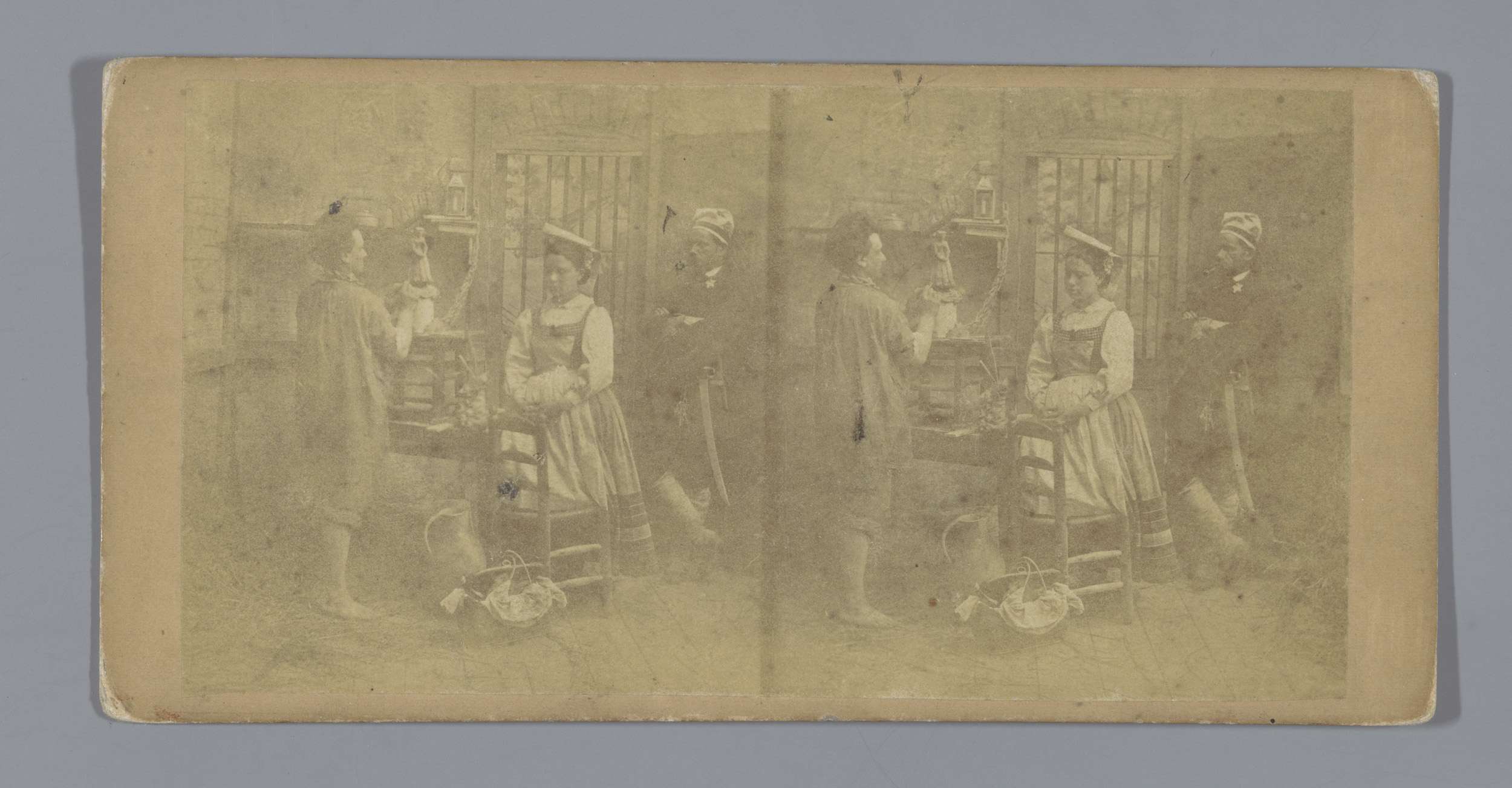 Meisjes rond een tafel waarop mogelijk een stereosco...