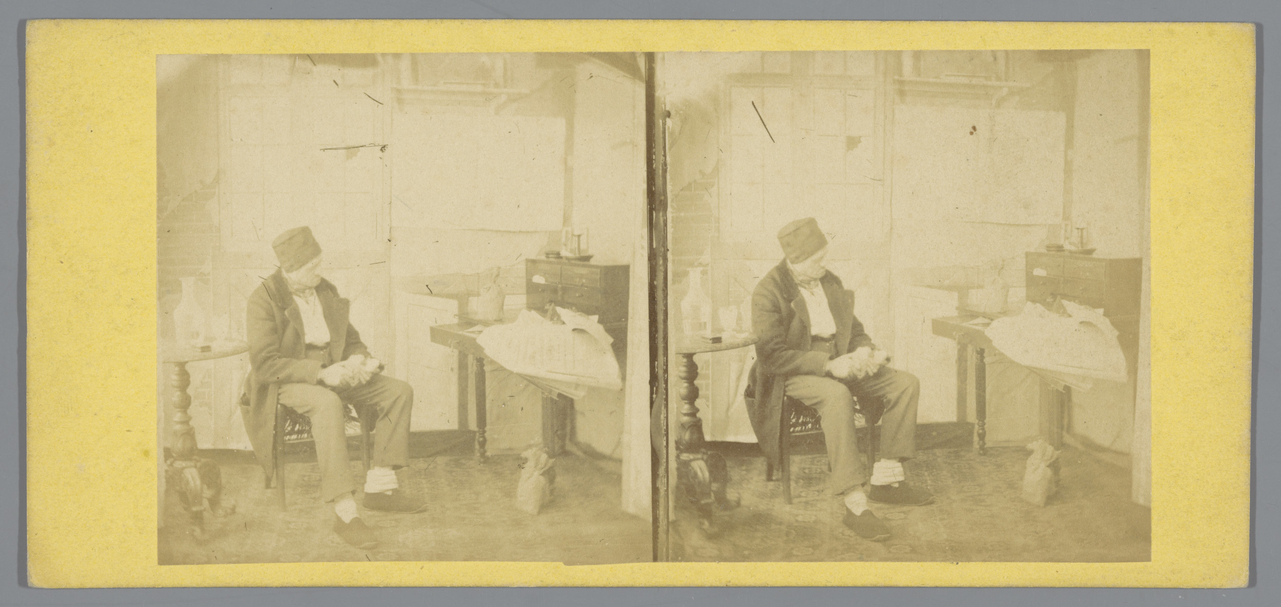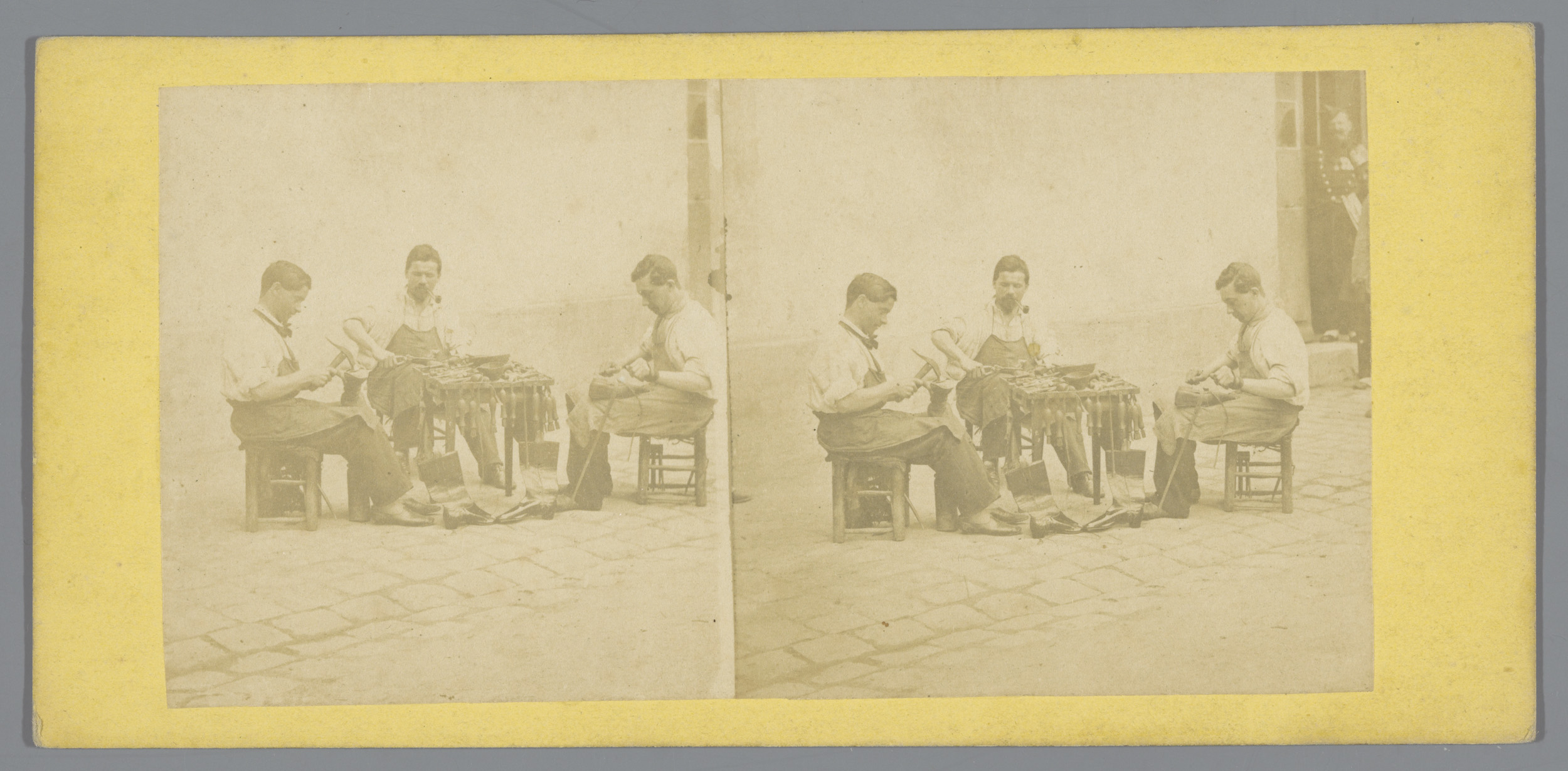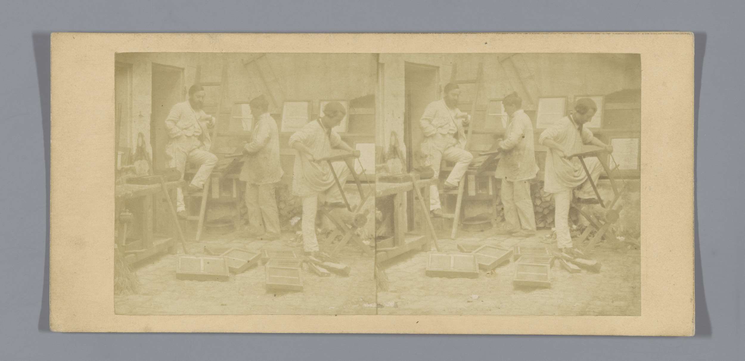 Naaisters vervaardigen hoeden rond een tafel in een ...