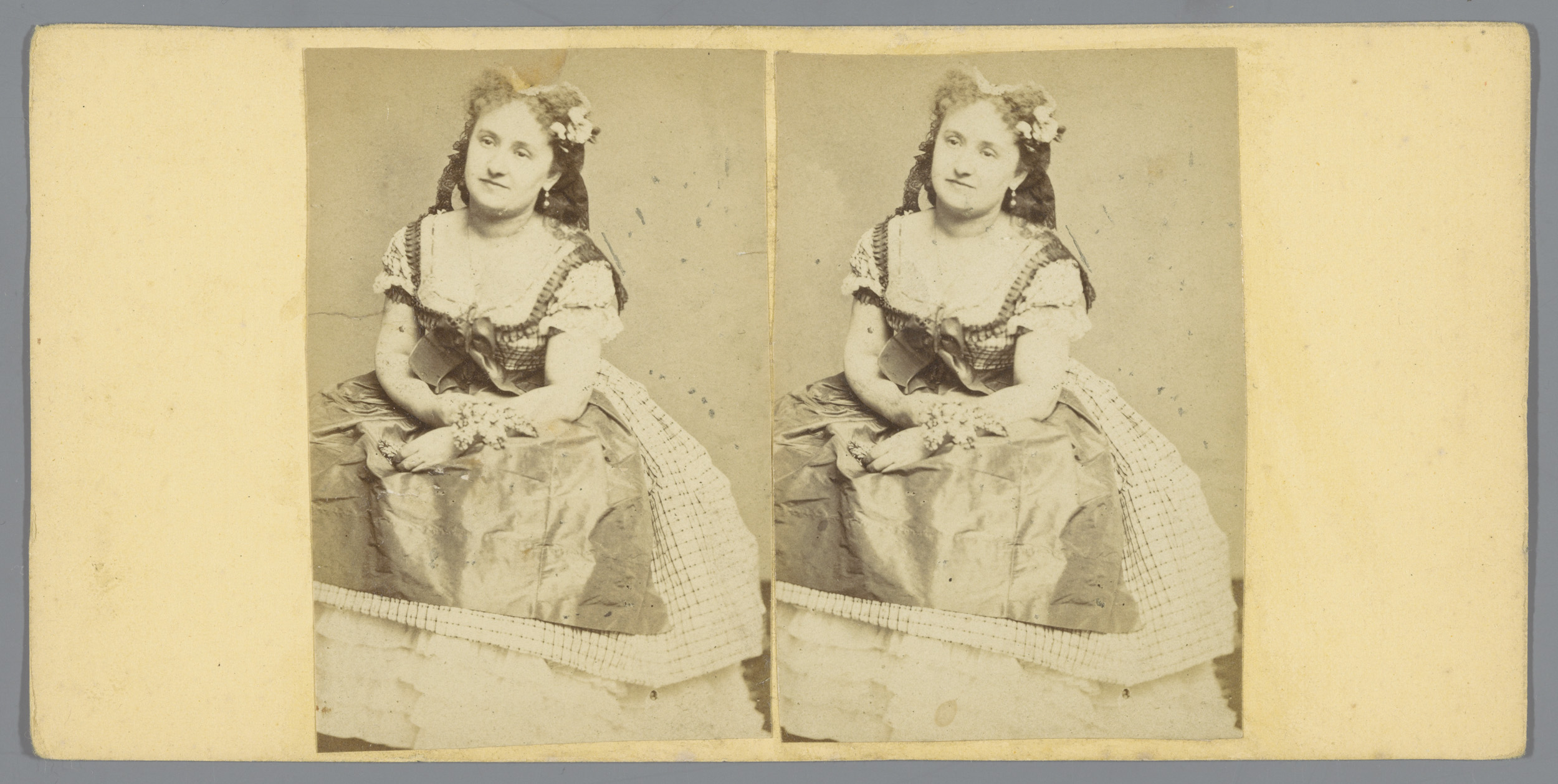 Vrouw zittend aan een tafel terwijl een dienstmeisje...