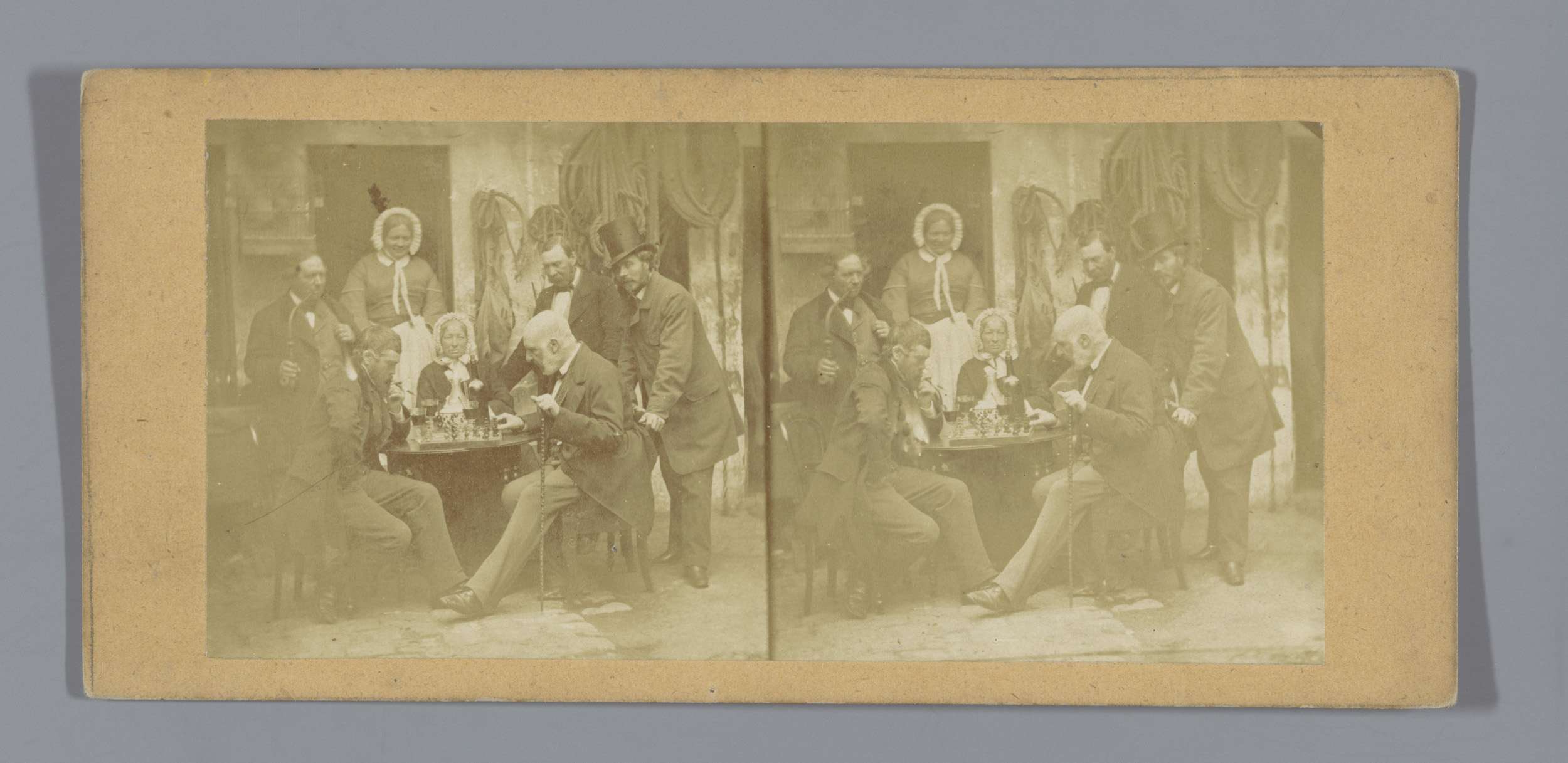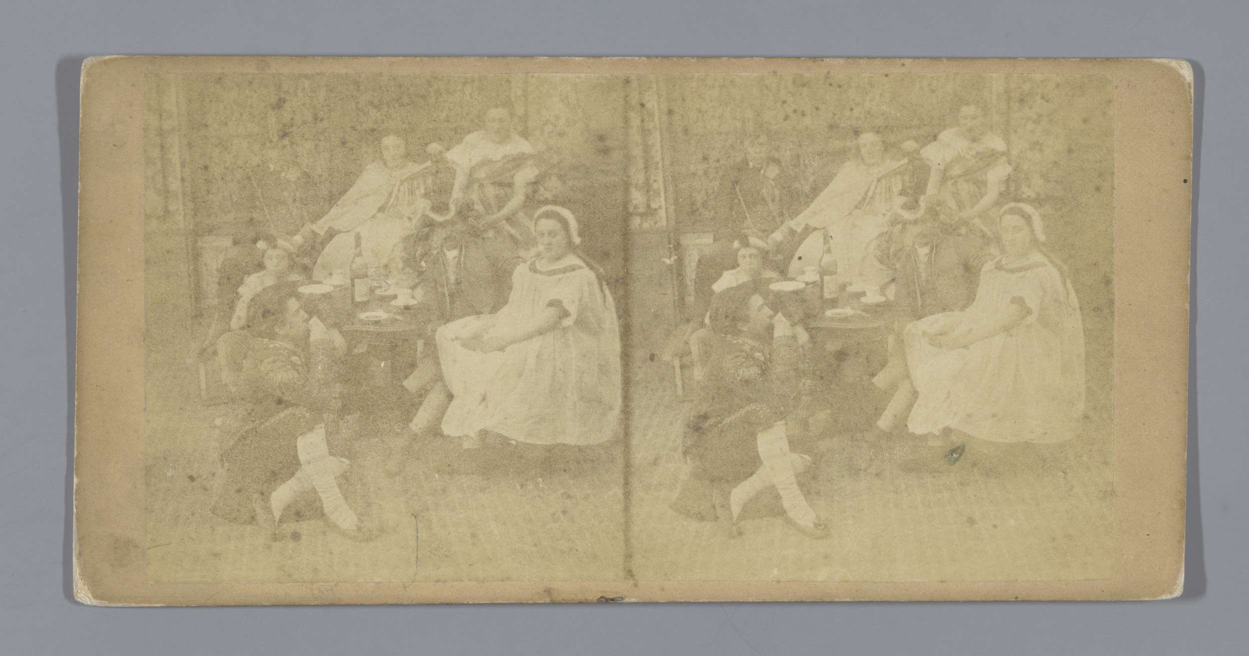 Gezelschap rond een tafel en een vrouw achter een sc...