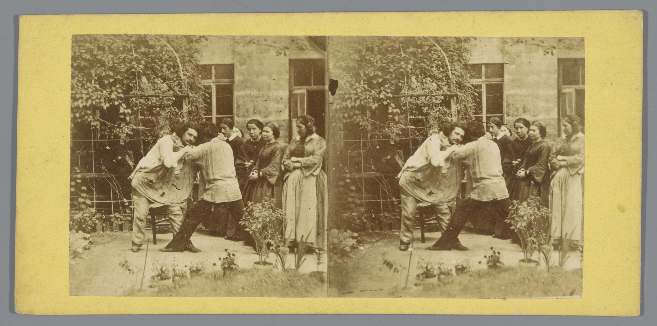 Vrouwen kijken naar twee vechtende mannen in een tuin