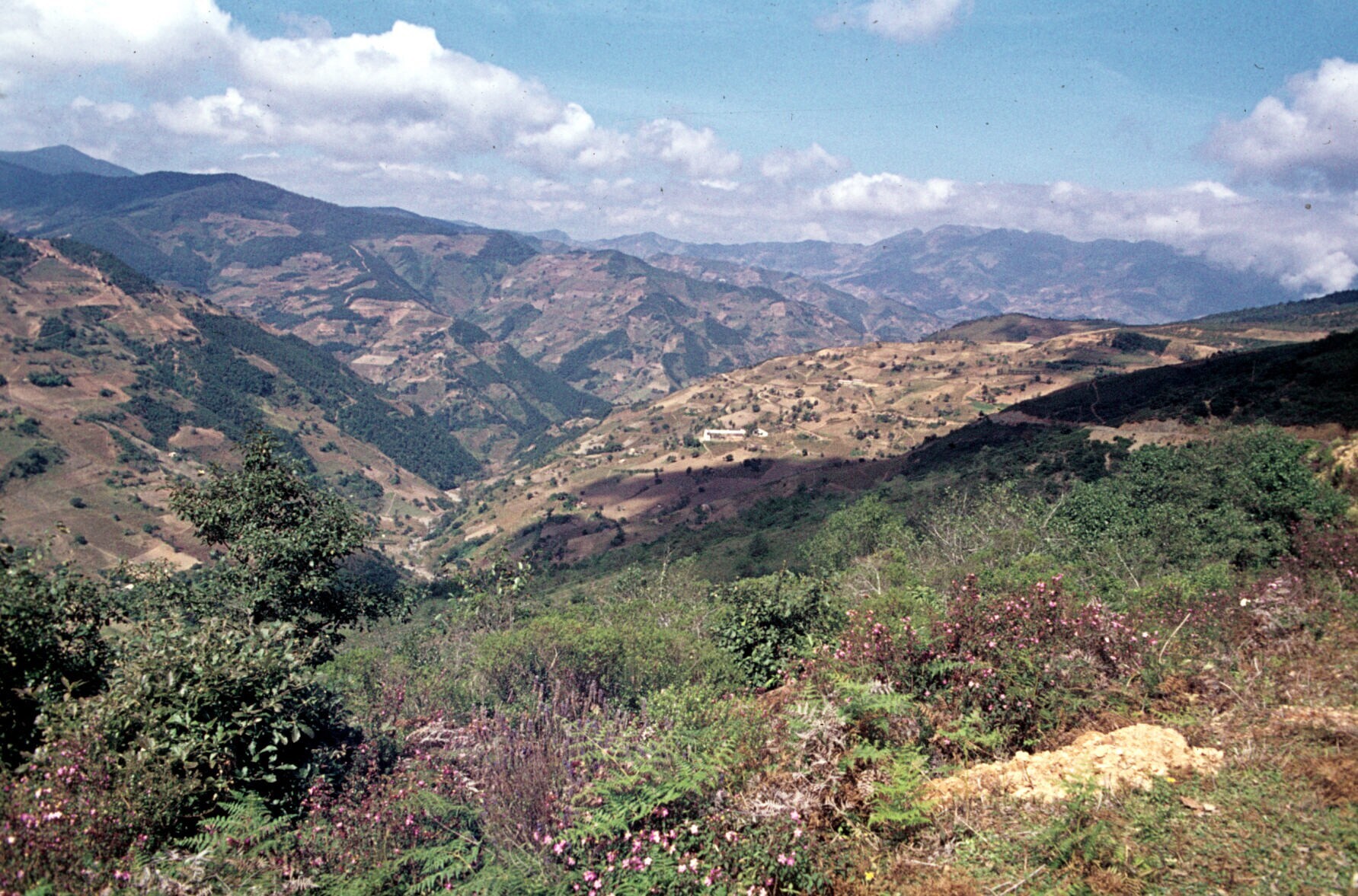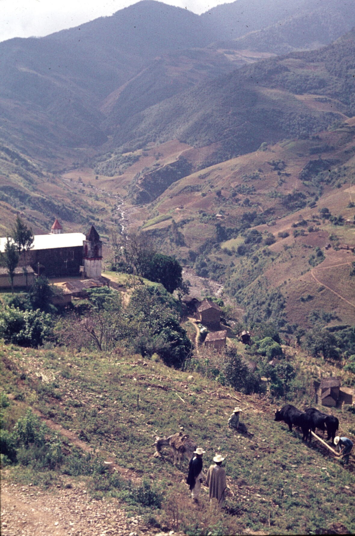 deel van het dorp met mannen in cotón (poncho) bij vee