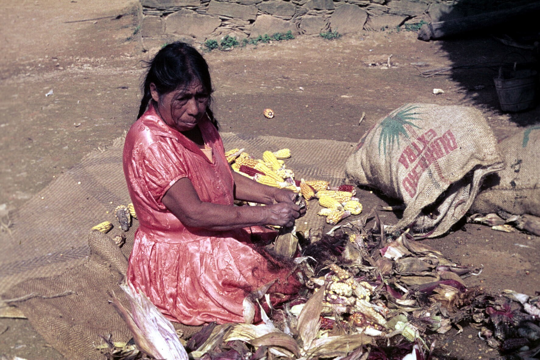 vrouw bij geoogste maïs op erf