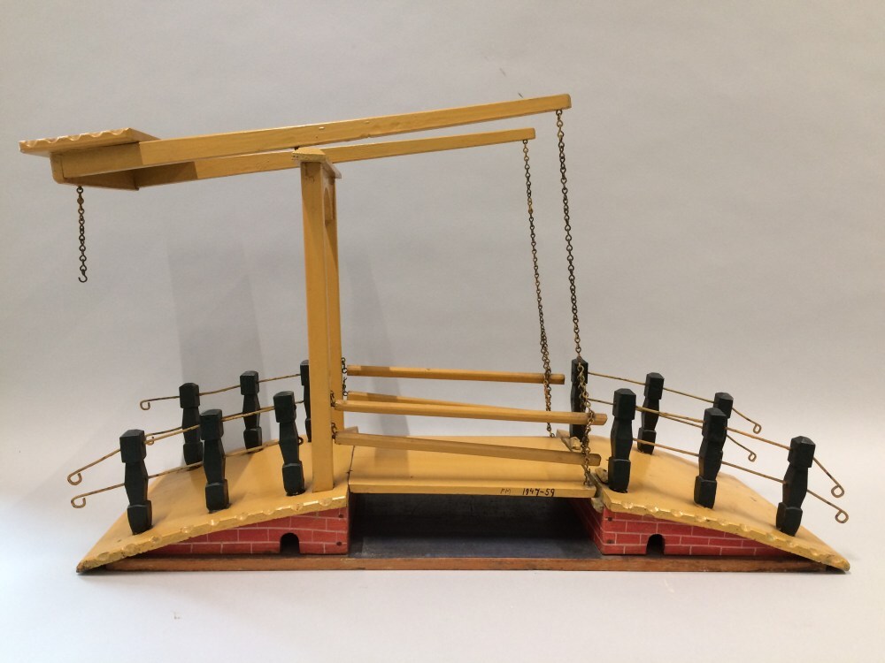 Vurenhouten miniatuur ophaalbrug, geelgeverfd, met 1...