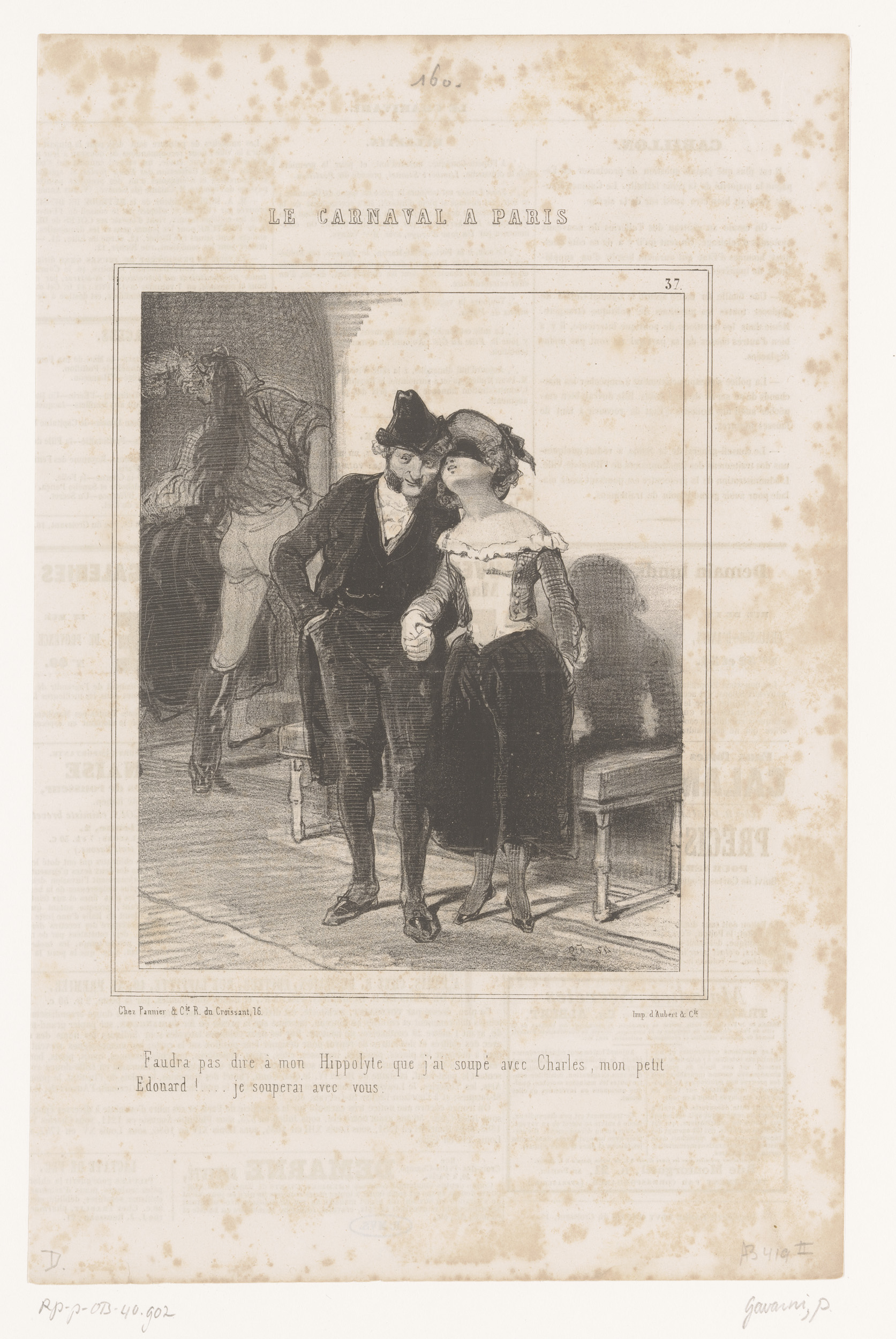 Gemaskerde vrouw fluistert in het oor van haar chaperon