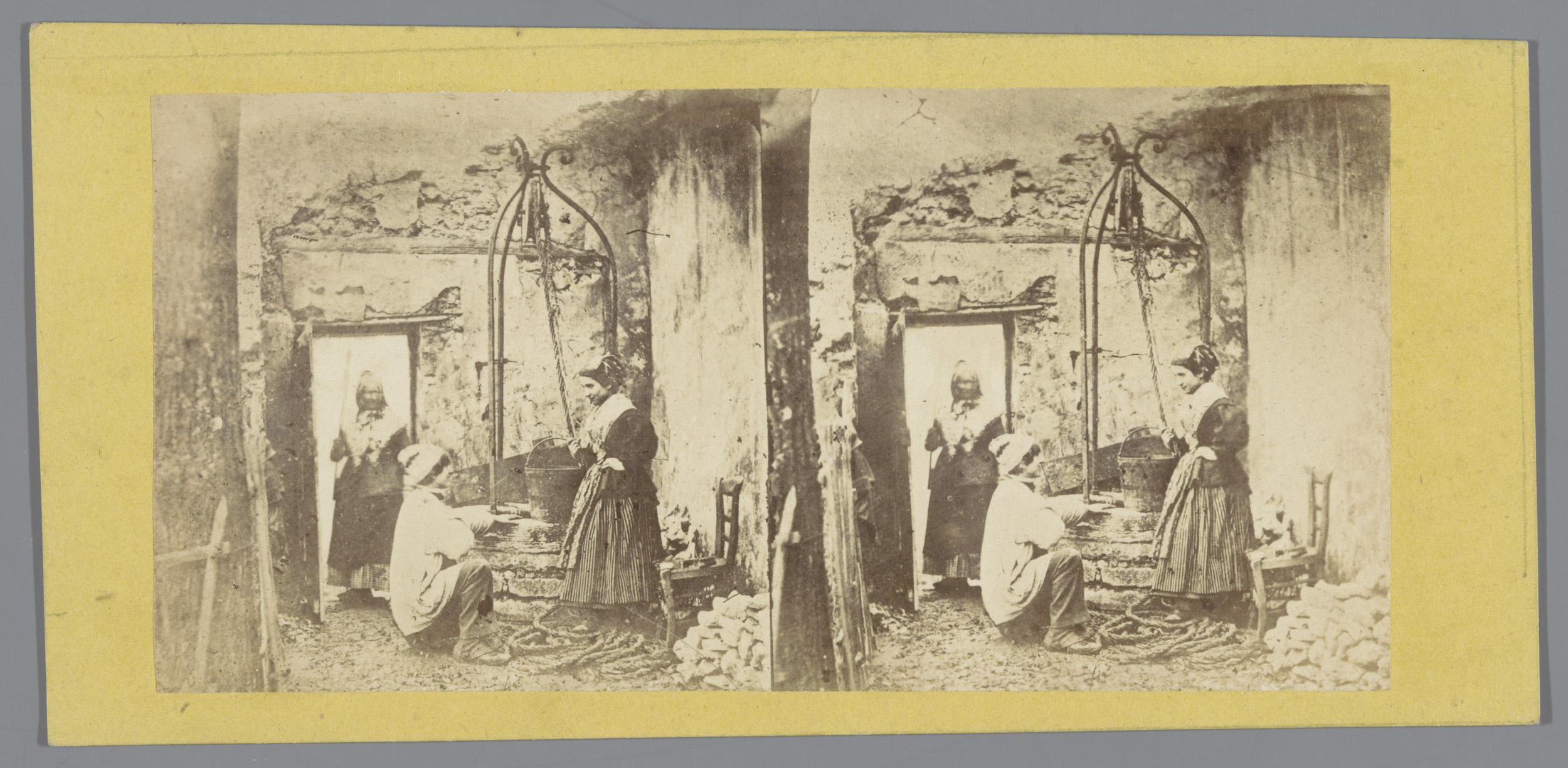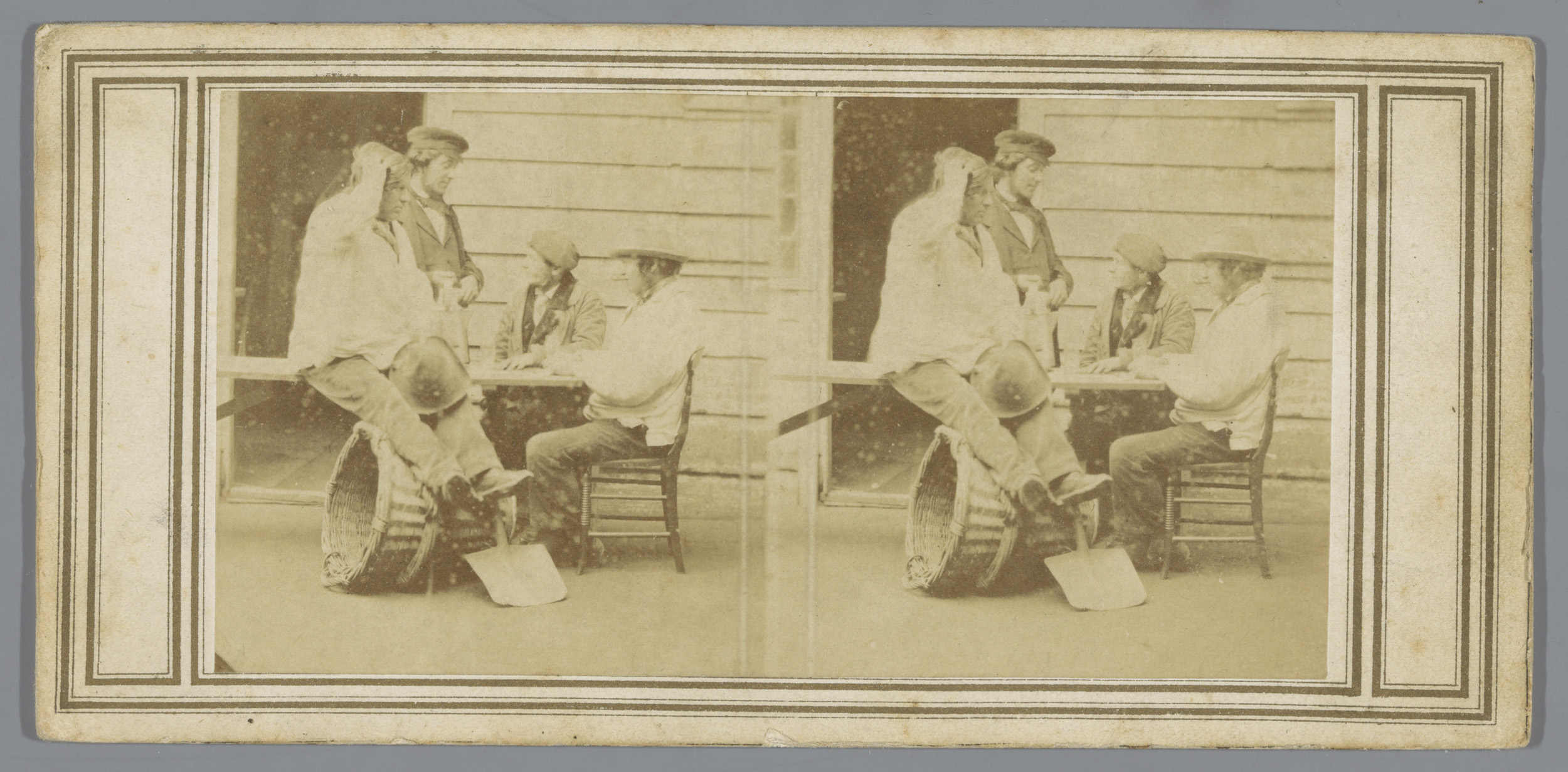 Twee jongens bij tot vogelkooien omgebouwde crinolin...