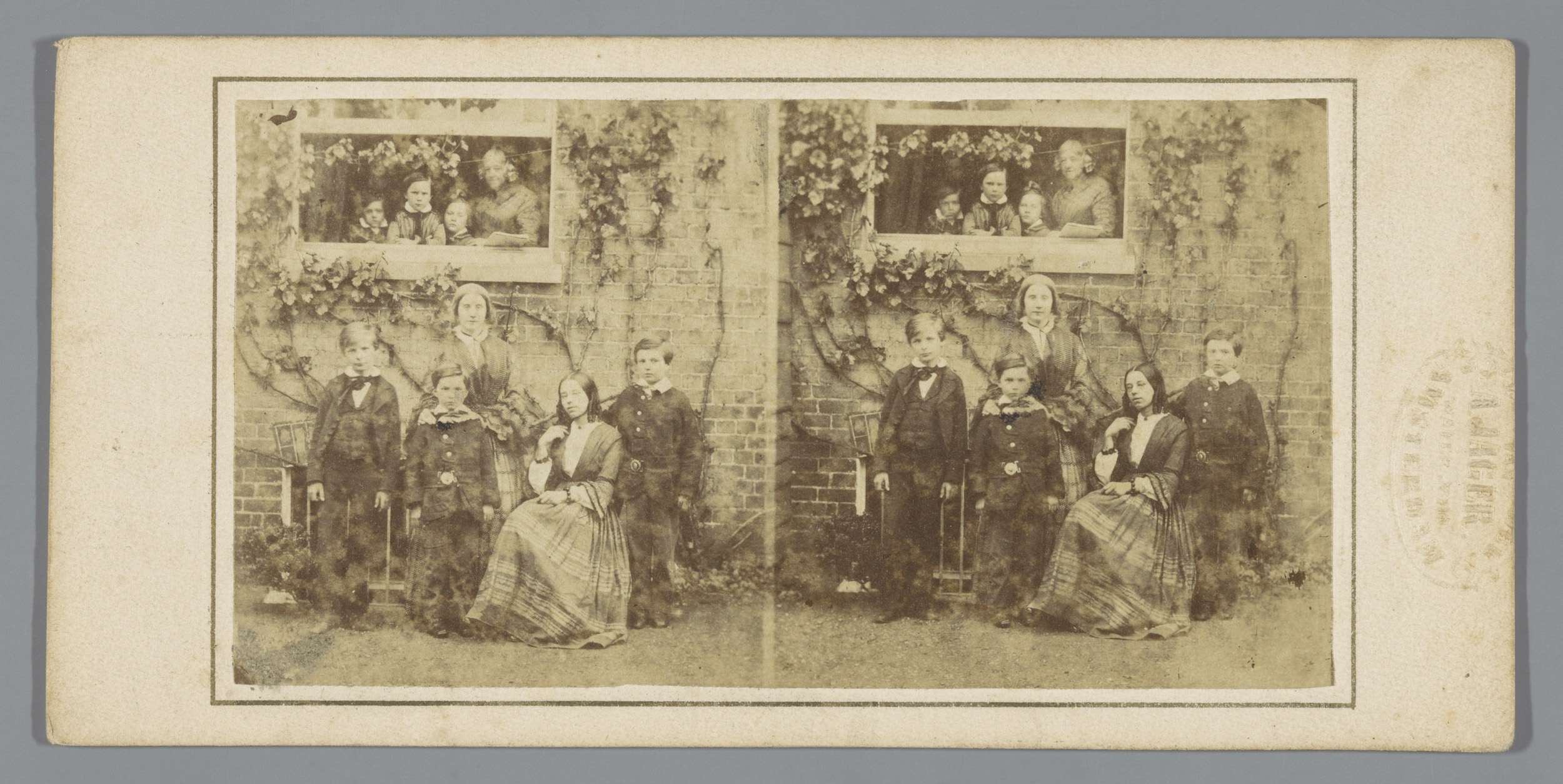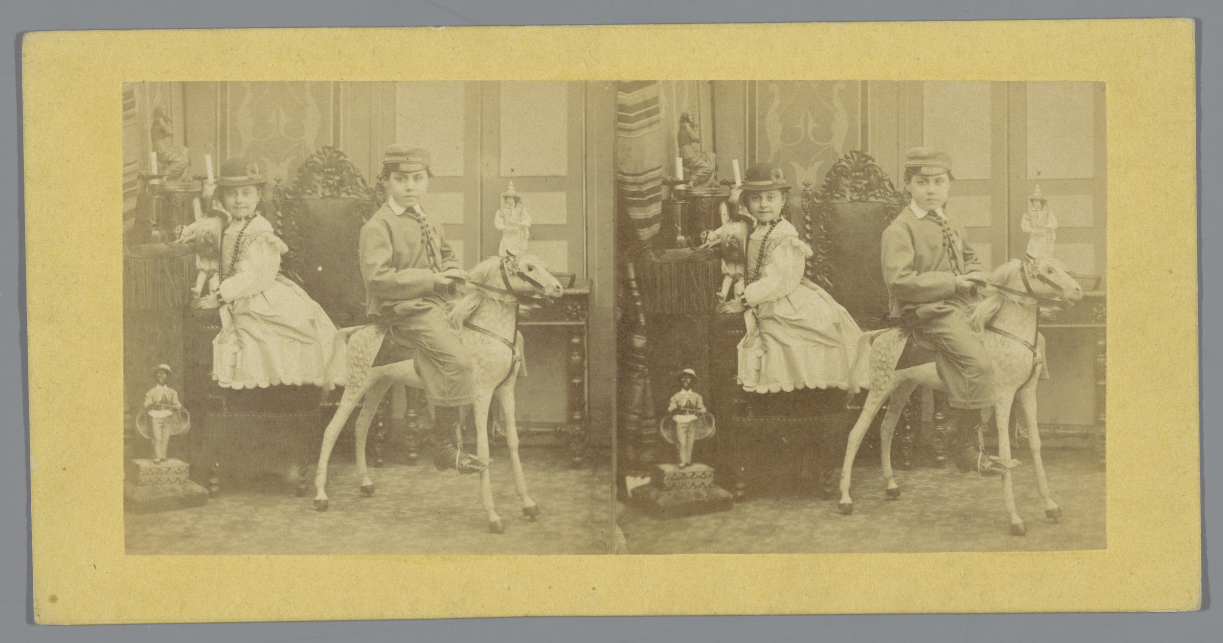 Jongen met hoge hoed naast meisje in lange jurk