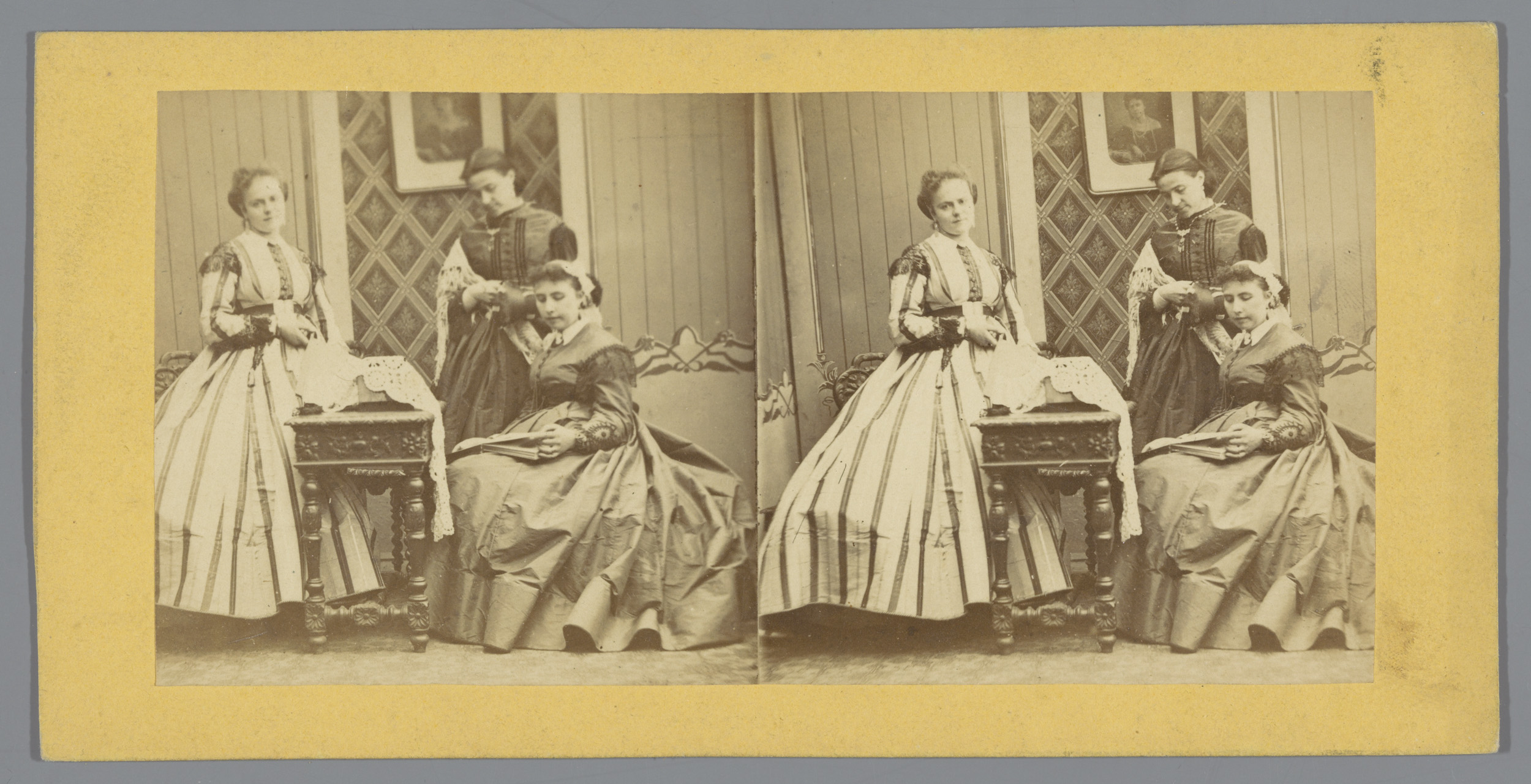 Twee vrouwen voor geschilderde achtergrond