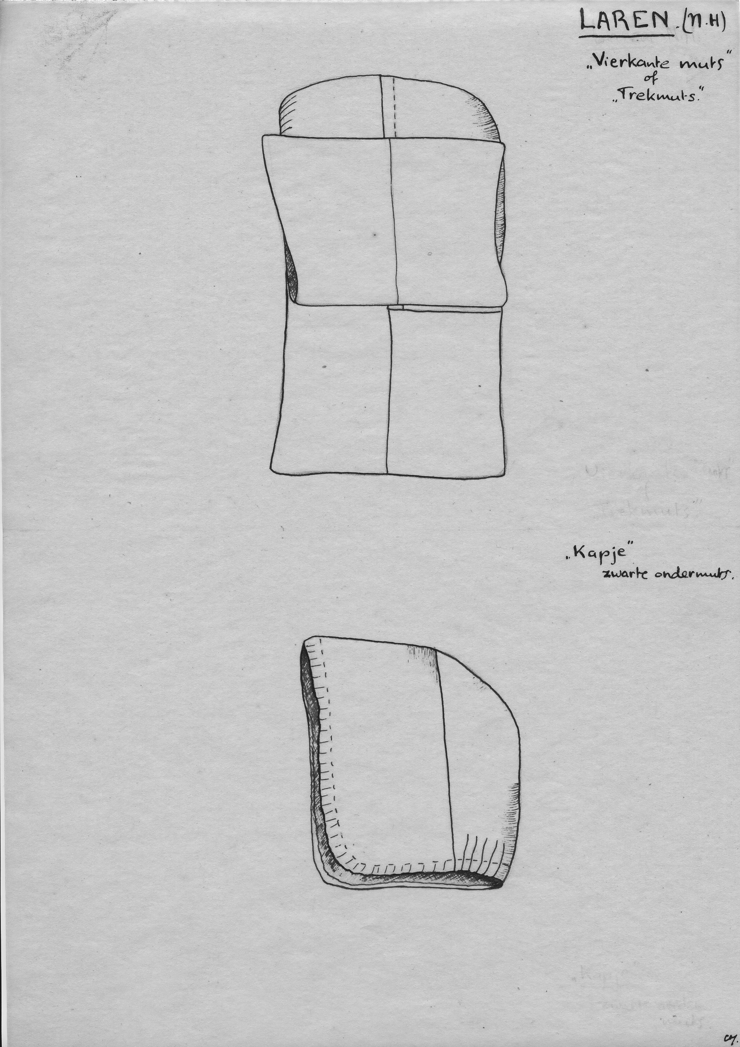 Tekening van een vierkante muts en kapje, Laren (opm...