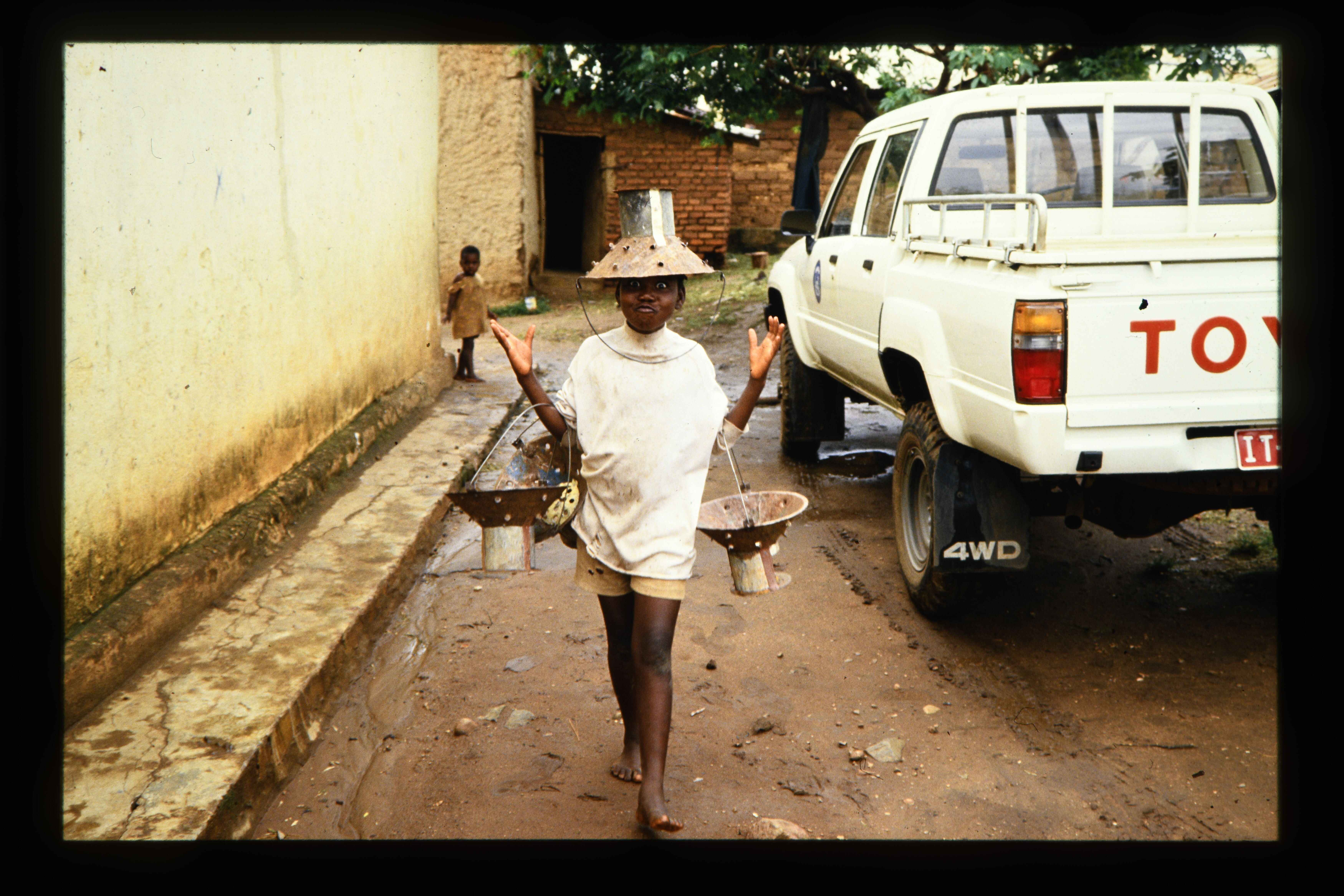 'Meisje op straat met een vergiet op haar hoofd en e...
