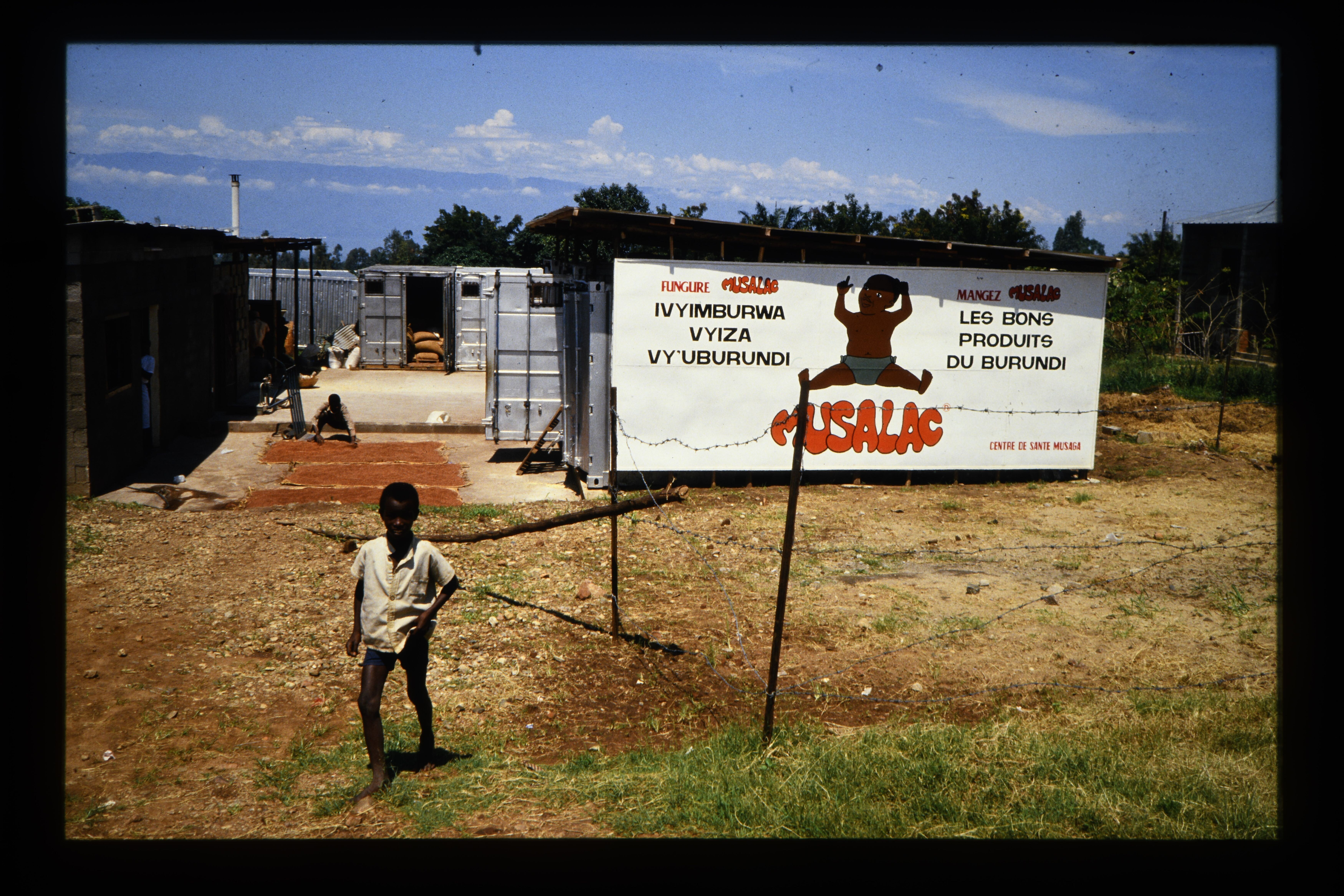 'Reclamebord voor "Musalac" kindervoeding op een con...