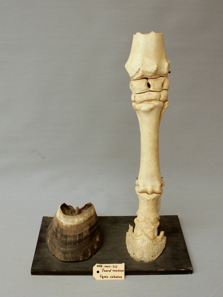 Paard; voorbeen skelet; op plank gemonteerd