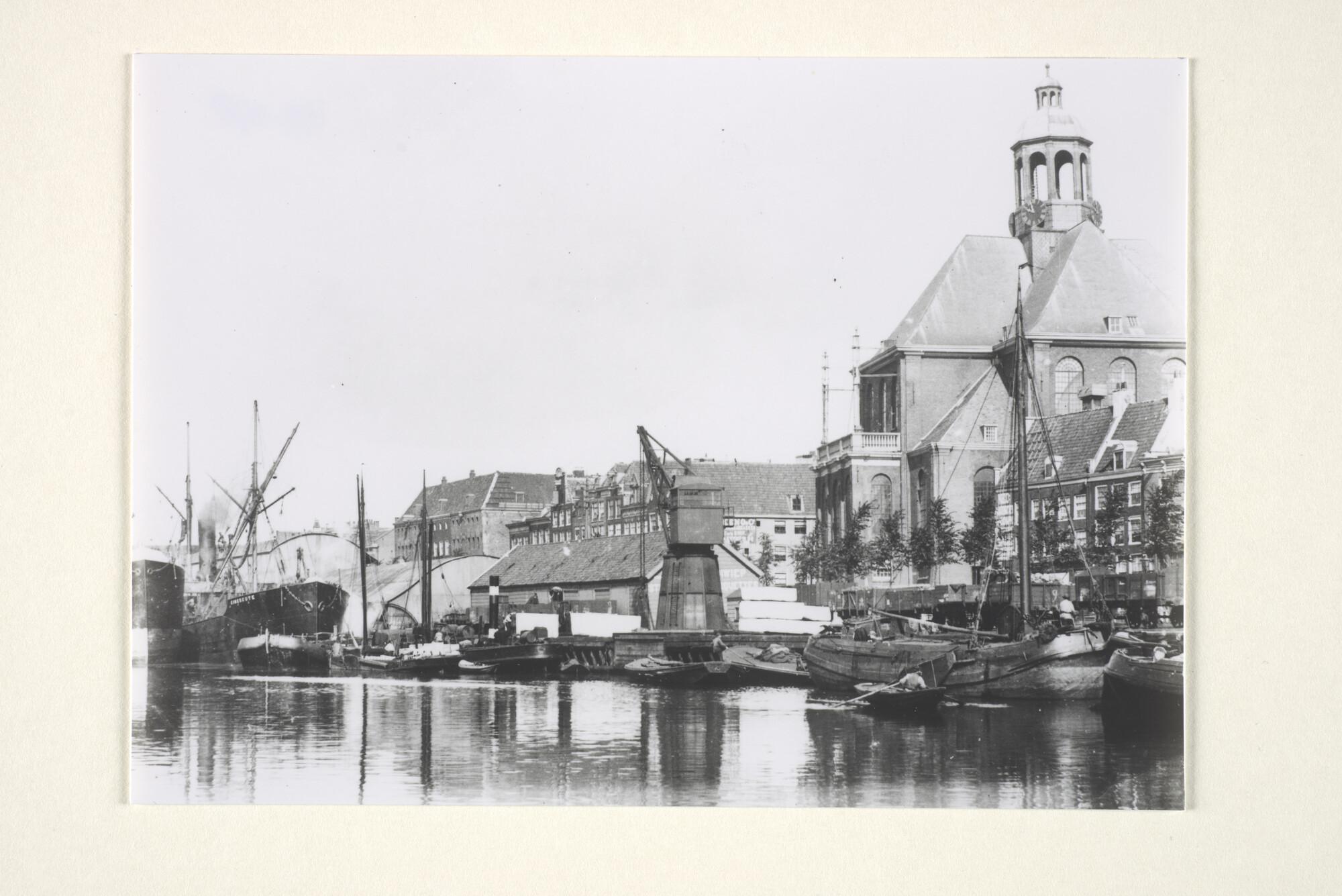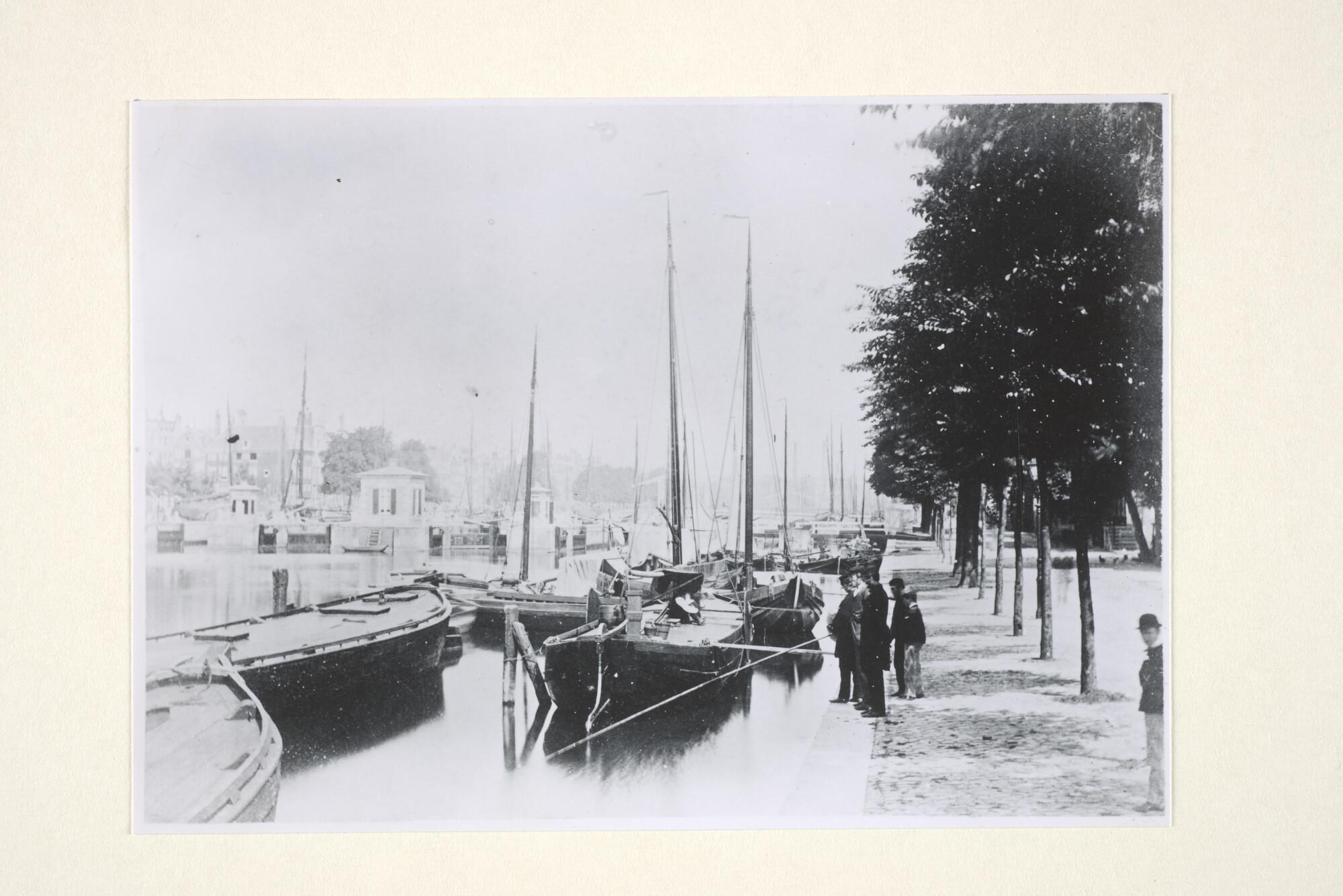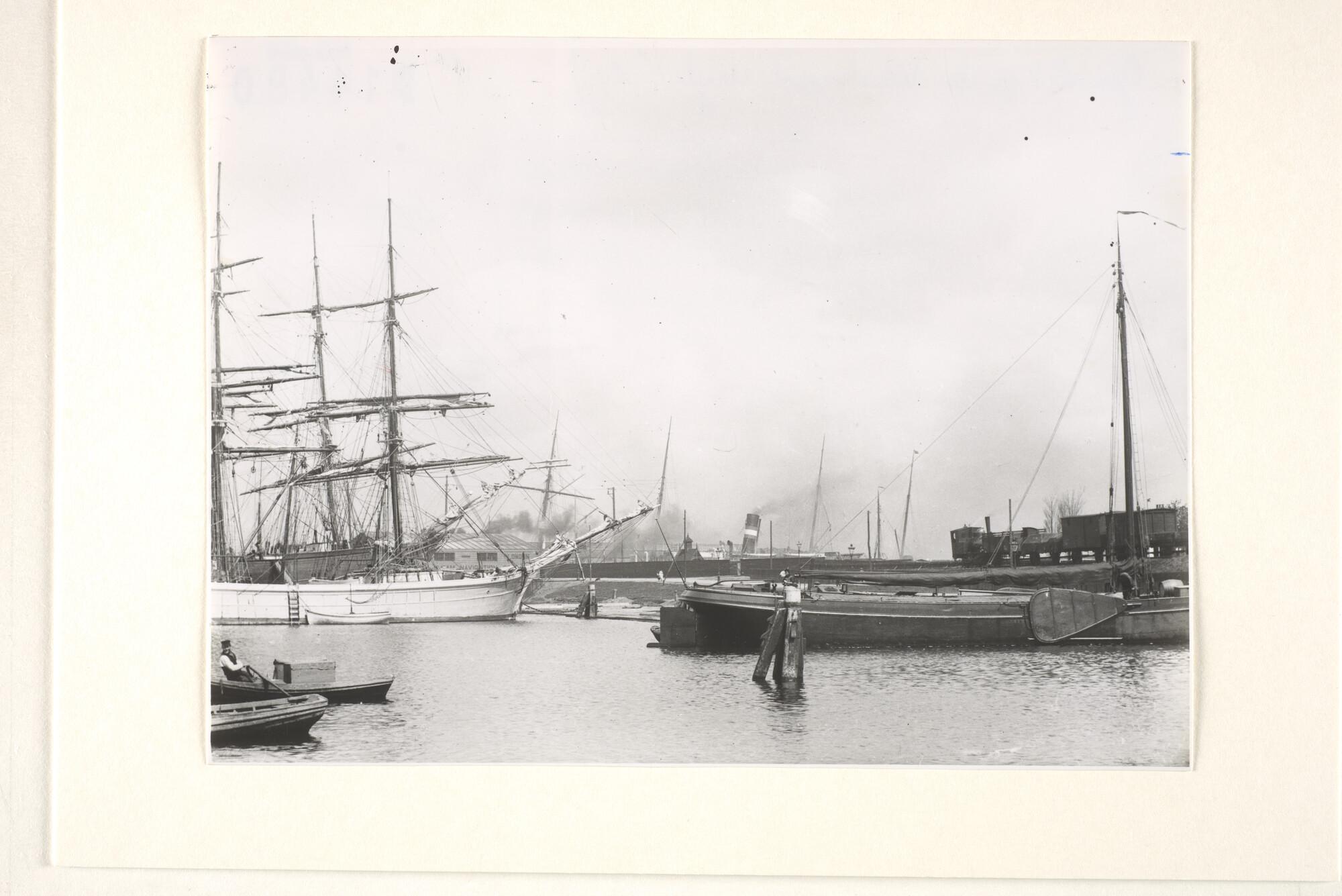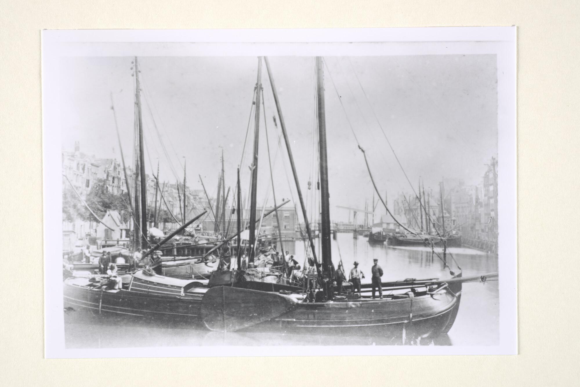 Gezicht op het Damrak met diverse afgemeerde beurtsc...