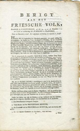 Pamflet met de titel 'Berigt aan het Friessche volk ...