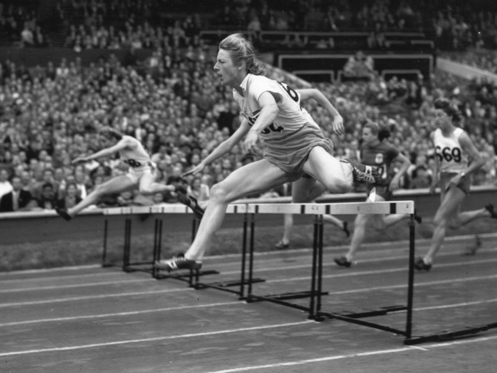 Schilderij van Fanny Blankers-Koen finale 80m horden...