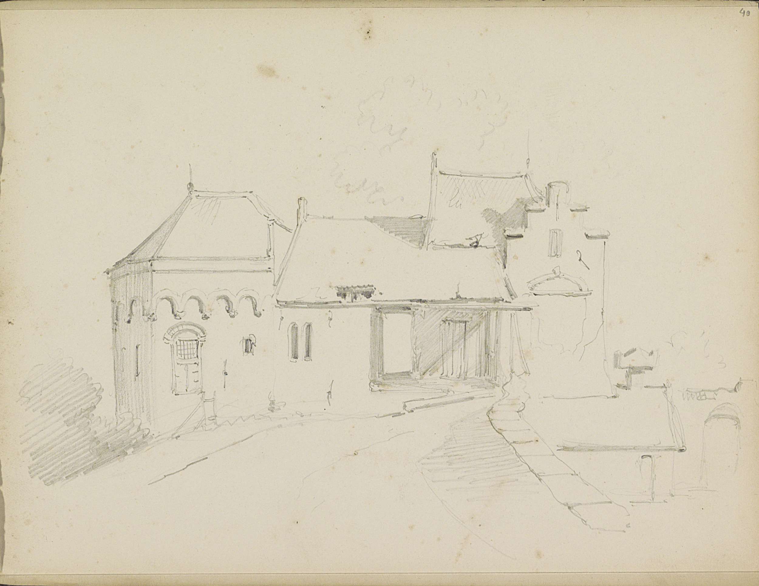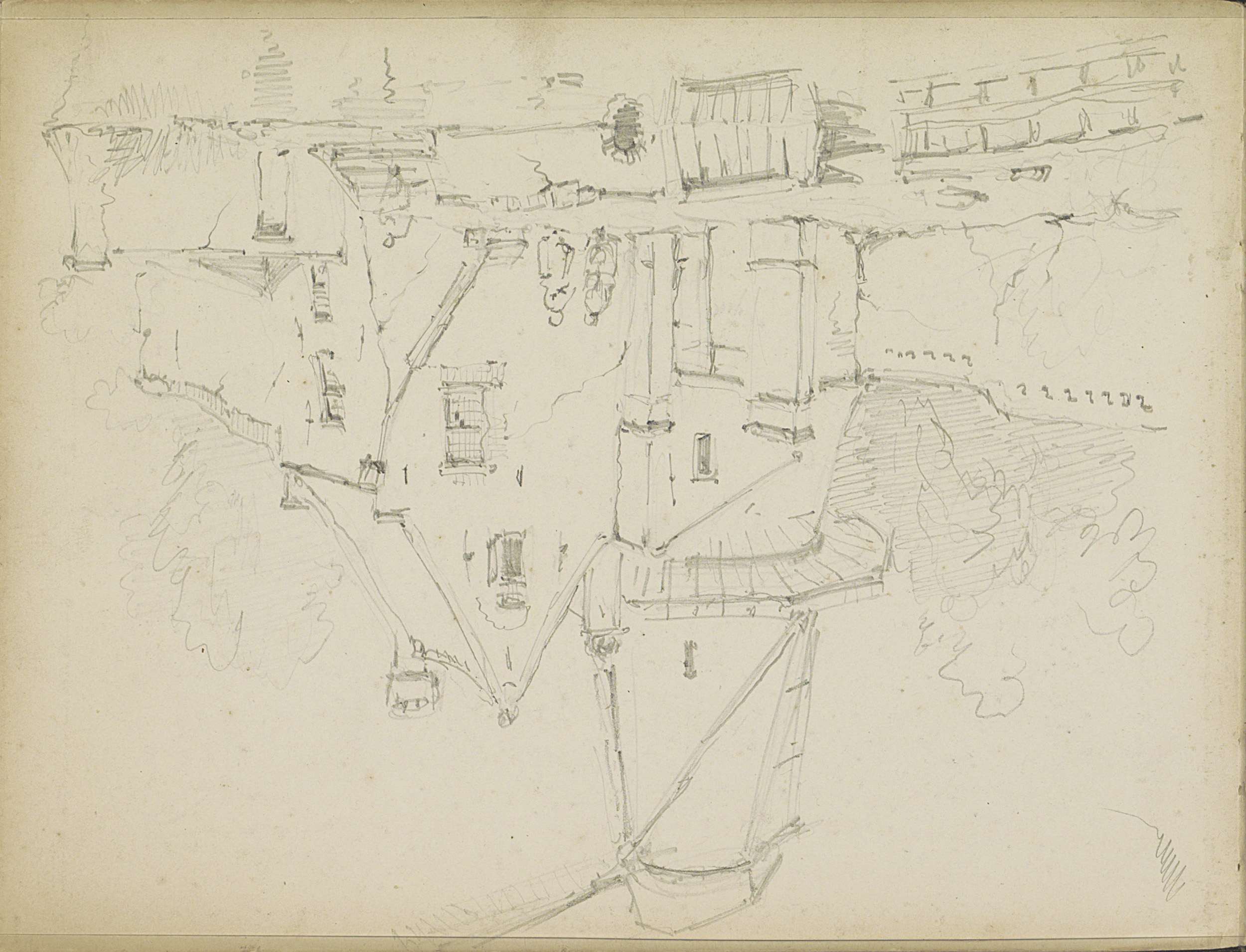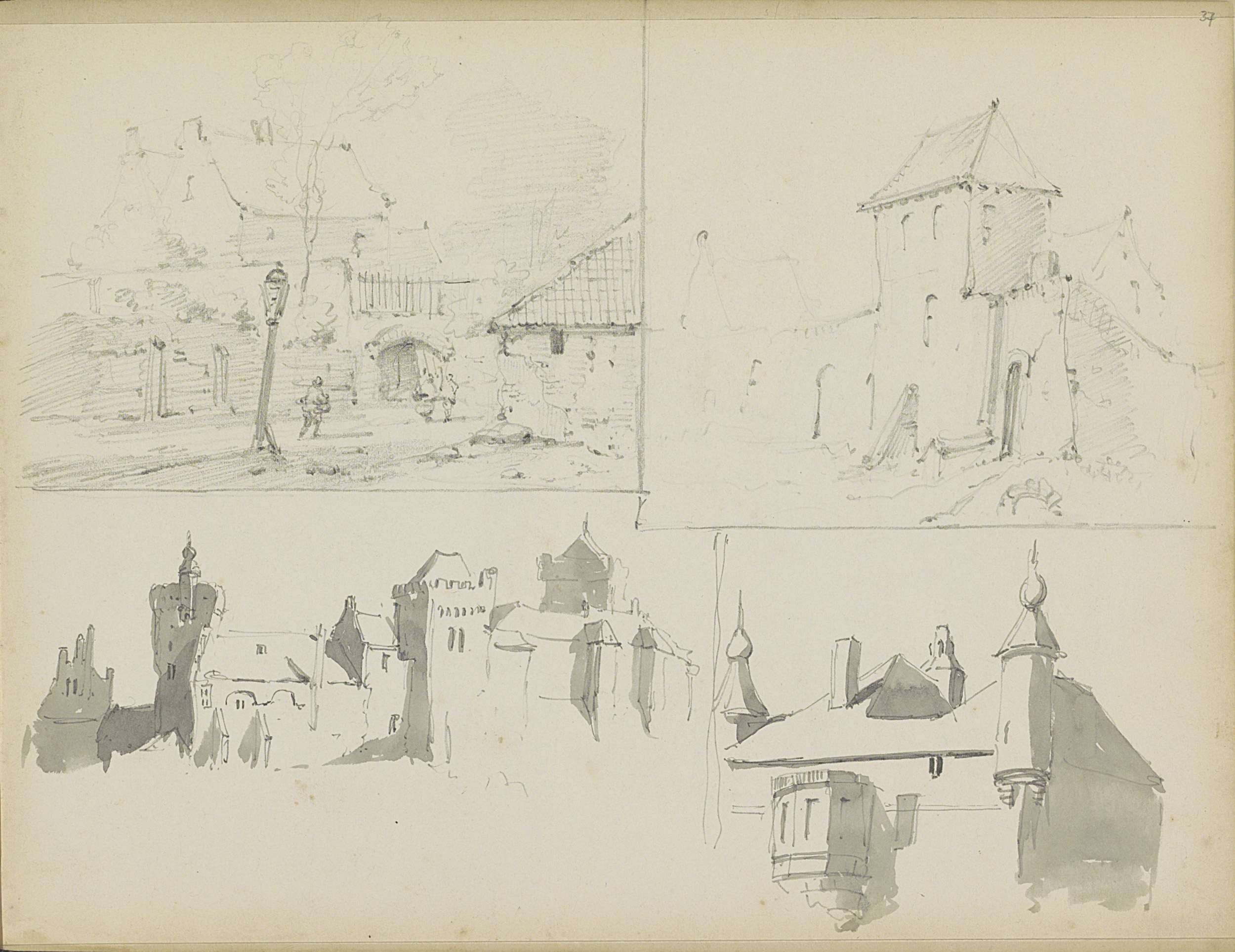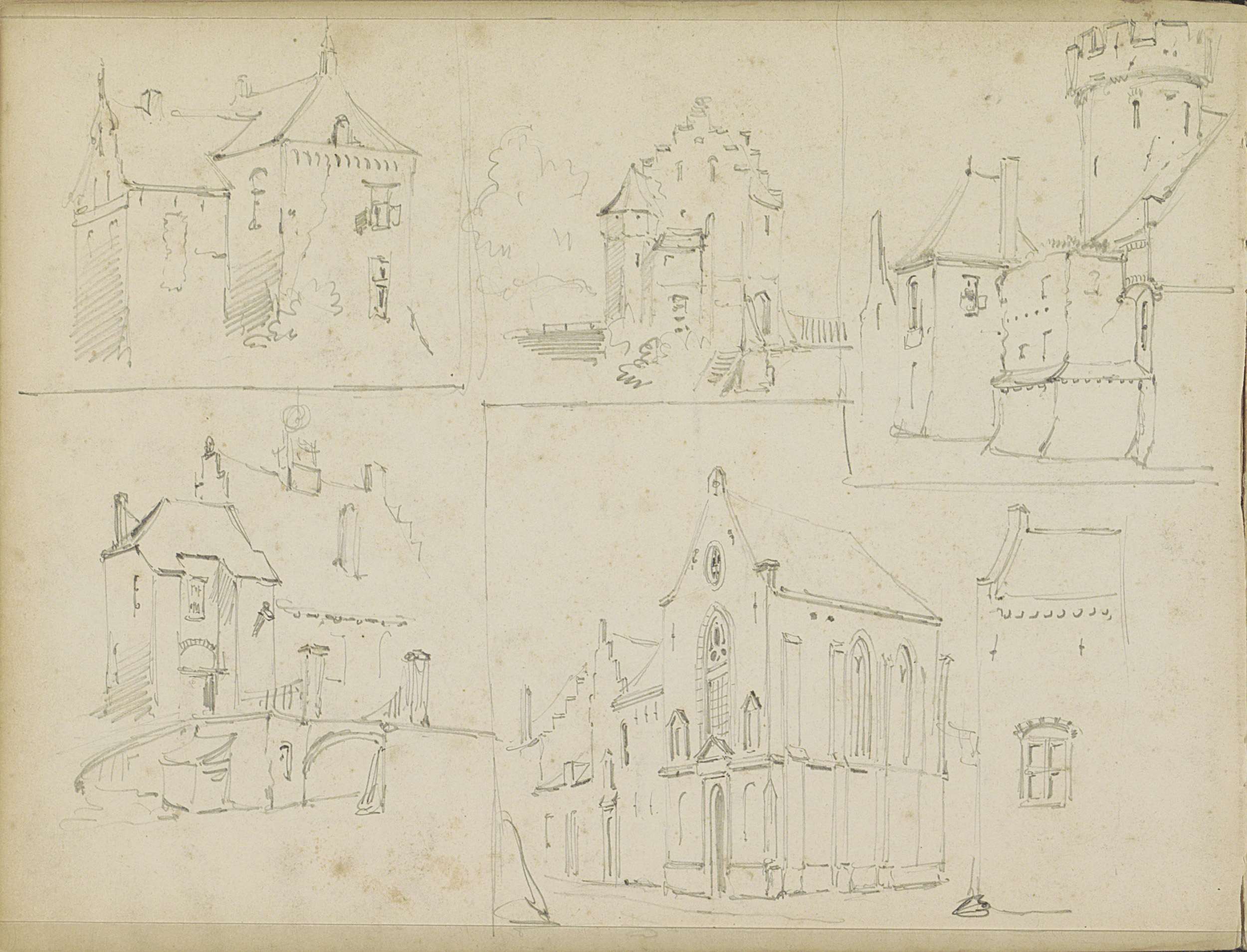 Studieblad met gebouwen en een stadsgezicht