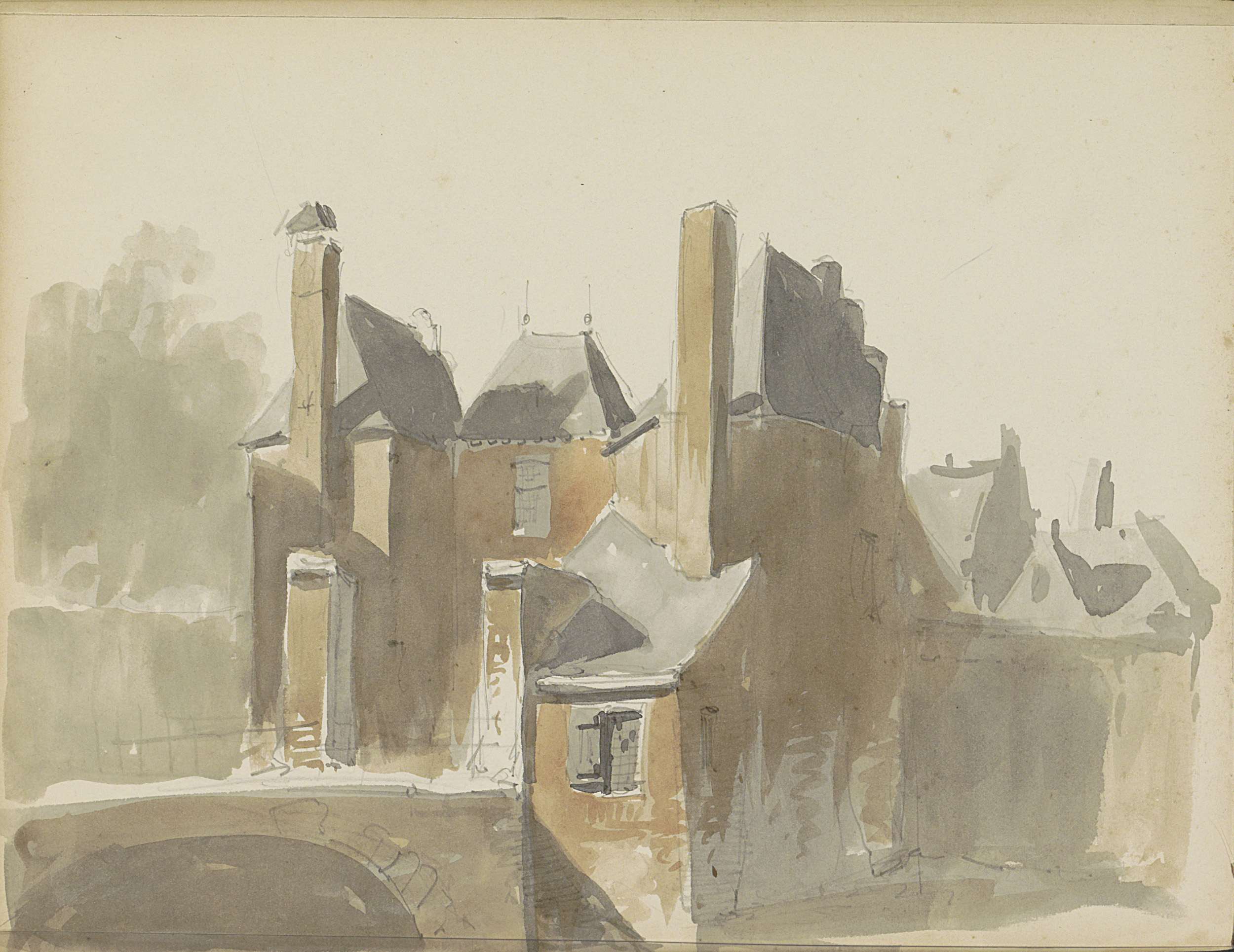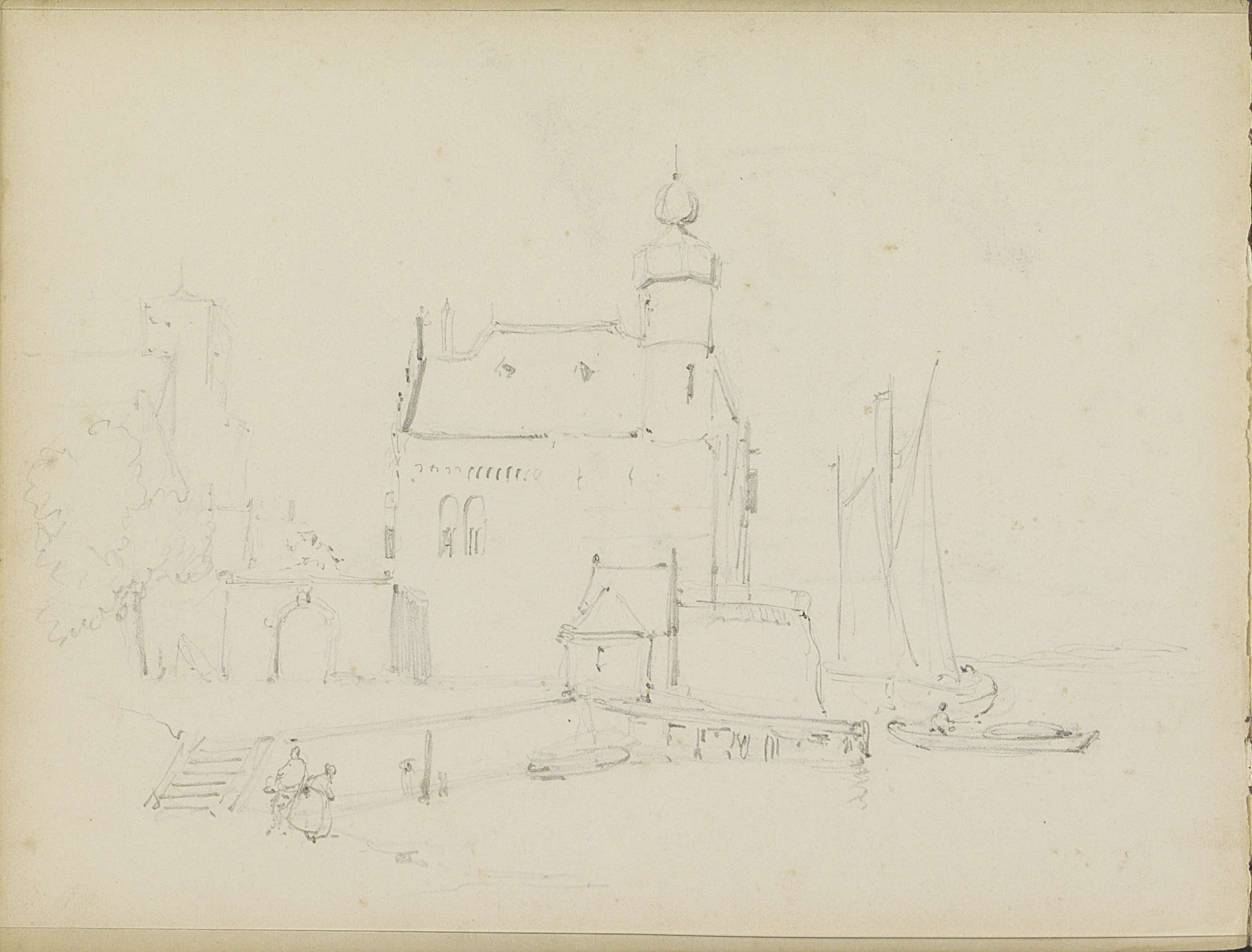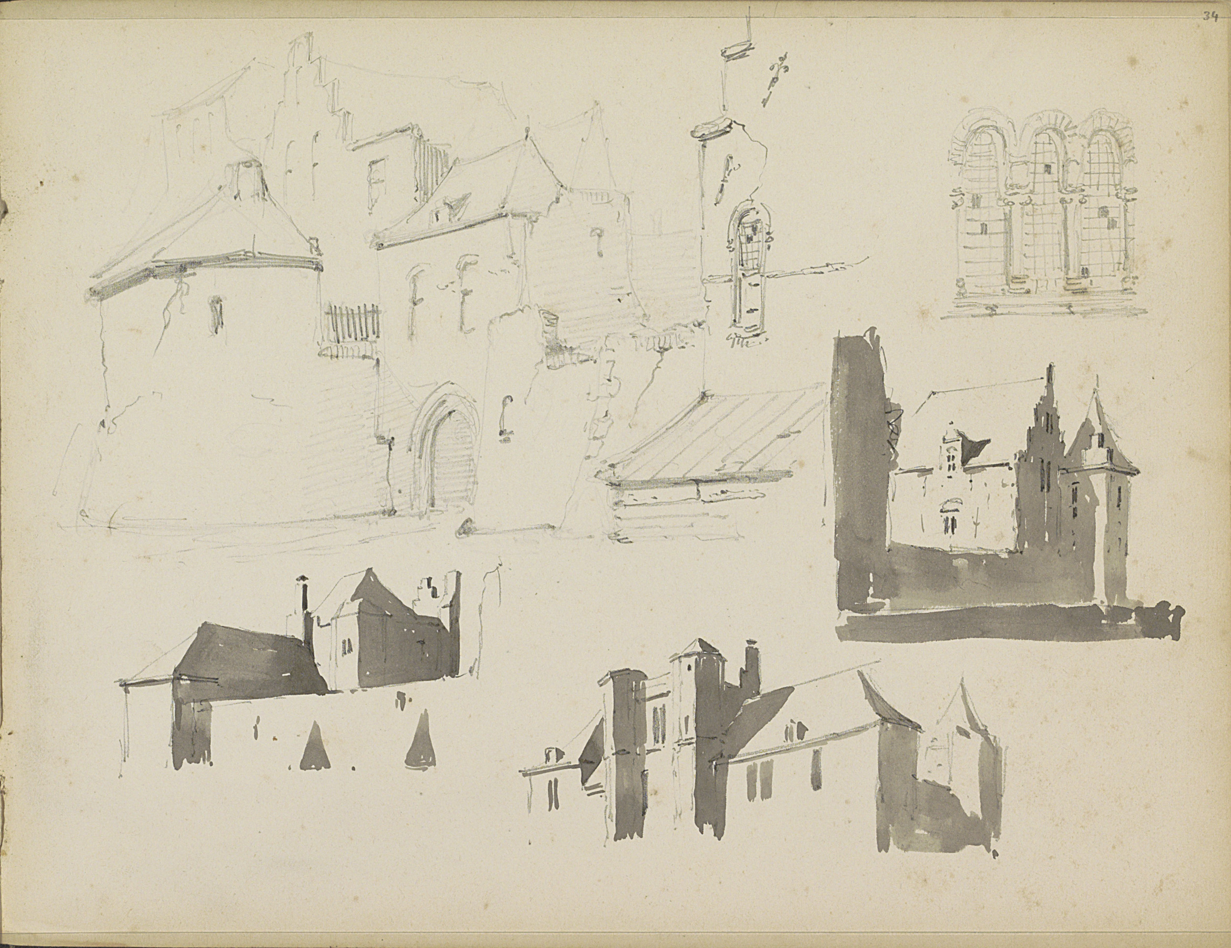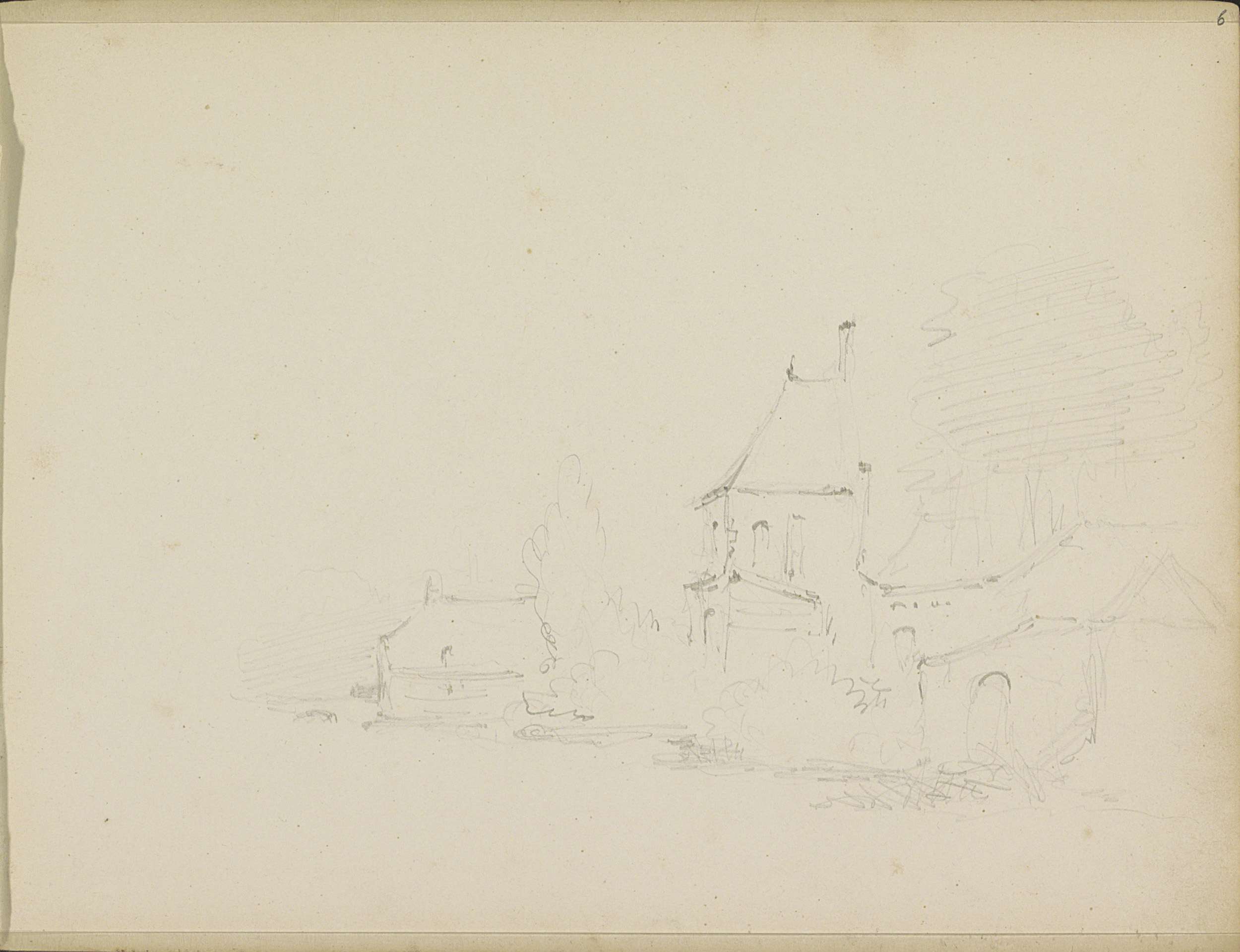 Studieblad met gebouwen en een stadsgezicht