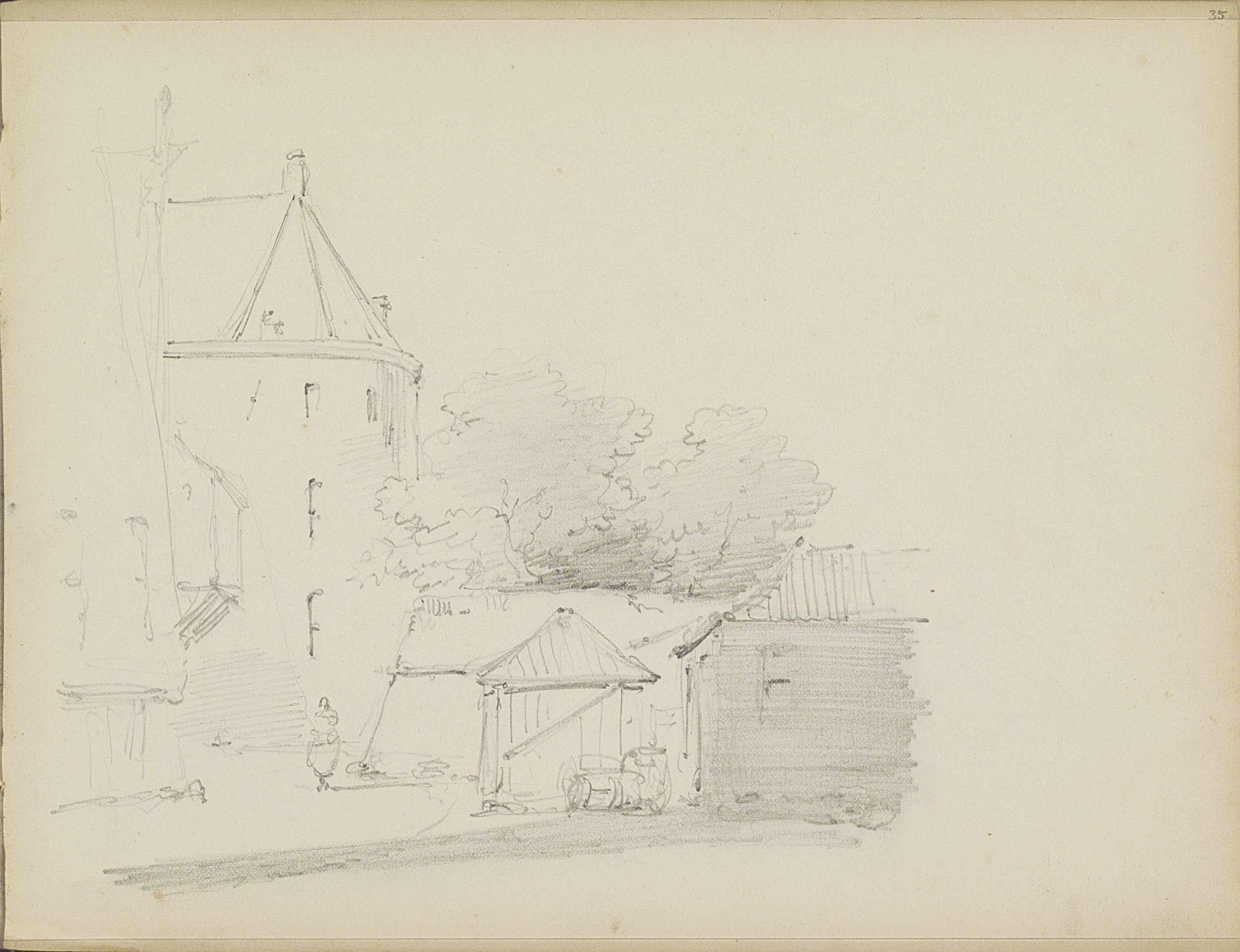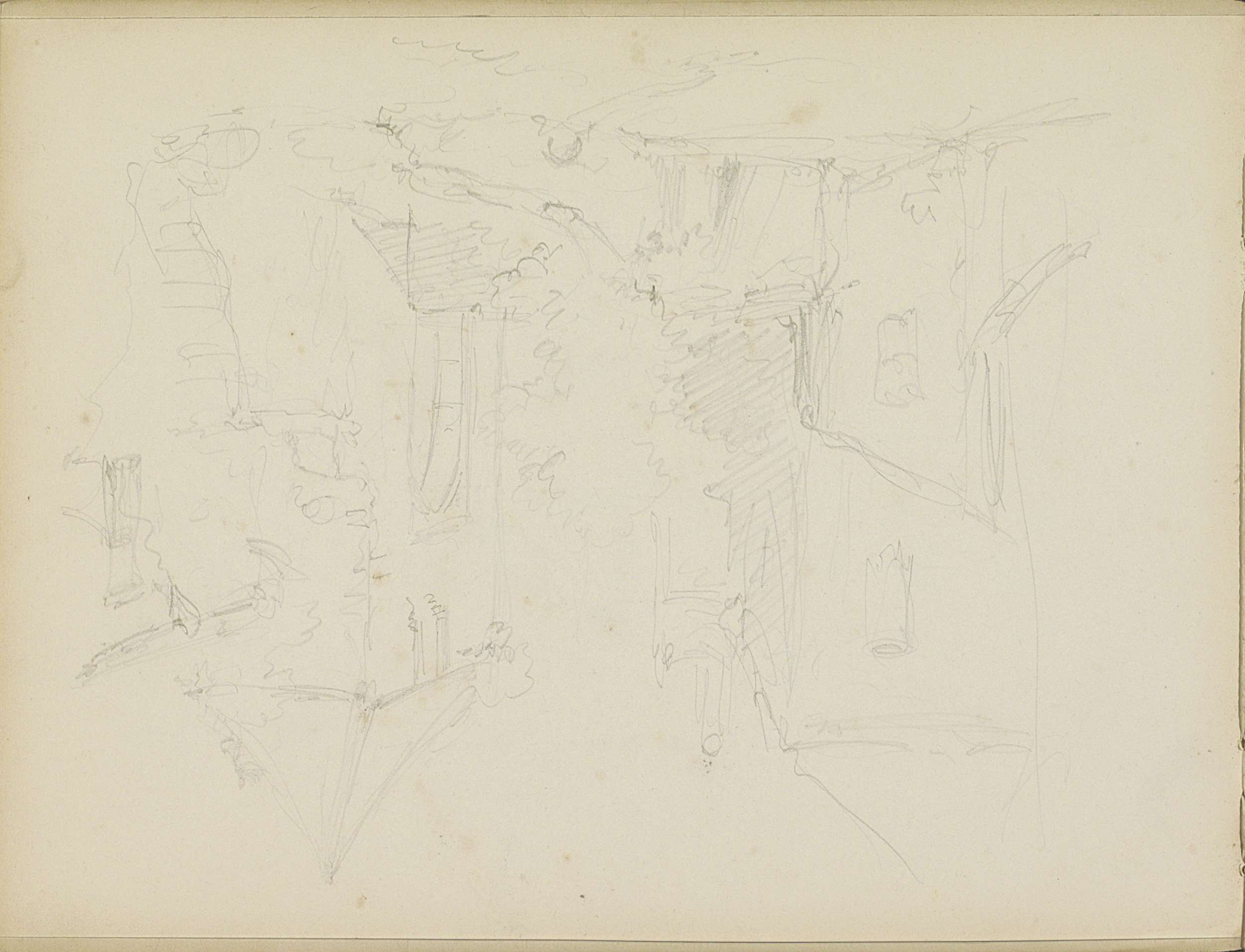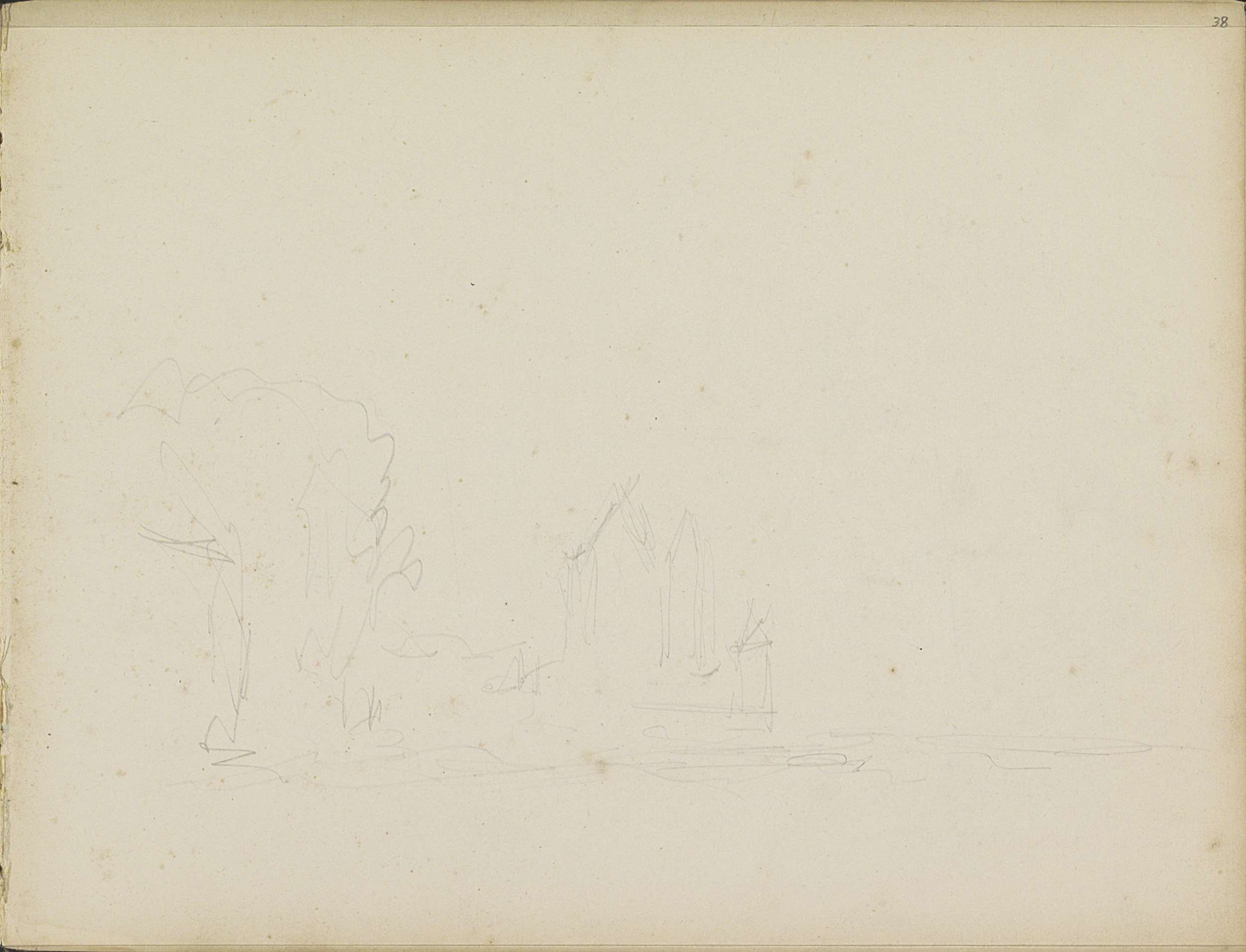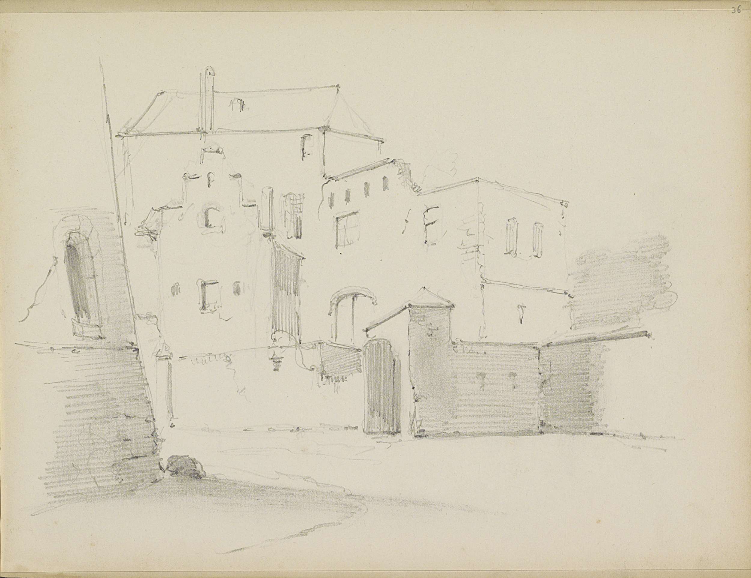 Studieblad met gebouwen en een stadsgezicht