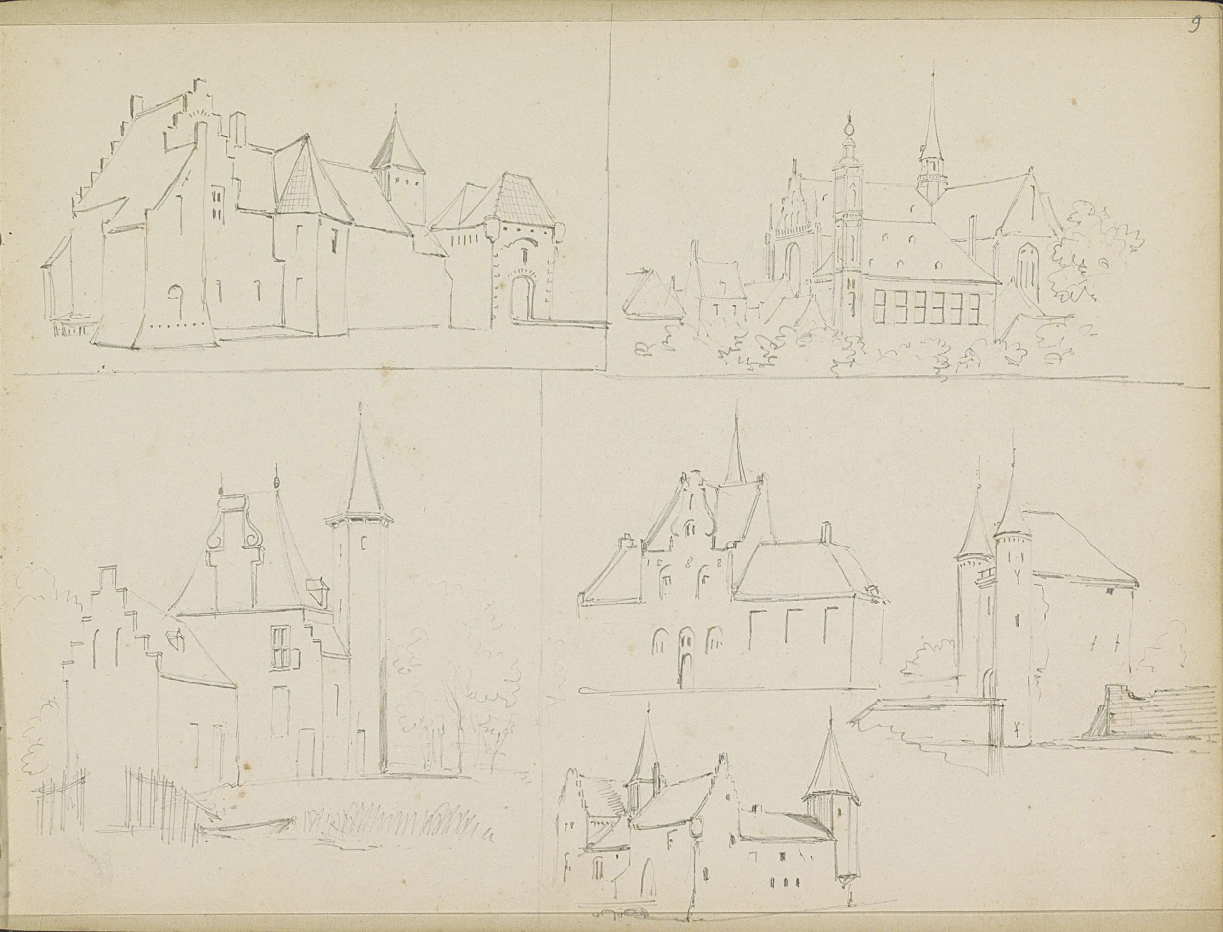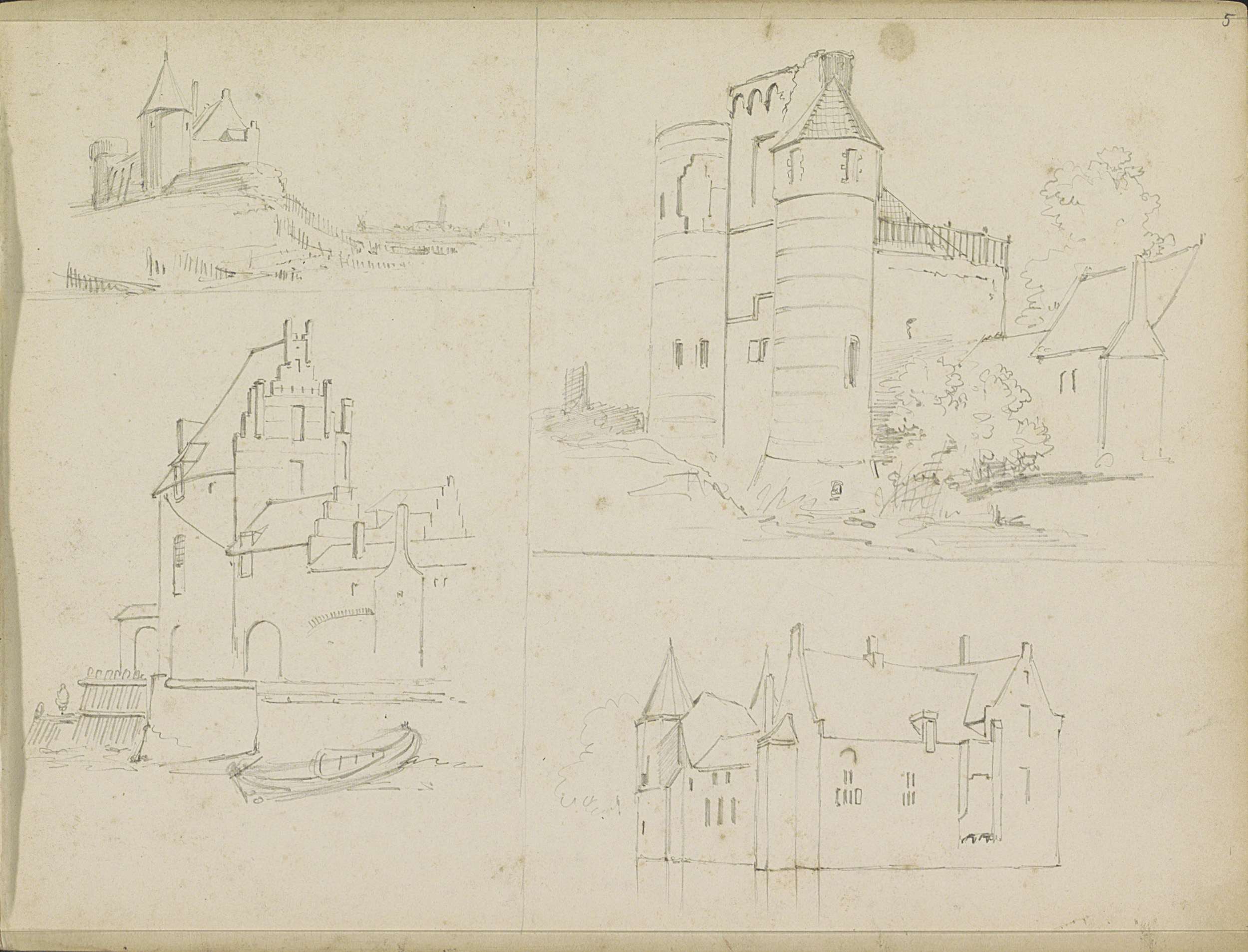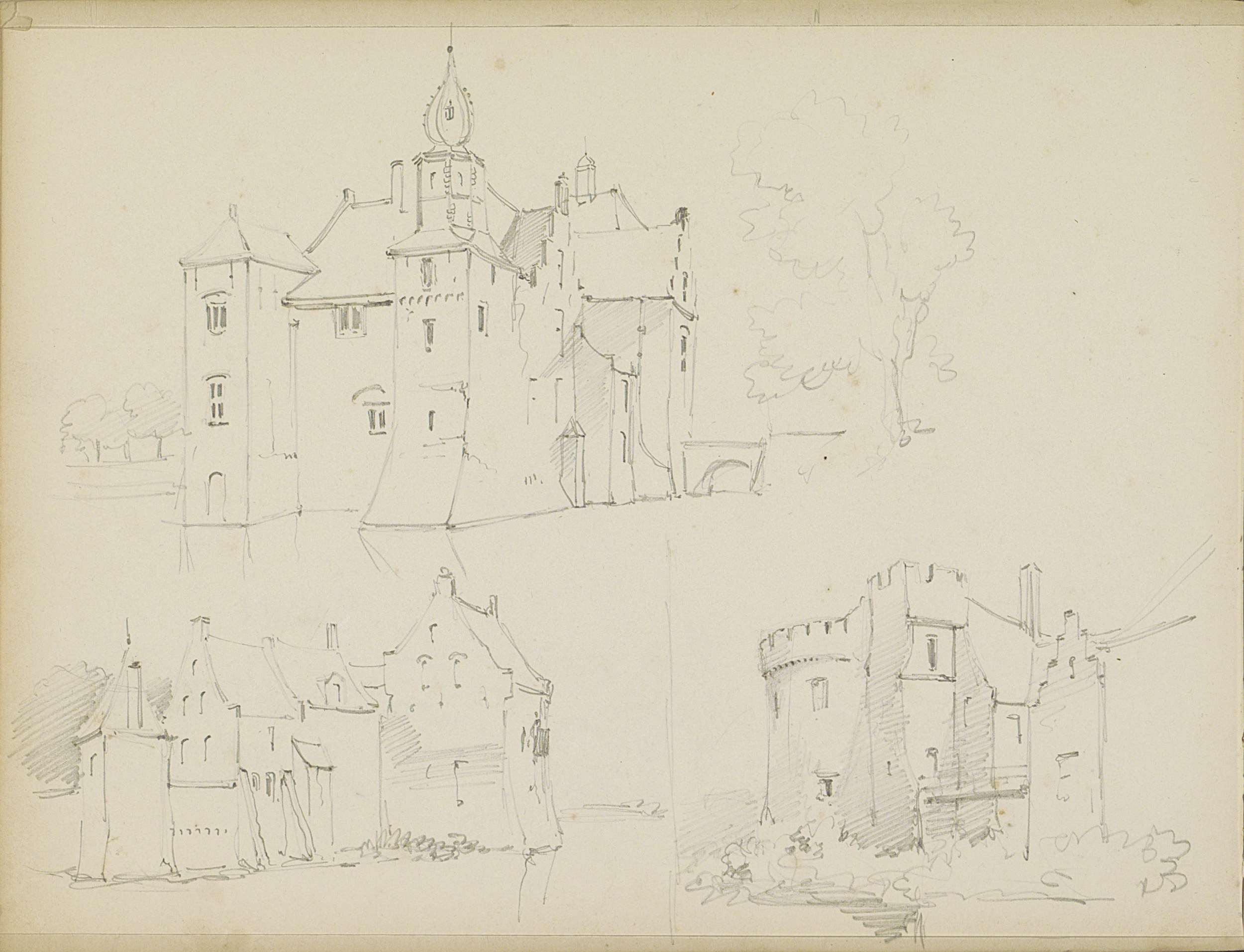Studieblad met versterkte gebouwen, mogelijk kastelen