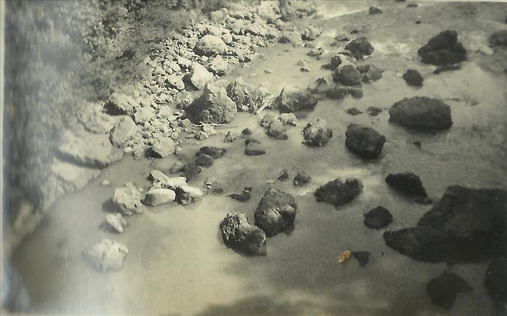 Nederlands Indië; rivier, rotsblok