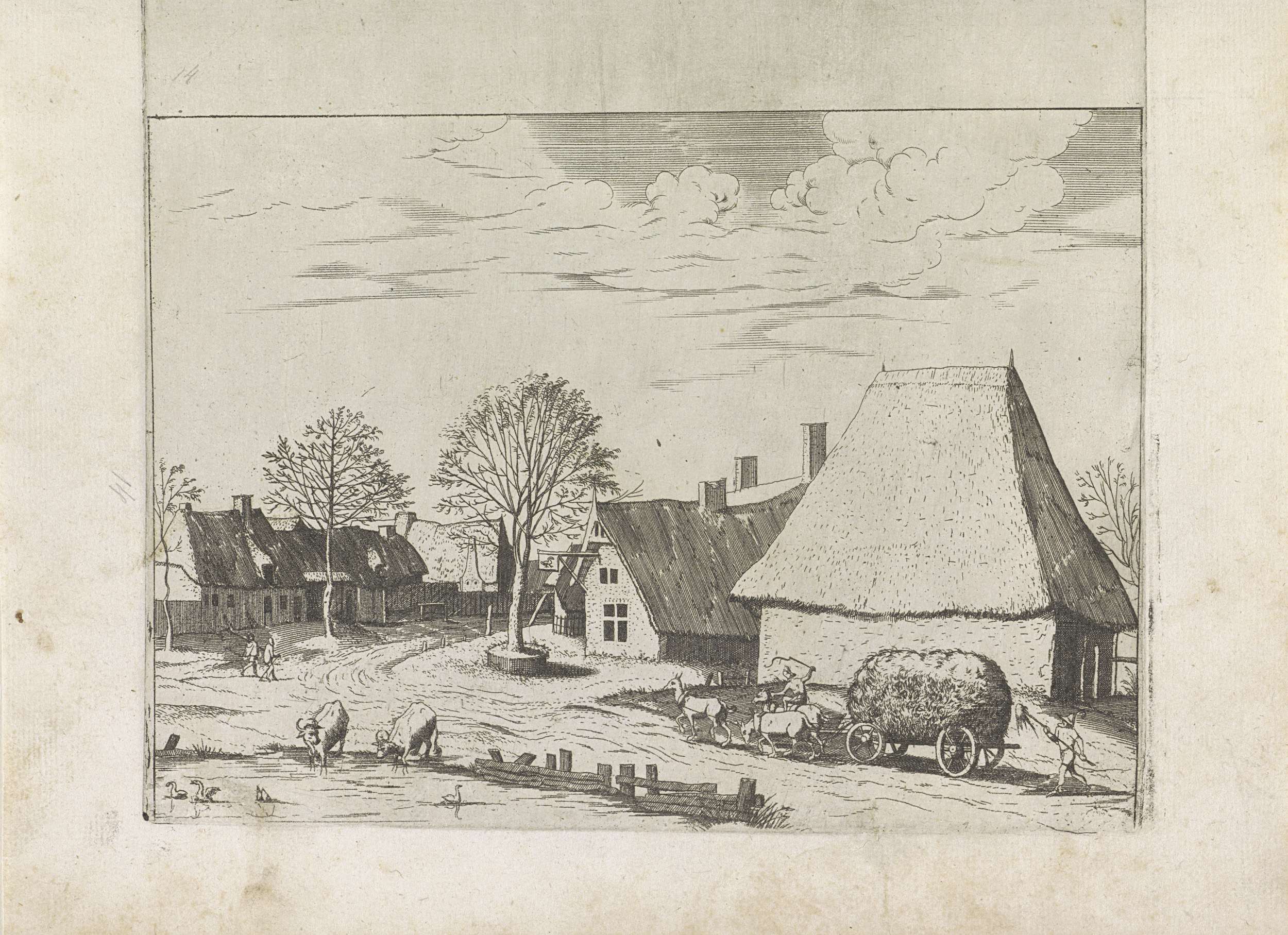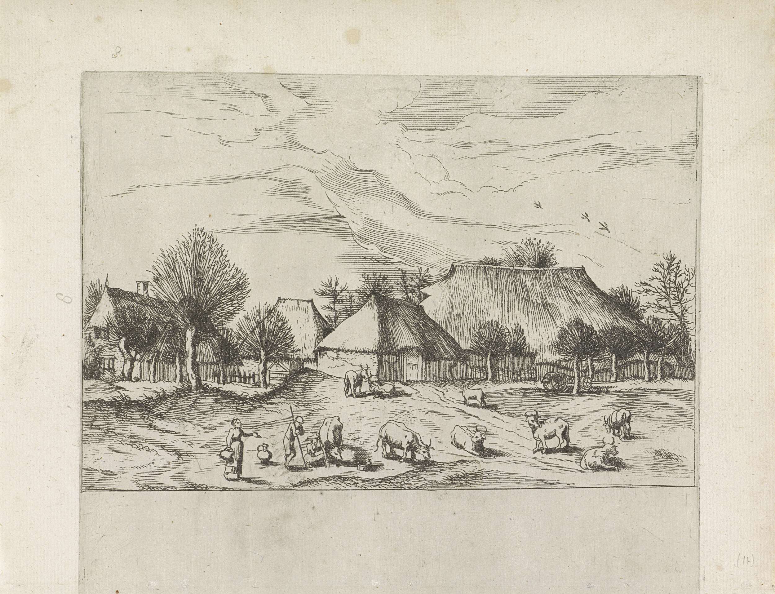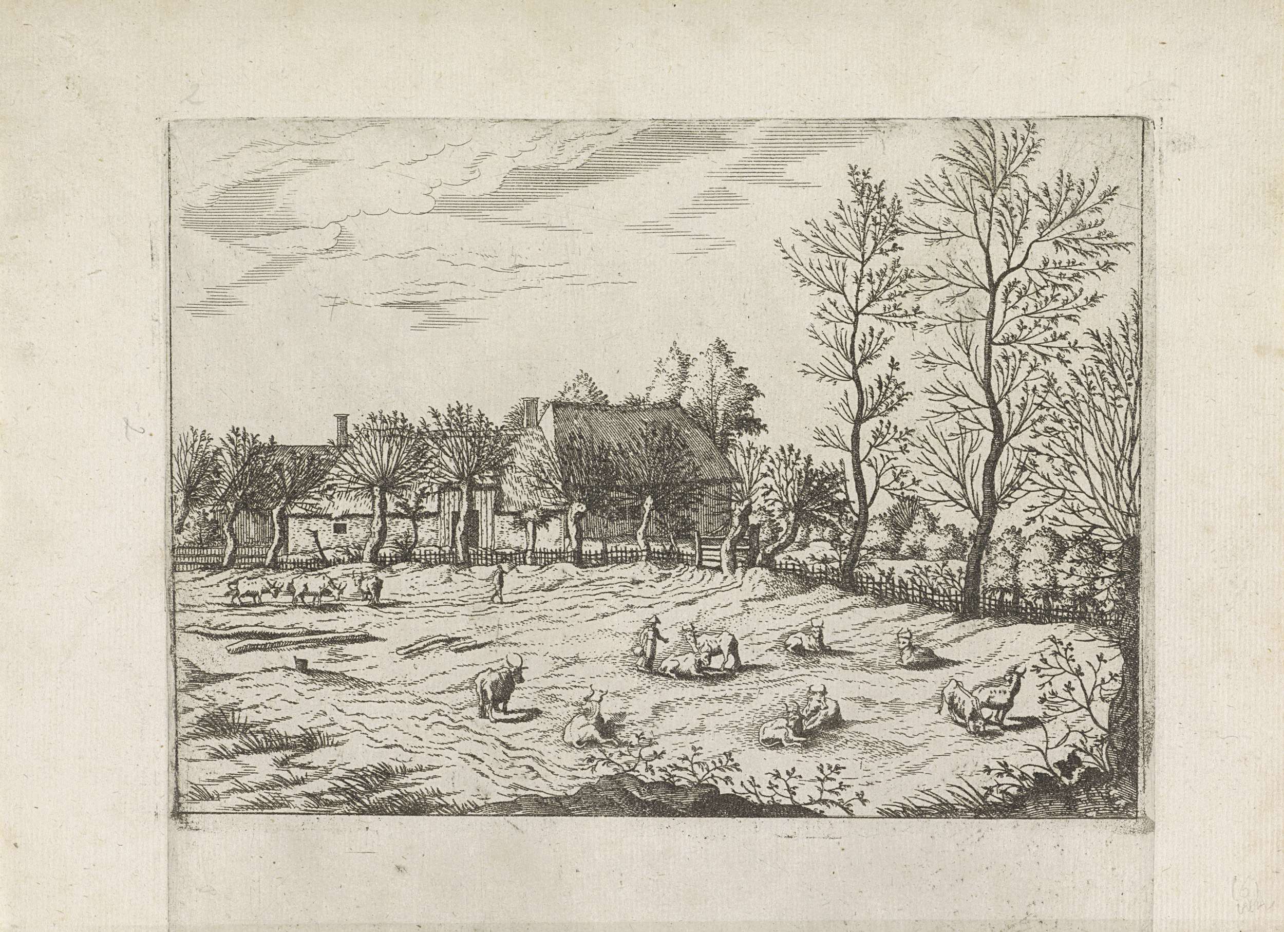 Landschap met boerderijen, vee en mensen