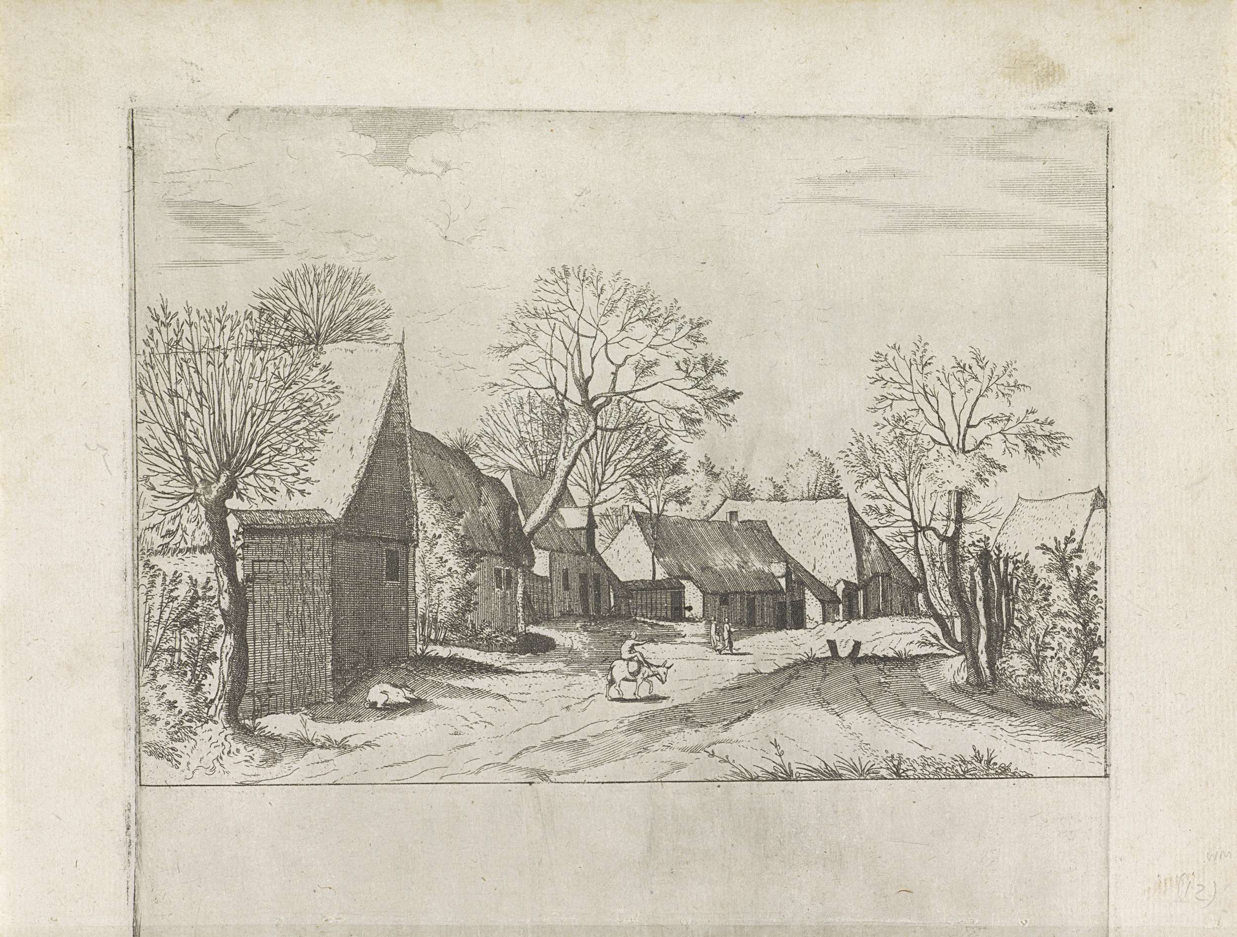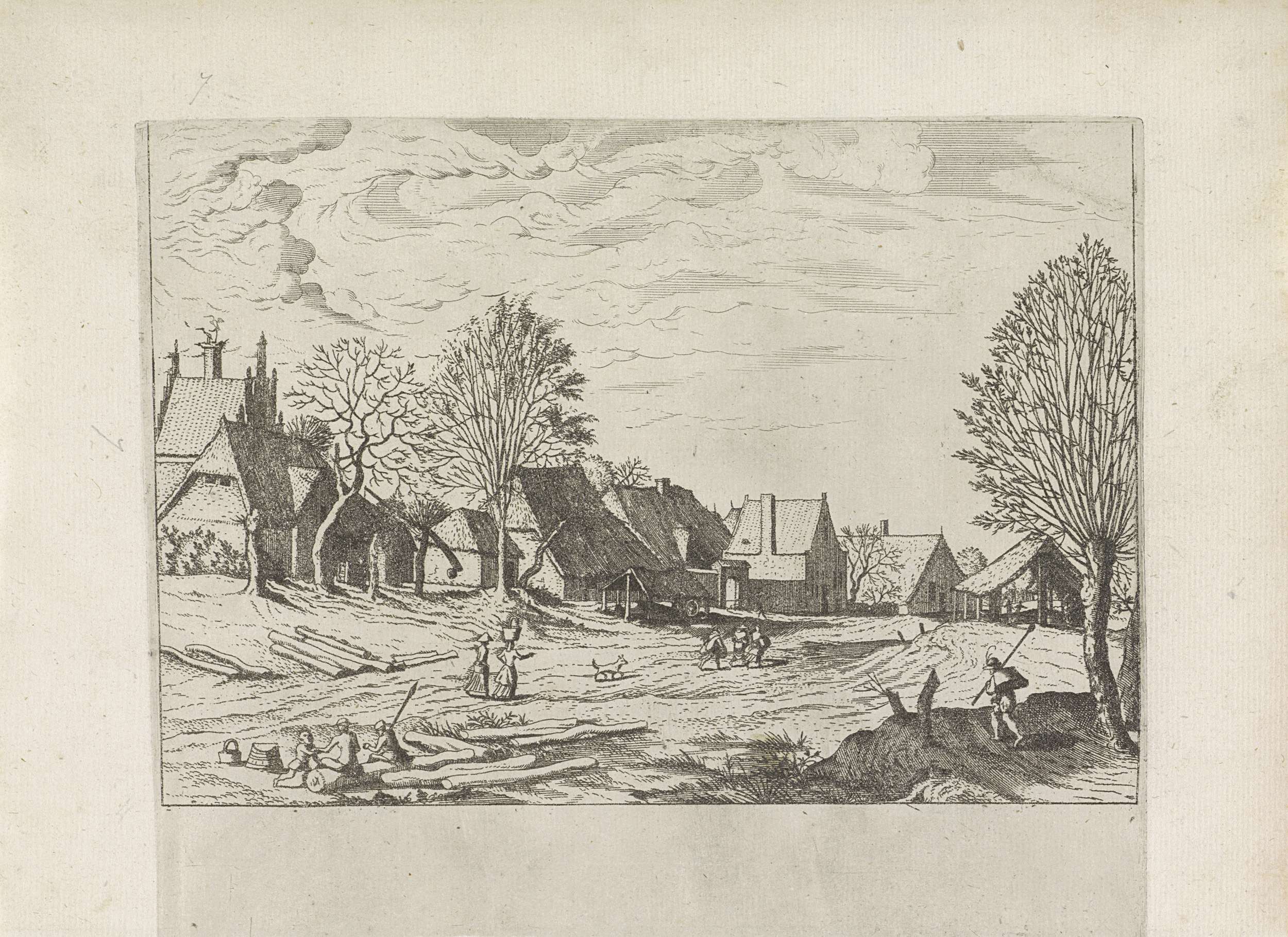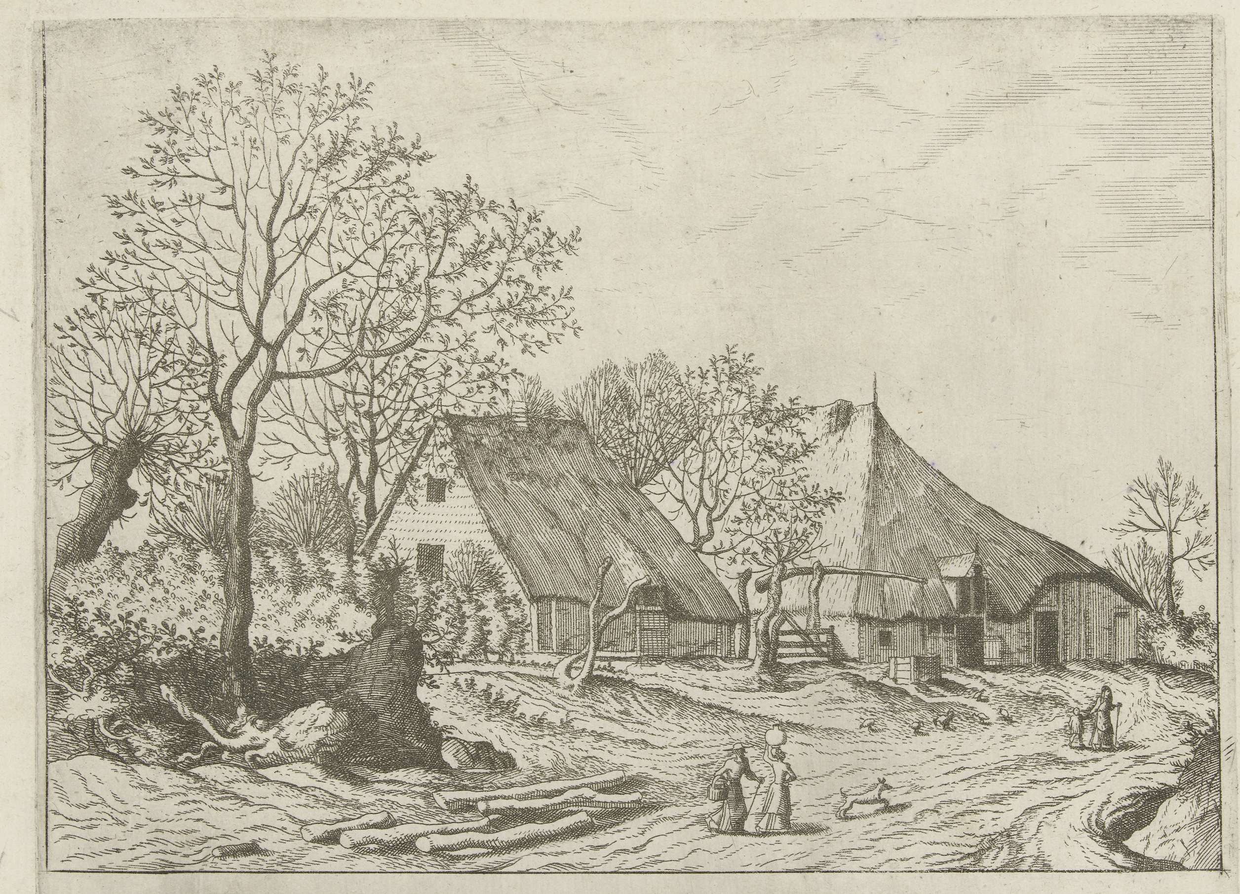 Landschap met boerderijen, vee en mensen