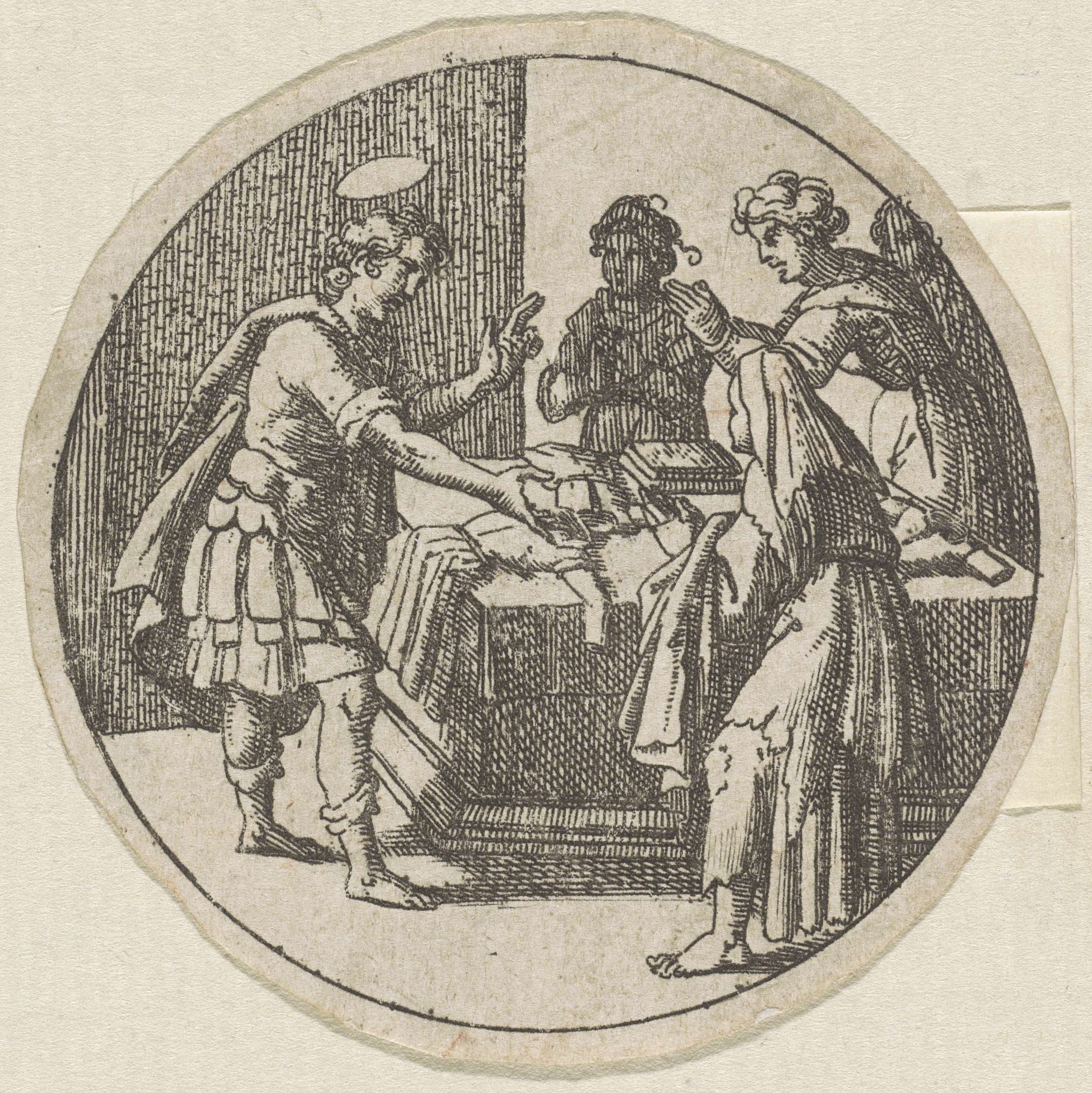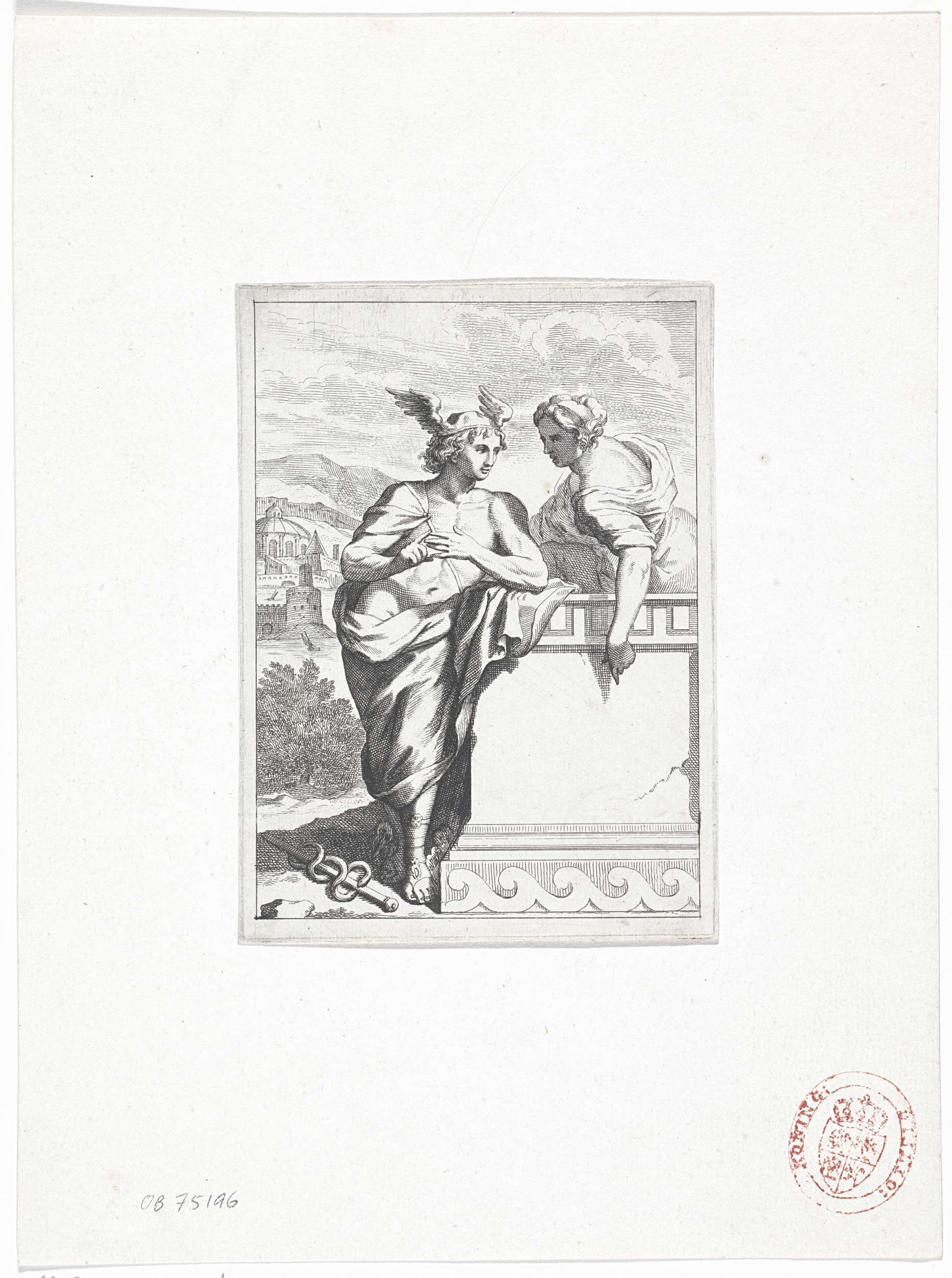 Mercurius met een vrouw bij een piëdestal
