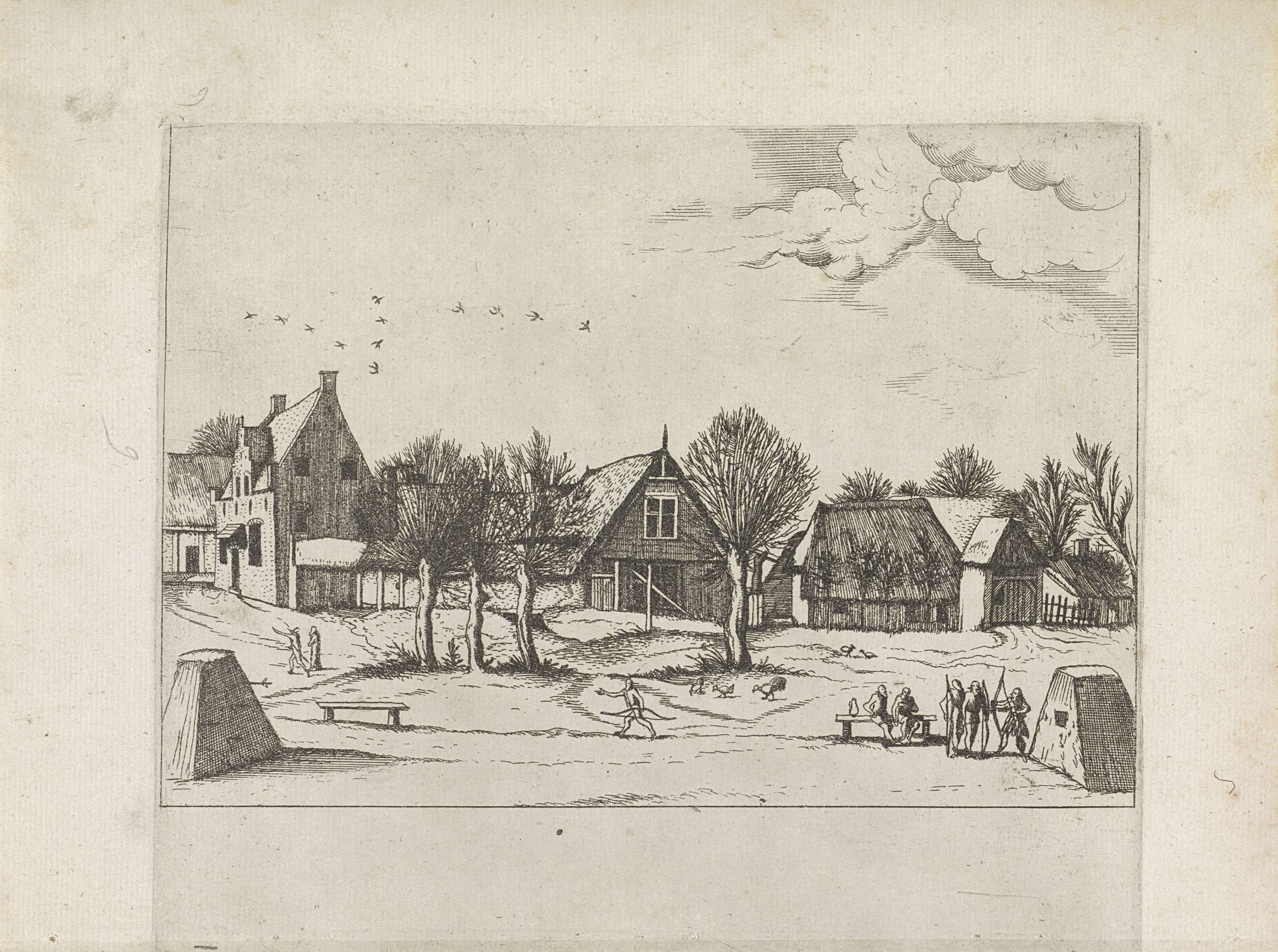 Gezicht op een dorp met boogschutters
