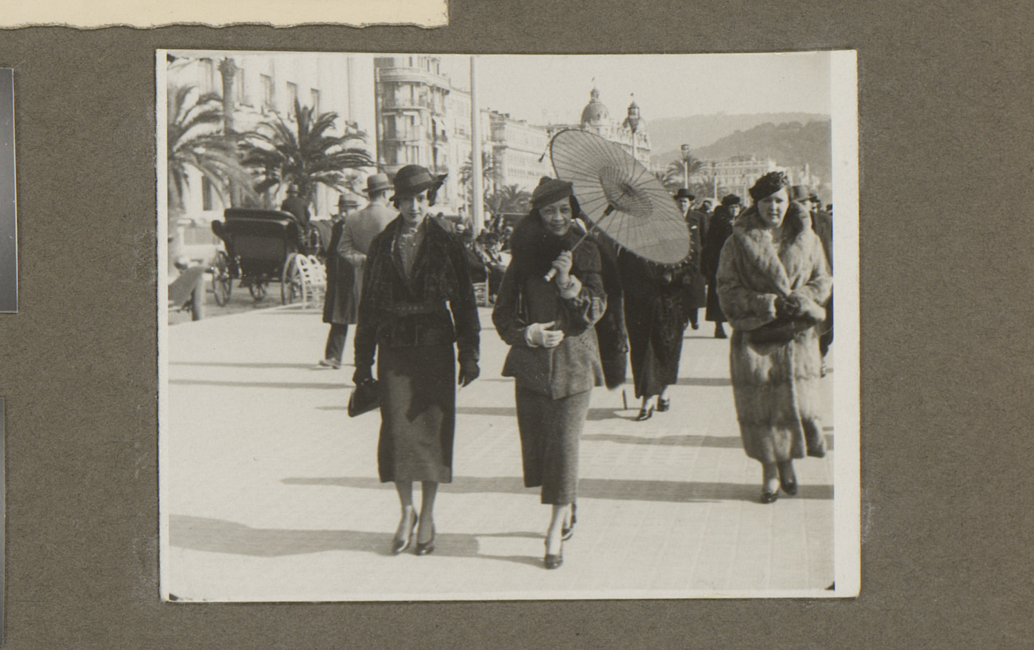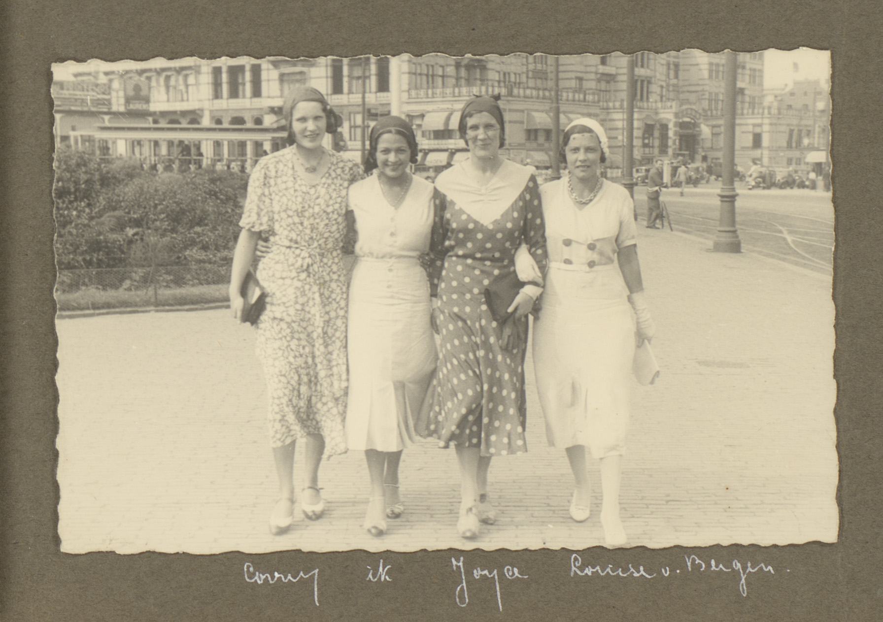 Groepsportret van vier vrouwen, lopend in Scheveningen