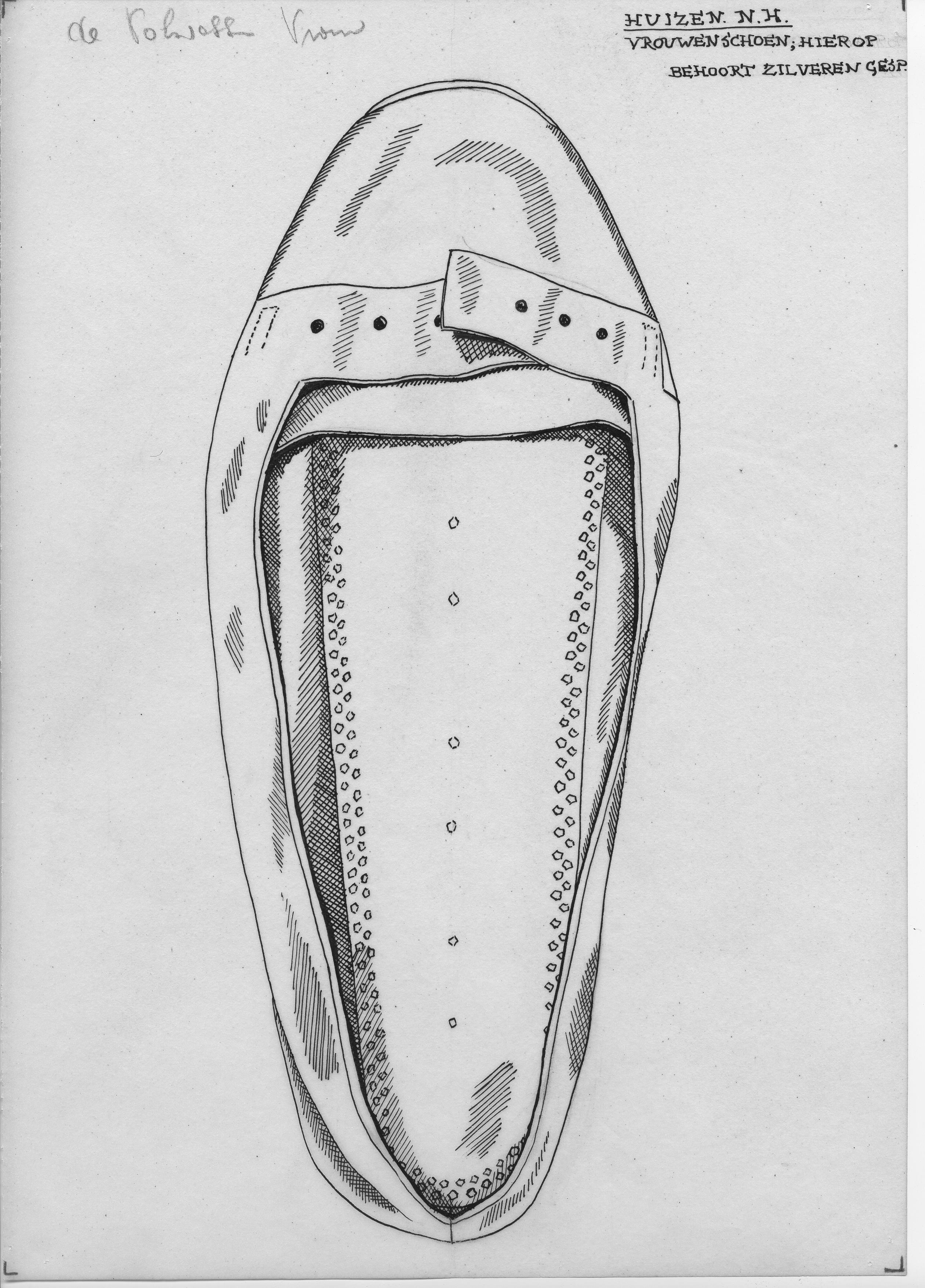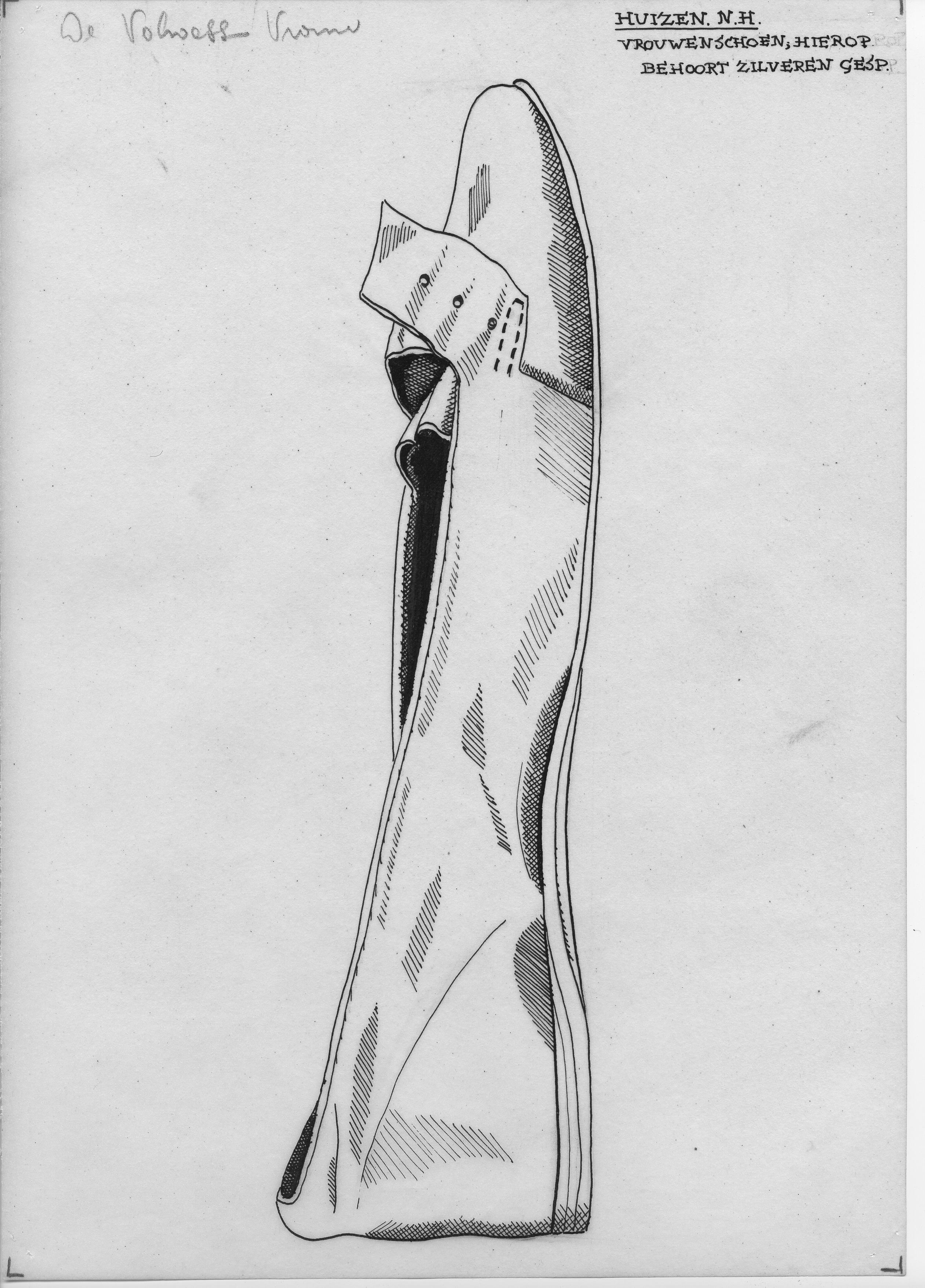 Tekening van een vrouwenschoen of 'schuitje', Huizen...