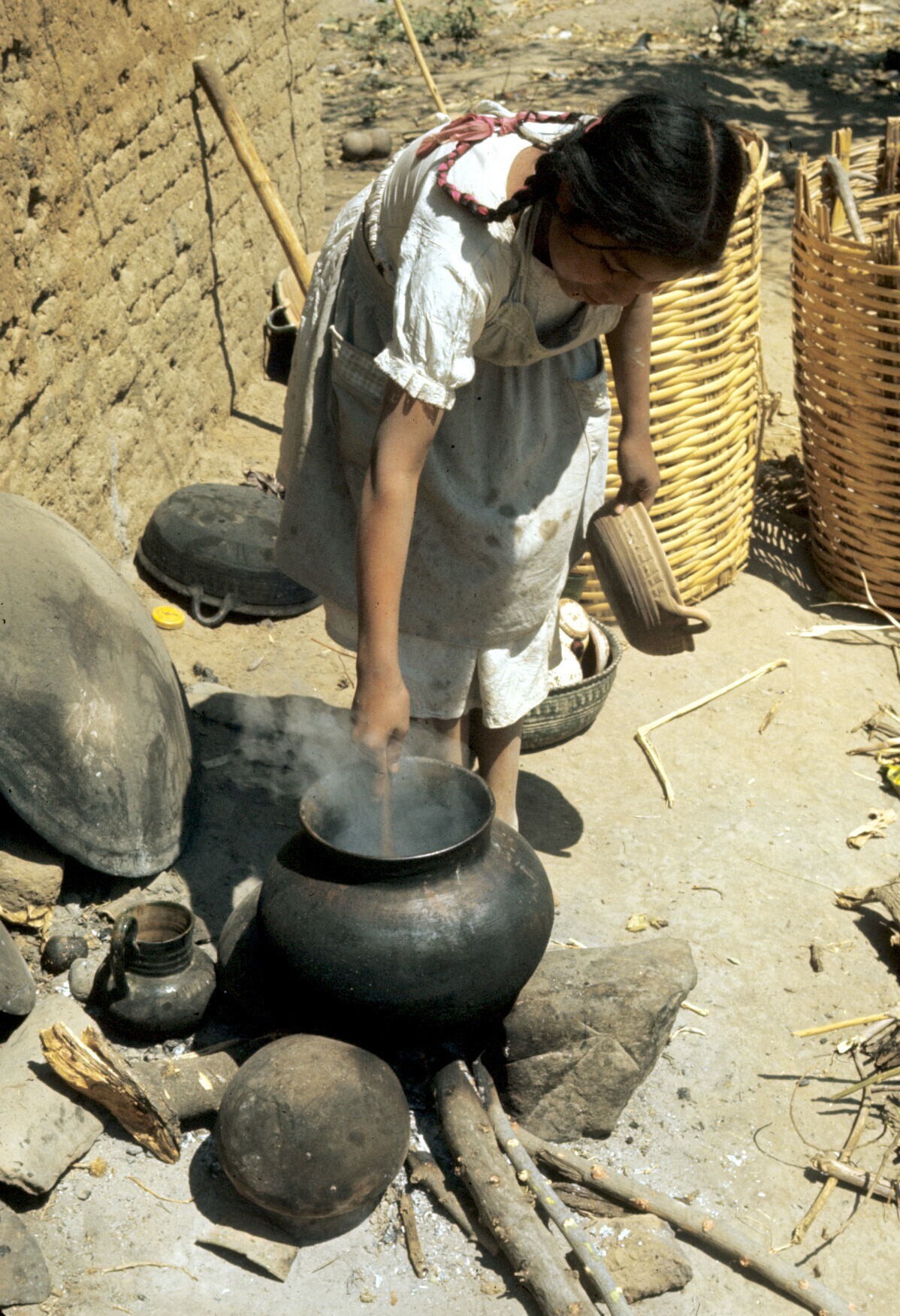 meisje, eten kokend in "olla" (pot) van zwart Coyote...