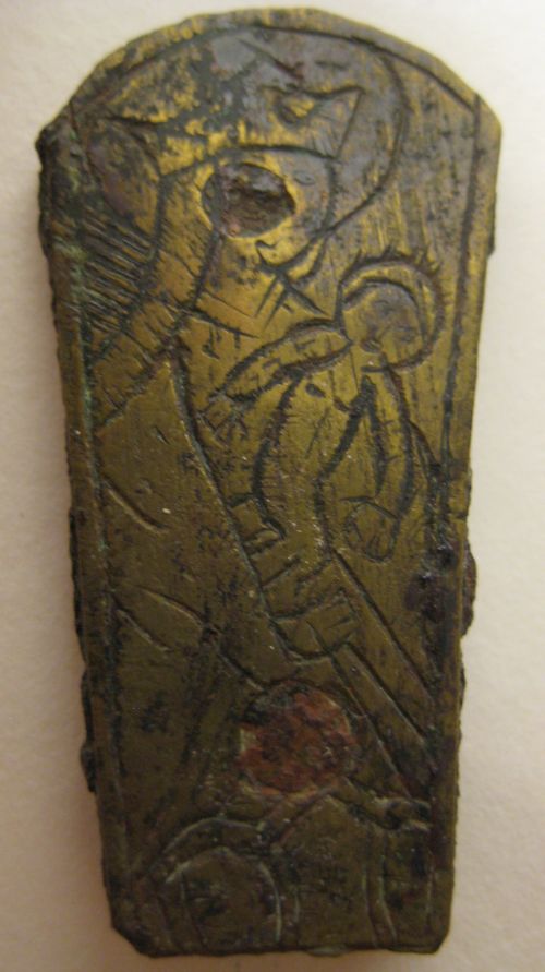 Mesheftbeslag met gegraveerde afbeelding van Maria m...
