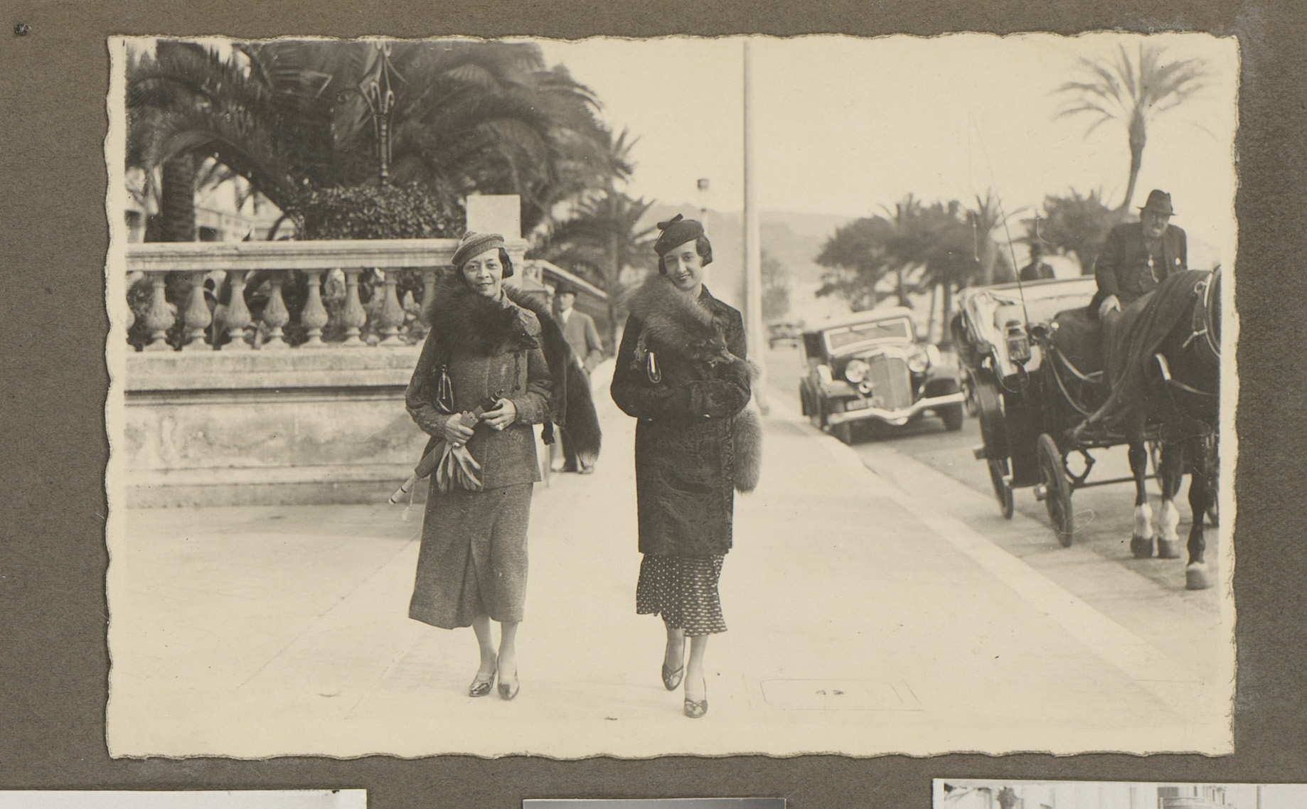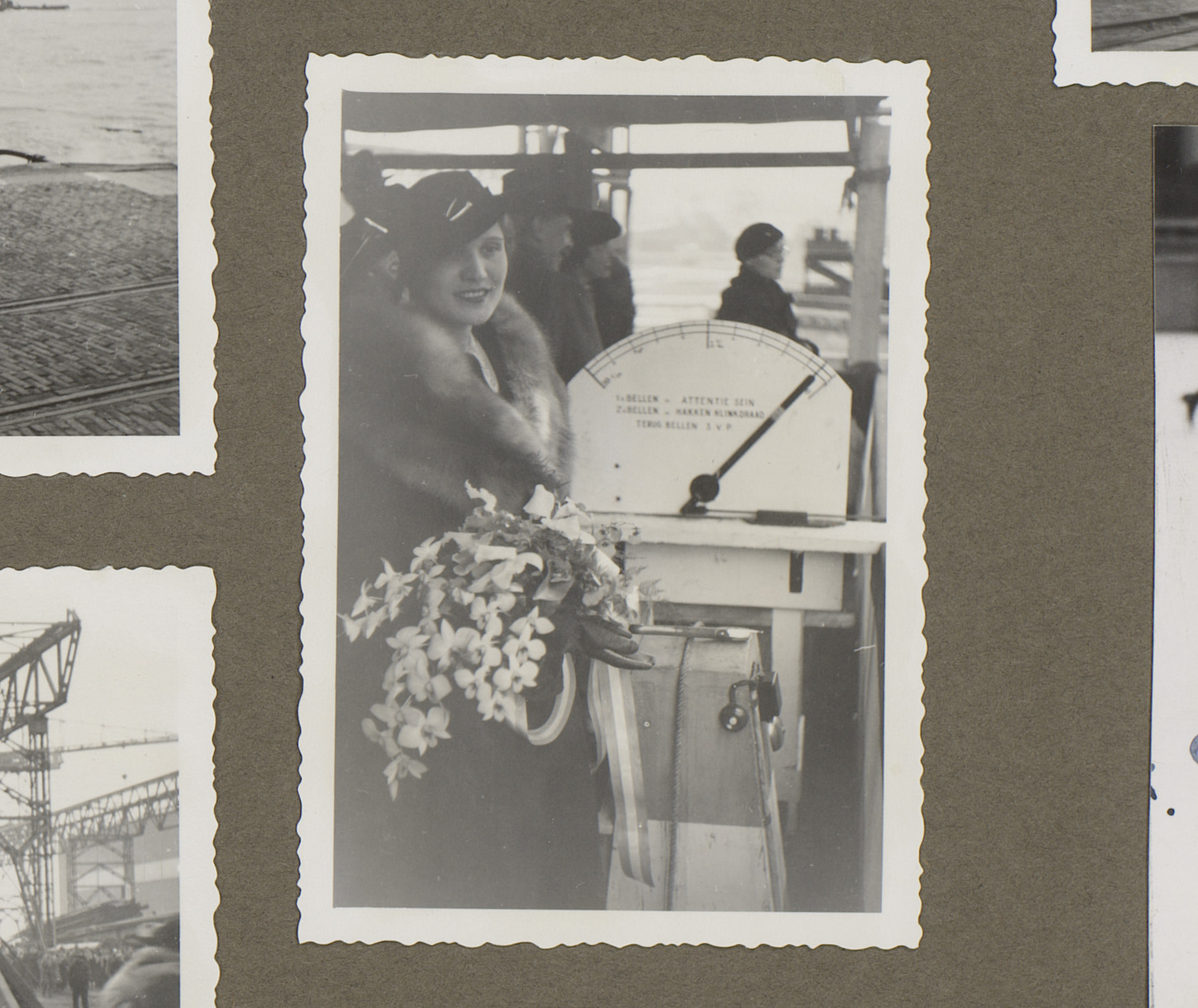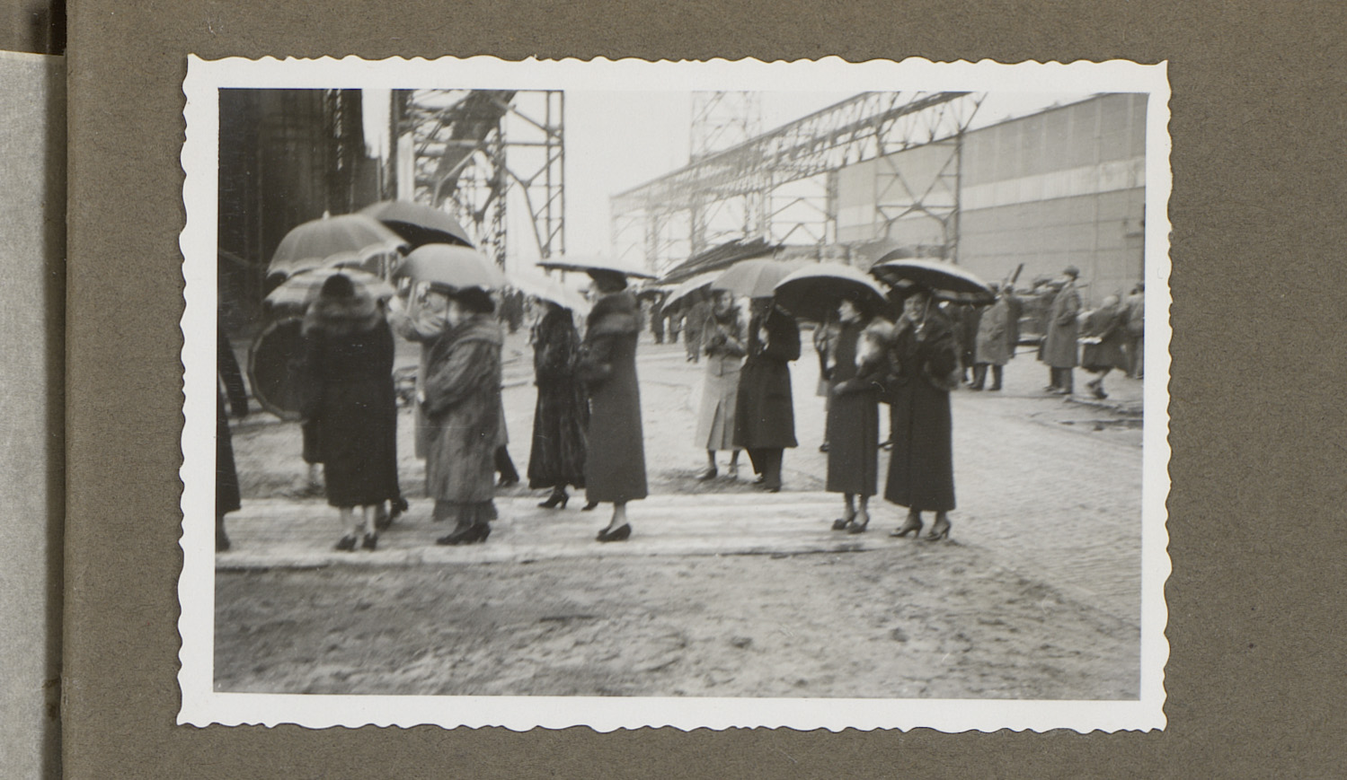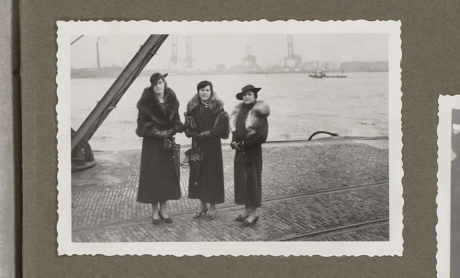 Drie vrouwen in bontjassen in de haven, Rotterdam