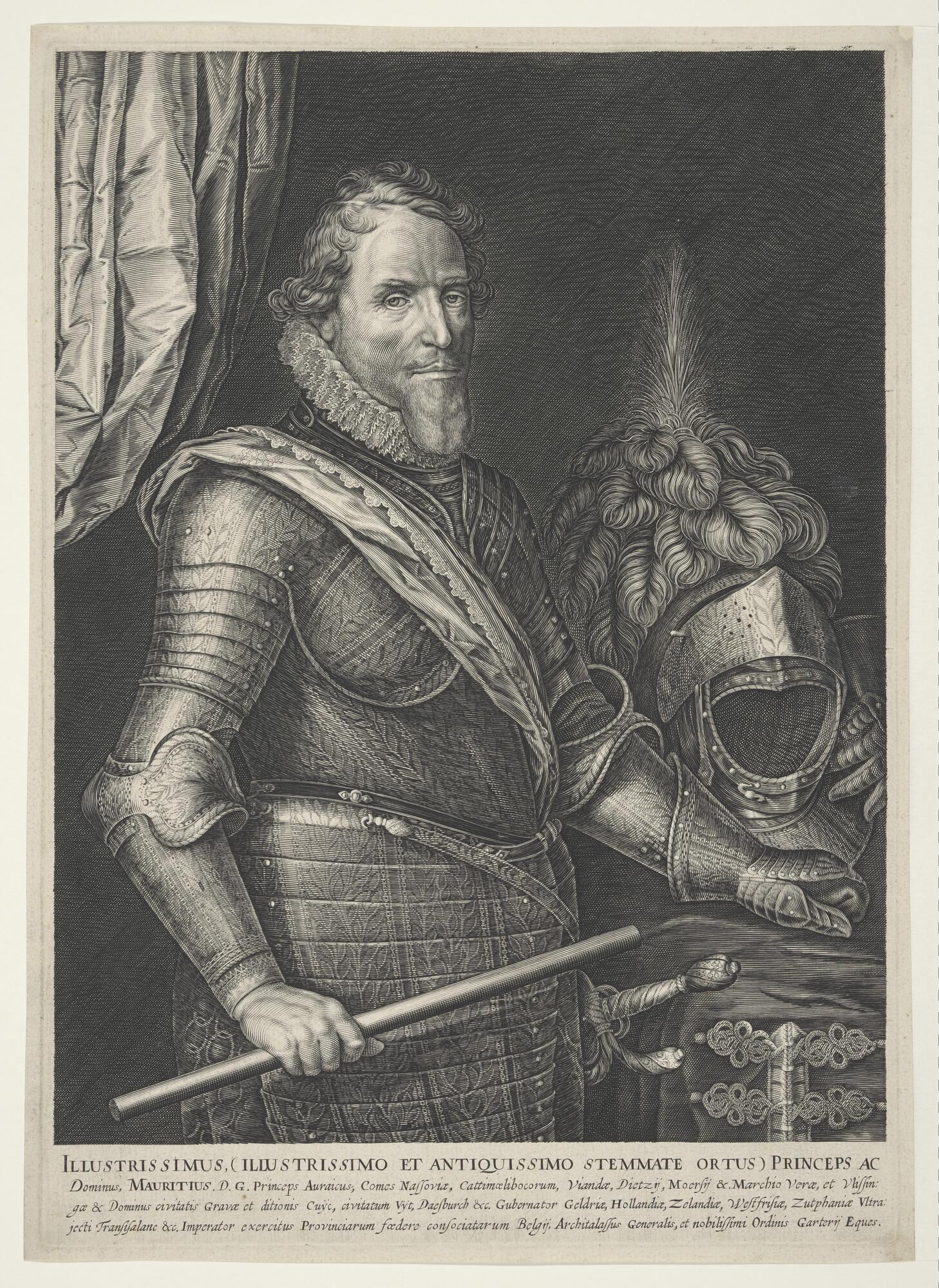 Portret van Maurits, als stadhouder, geharnast met d...