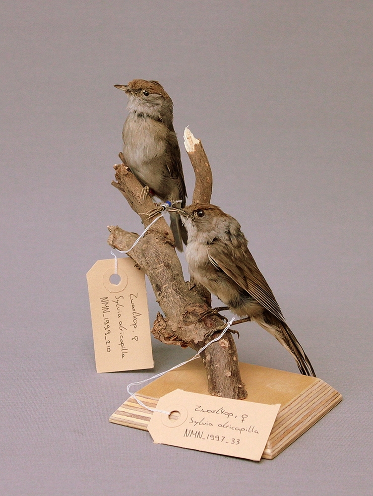 Zwartkop; twee zwartkoppen op voetstuk