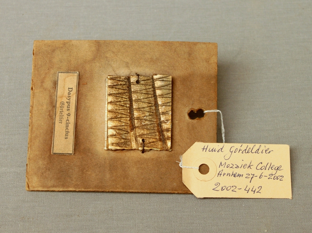 Negenbandgordeldier; deel van huid; op plank gemonteerd
