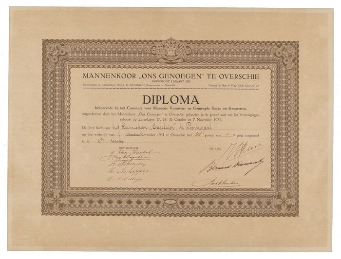 Diploma, uitgereikt door Mannenkoor "Ons Genoegen" t...