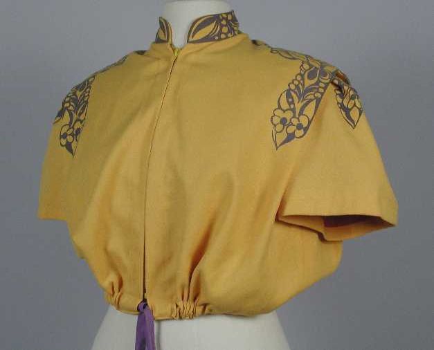 Kort jasje van gele keper met lavelkleurige opdruk, ...