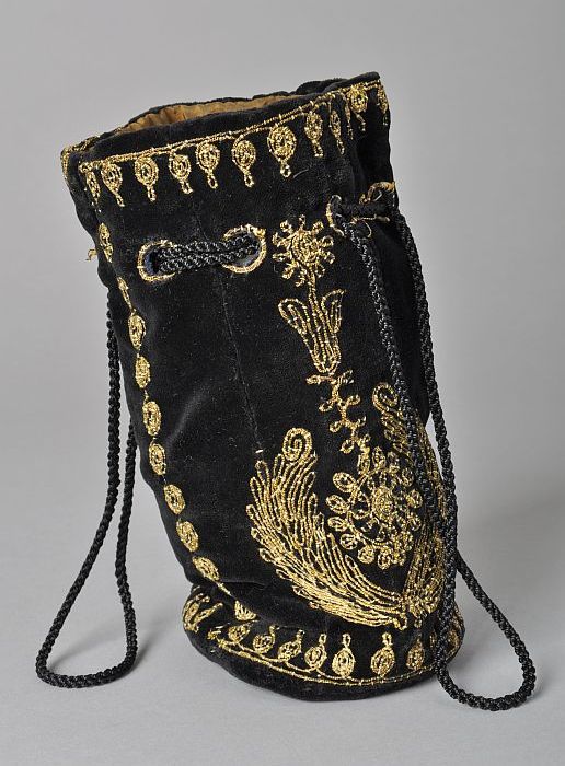 Zwart fluwelen reticule met opgenaaid gouddraad, zwa...